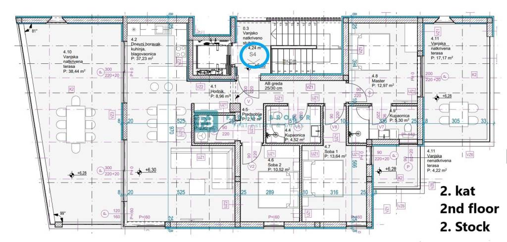 Penthouse S4 is located on the 2nd floor, with a net usable area of 130 m2 and extends across the entire floor. It consists of an entrance hall, hallway, laundry room, bathroom, three bedrooms, of which the master bedroom has its own bathroom and access to a beautiful covered terrace with a view of the sea, and the second bedroom has access to an uncovered terrace with a view of the sea, a comfortable kitchen and dining room, a living room with access to a spacious covered terrace of 38.44 m2 with a wonderful panoramic view of the sea and the city. The apartment has two parking spaces.