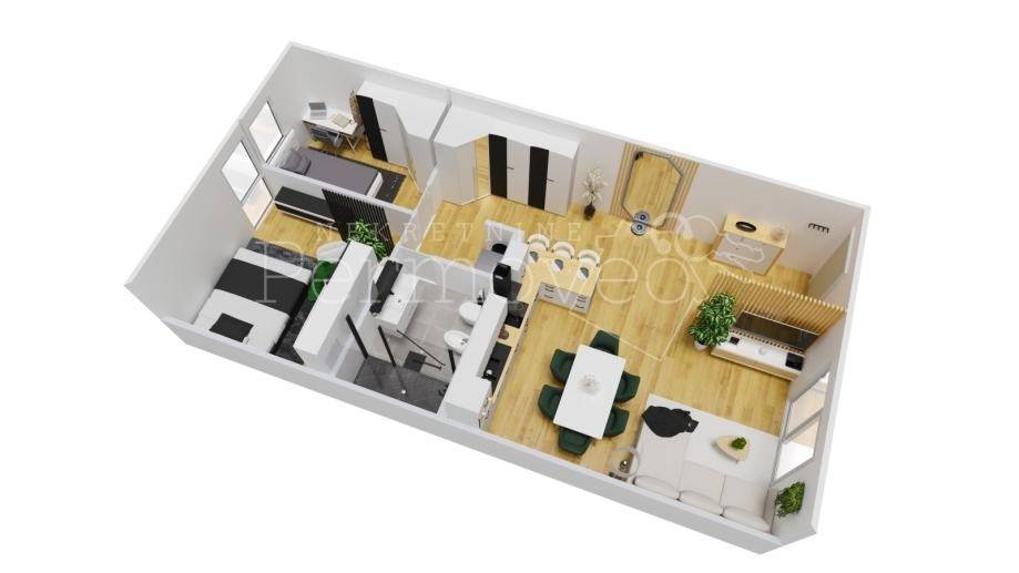Pametno organiziran raspored obuhvaća dvije komforne spavaće sobe, suvremeno uređenu kupaonicu, prostrani dnevni boravak povezan s kuhinjom i blagovaonicom te lođu idealnu za jutarnju kavu ili opuštanje nakon radnog dana.