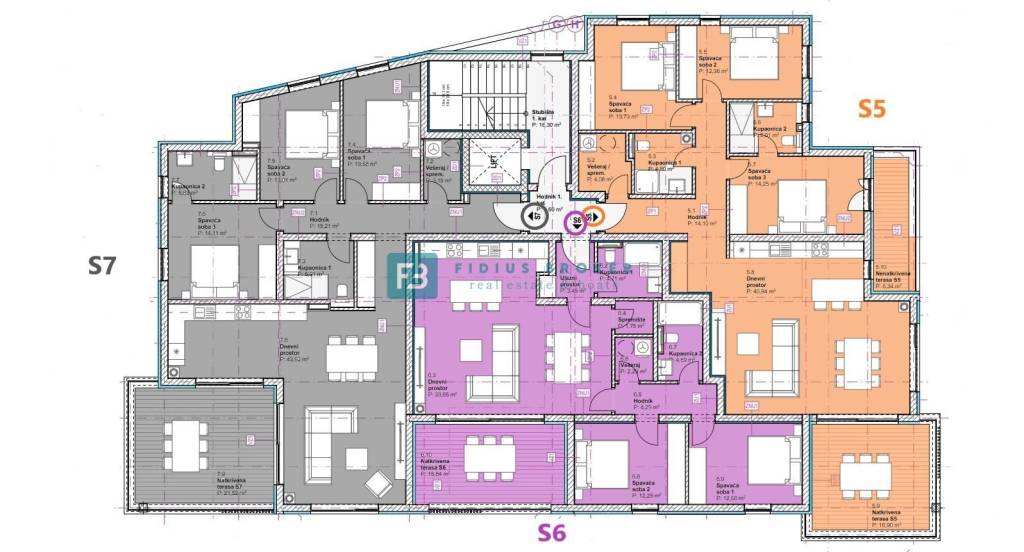 Apartment S7 with a total usable area of ​​125.48 m2 is located on the 1st floor of the building and is oriented to the west. It consists of an entrance hall, laundry/storage room, three bedrooms, hallway, two bathrooms, kitchen with dining room and living area that has access to a spacious covered terrace of 21.52 m2 with a beautiful view of the sea. The apartment has a storage room in the basement and one outdoor parking space.