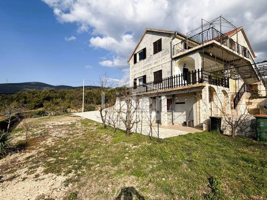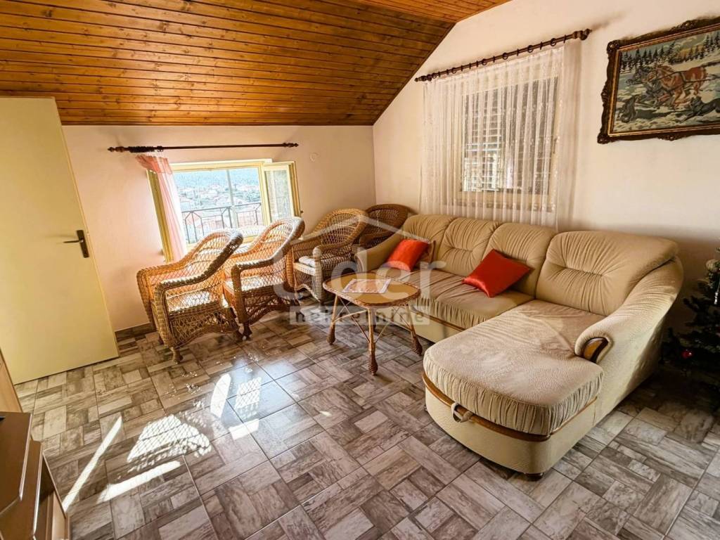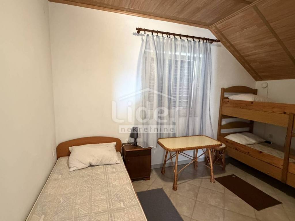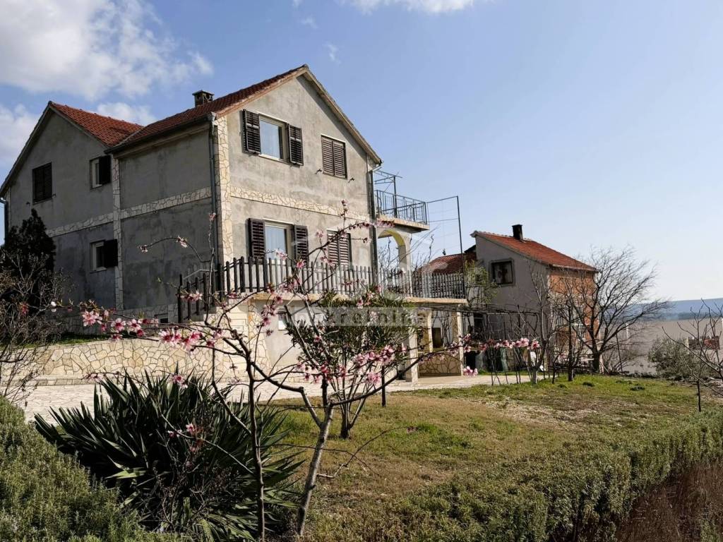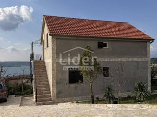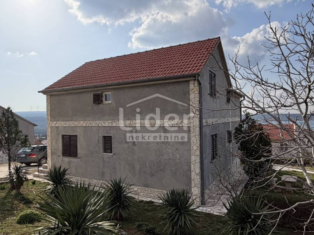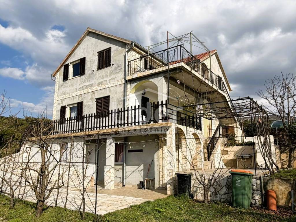 Gornji Karin - detached house with 3 apartments and panoramic sea view for sale. The house consists of three floors (basement, ground floor and first floor). Each floor has a separate entrance and its own storage room. In the basement there is an apartment consisting of two rooms and a bathroom. On the high ground floor there is an apartment consisting of two bedrooms, a living room with a kitchen, a bathroom, a hallway and a large terrace. In the high attic there is an apartment consisting of two bedrooms, a living room with a kitchen, a bathroom, a hallway and a large terrace. The house has a large garden, with plenty of parking... Possible construction of a swimming pool...