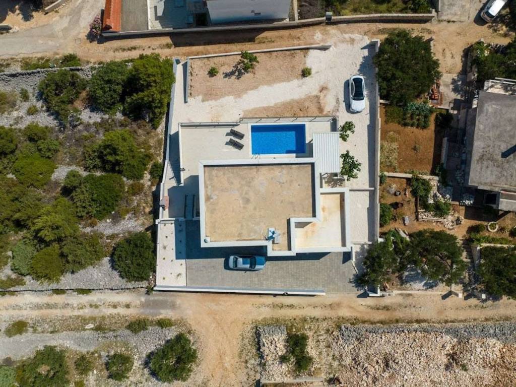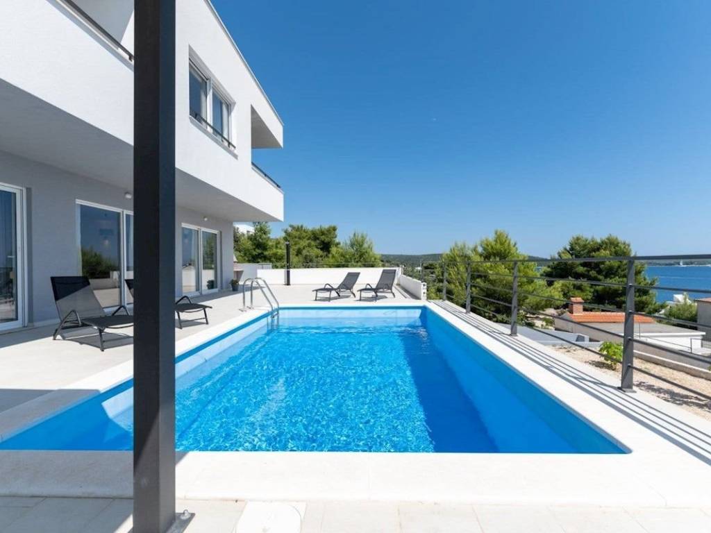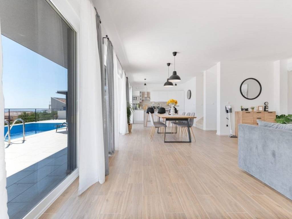 The villa consists of two residential levels with a total of approximately 200 m² of living space. The ground floor features a garage, a large living room with a kitchen and dining area, a bathroom, a large terrace with a pool and sunbathing area, as well as parking.