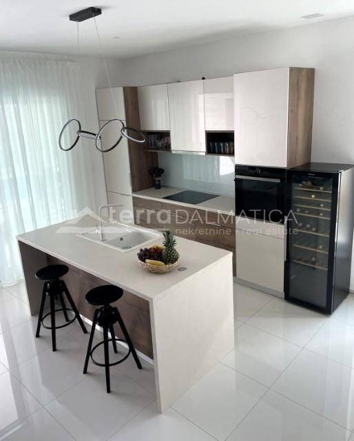 In a quiet part of Vodice, surrounded by a Mediterranean atmosphere, this modern villa, built in 2022, is perfectly situated. With its contemporary design and well-thought-out layout, it offers the perfect balance between functionality and comfort, making it an ideal place for living, vacationing, or investment. The spacious interior of 174 m² provides comfortable living with four bedrooms, two of which have en-suite bathrooms, while the remaining two are tailored for family living. In addition to three elegantly designed bathrooms, the villa also features an extra guest toilet. The open-plan living area connects a modern, fully equipped kitchen with the dining room and living room, creating a pleasant atmosphere filled with natural light. Large glass walls open up the space toward the terrace, allowing for a seamless transition between indoor and outdoor areas. In the landscaped yard, there is a 25 m² saltwater swimming pool, perfect for relaxing on warm summer days. Next to the pool, there is a cozy area for socializing with a barbecue, while four parking spaces provide convenience and security. Besides offering pleasant privacy, the villa stands out for its excellent location. It is only 1.6 km from the center of Vodice and beautiful beaches, while the historic town of Šibenik, Krka National Park, and the airports in Zadar and Split are easily reachable with a short drive. The upper rooms offer sea views, and the thoughtful layout provides a sense of spaciousness and connection with nature. This villa offers the perfect blend of contemporary design and the warmth of home, allowing for carefree enjoyment of all the charms of the Mediterranean lifestyle. Whether you are looking for a home for yourself, a vacation spot, or a secure investment, this is the place that offers everything you need for a comfortable and fulfilling stay. Vodice is a popular destination located along the Adriatic coast, known for its beautiful beaches, vibrant tourist life, a