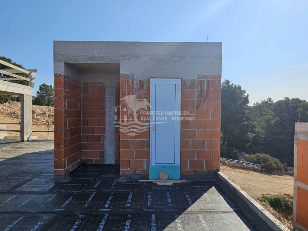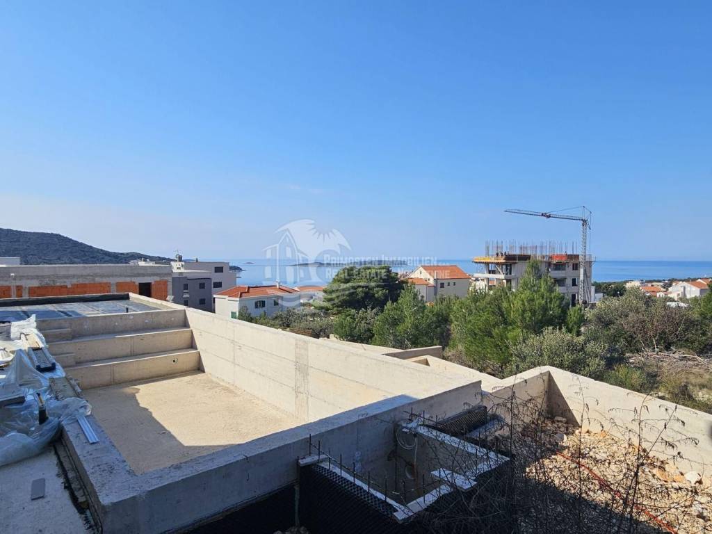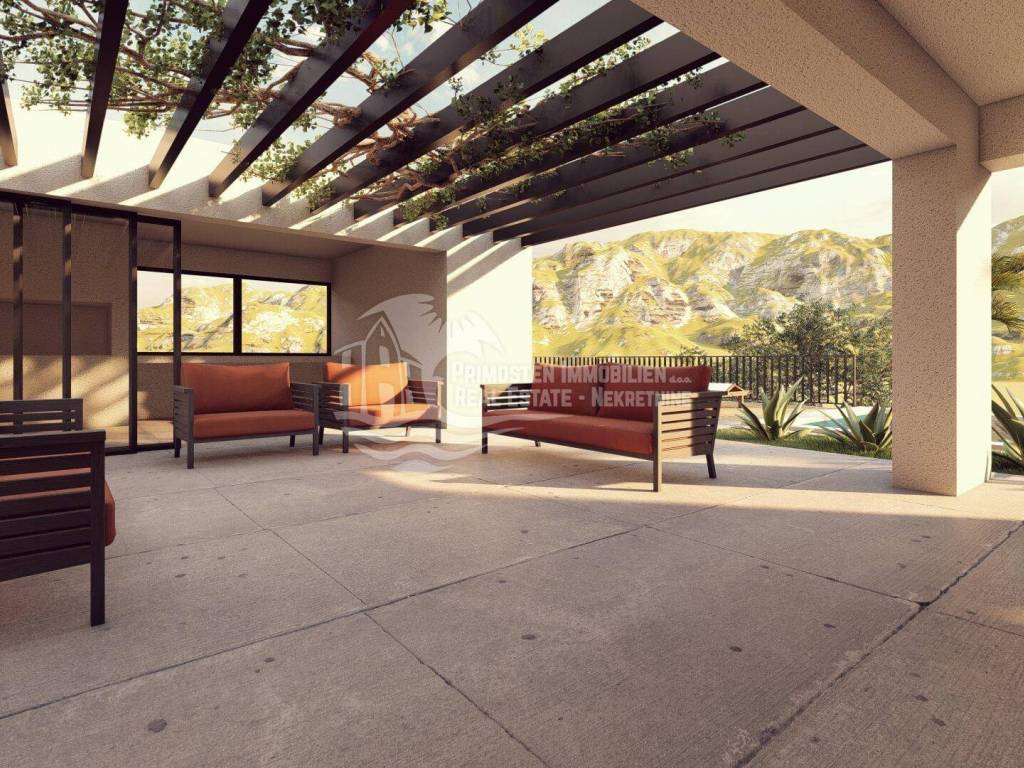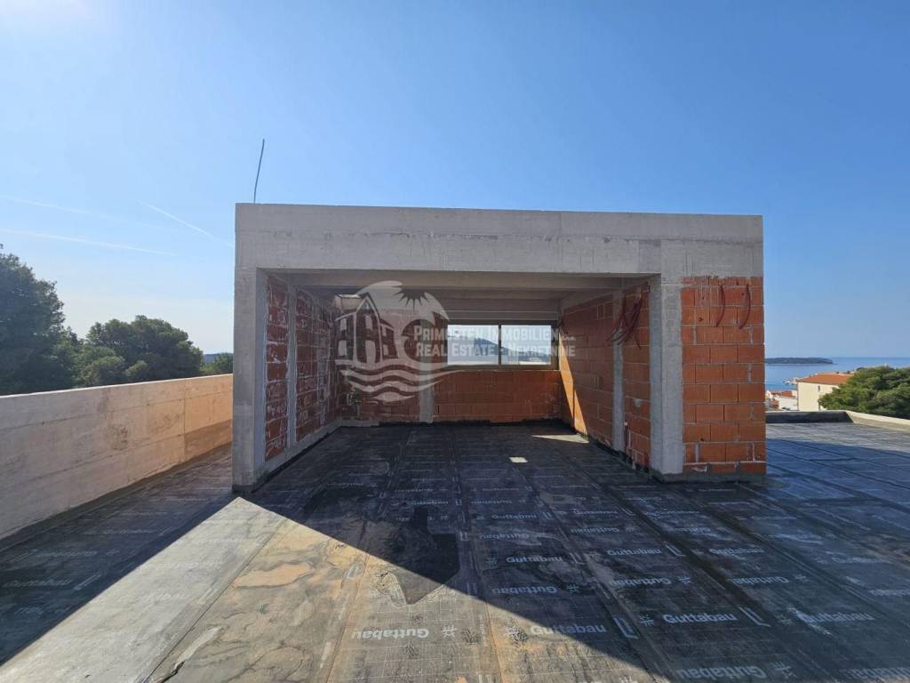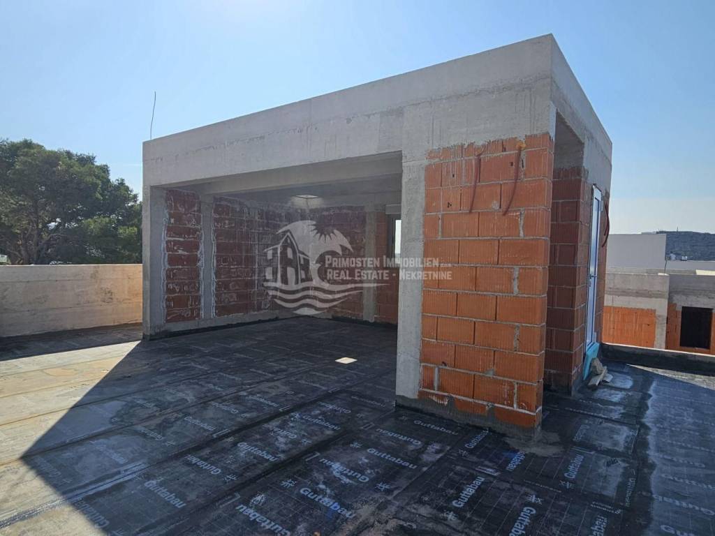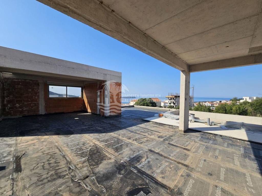 This high-quality, newly built luxury apartment is located in a prime area of Primošten and impresses with its well-thought-out living concept, spacious layout, and breathtaking sea views. Although legally an apartment, the property’s special terraced construction on a hillside gives almost the feeling of a private house. Due to the height difference between the floors, each unit enjoys maximum privacy, perfectly combining peace, exclusivity, and comfortable living. The apartment offers a generous living area of approximately 166 m² with a functional layout featuring four bedrooms, a spacious living kitchen as a central gathering space, two modern bathrooms with underfloor heating, and a separate guest WC. Large windows provide plenty of light and open up to a stunning sea view. Two of the bedrooms have direct access to the pool area, offering an exclusive living and holiday experience. The spacious outdoor areas are a particular highlight: in addition to a covered terrace, there is an open terrace of approximately 70 m², ideal for relaxing or socializing with family and friends. The covered outdoor kitchen is equipped with water and electricity connections, offering versatile usage options. An outdoor shower is also available – perfect for refreshing after a swim in the pool or the sea. The private pool with integrated counter-current system and heat pump allows for both relaxed swimming and sports swimming, extending the bathing season with comfortable water temperatures. As the property is still under construction, there is the opportunity to choose individual details such as tiles and finishes according to personal preferences. The current status is shell construction (rohbau), and completion is scheduled no later than spring 2027. High-quality features include electric blinds, modern construction, and a garage parking space. The location is highly attractive: the immediate surroundings feature new and high-quality residential buildings, and the sea and Primošten town center are only approximately 750 meters away. This property is ideal as an exclusive residence or holiday home and also as an attractive rental investment in one of the most desirable areas of the Dalmatian coast.