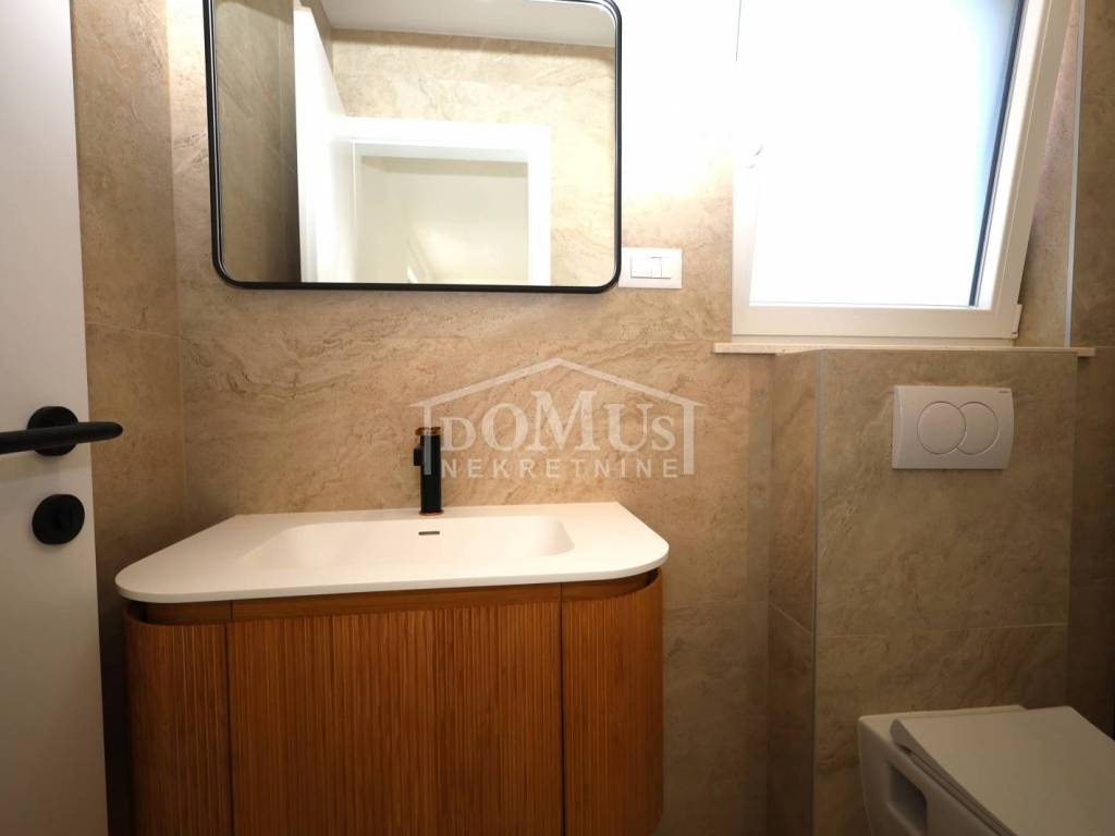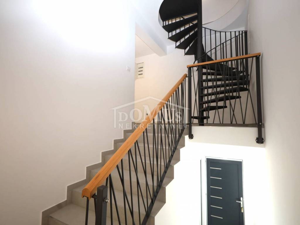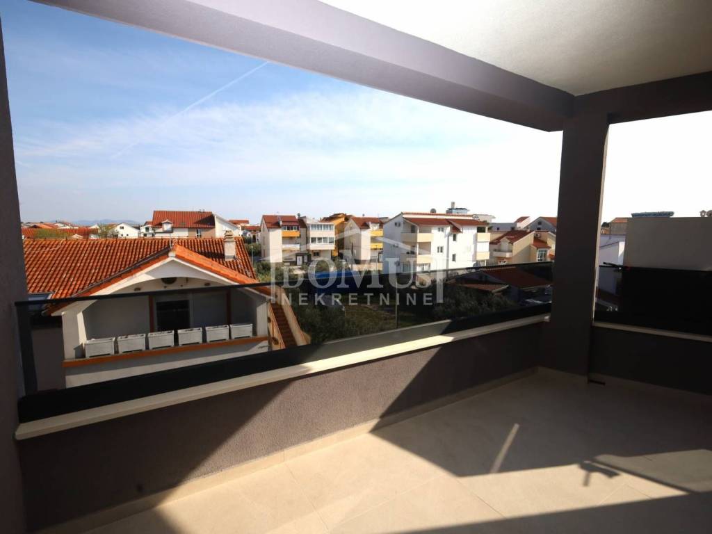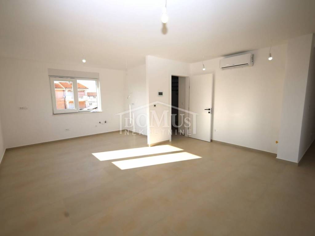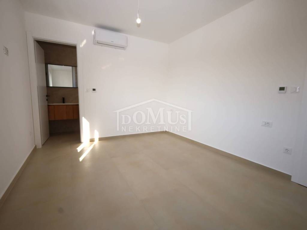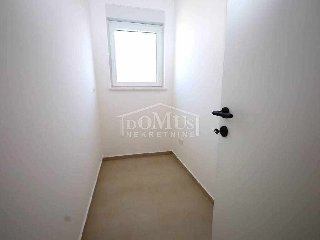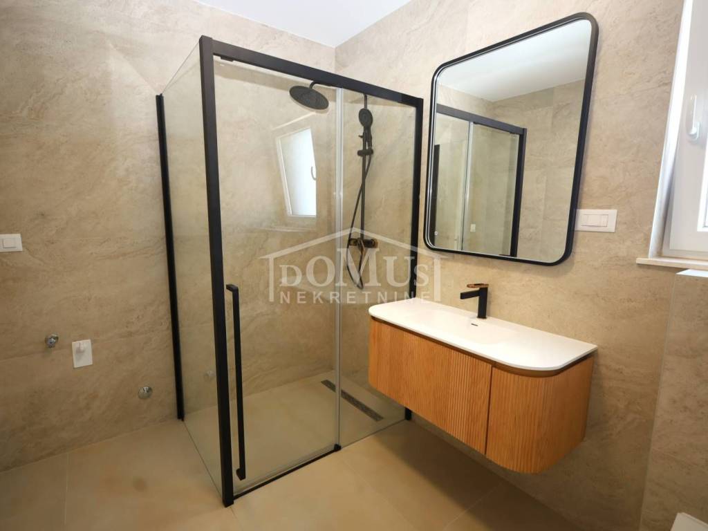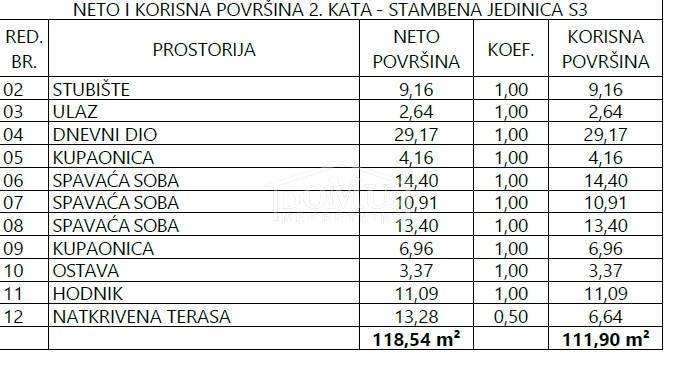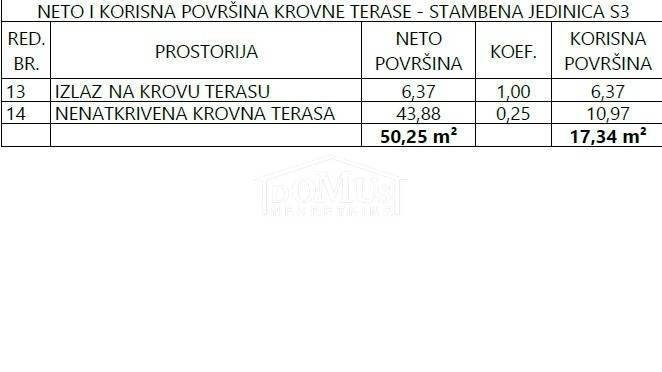 Vodice, new construction, attractive location, comfortable 3-room apartment on the 2nd floor. Apartment S3 is located in a small residential building with a total of 3 apartments, situated in a quiet dead-end street. It features a modern design and a functional layout with a total usable area of 143.61 m². The apartment consists of a spacious kitchen with dining and living area, hallway, three bedrooms, one of which has an en-suite bathroom, an additional separate bathroom, a storage room, and a covered terrace of 13.28 m². The internal staircase leads to a rooftop terrace of 43.88 m². Equipped with high-quality materials: modern ceramics and sanitary fittings, underfloor heating throughout the apartment, aluminum joinery with electric shutters, air conditioning in the living room and all bedrooms. The apartment comes with two parking spaces. It is located 450 m from the developed beach and 600 m from the center of Vodice.