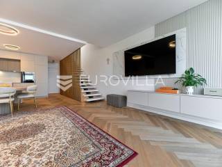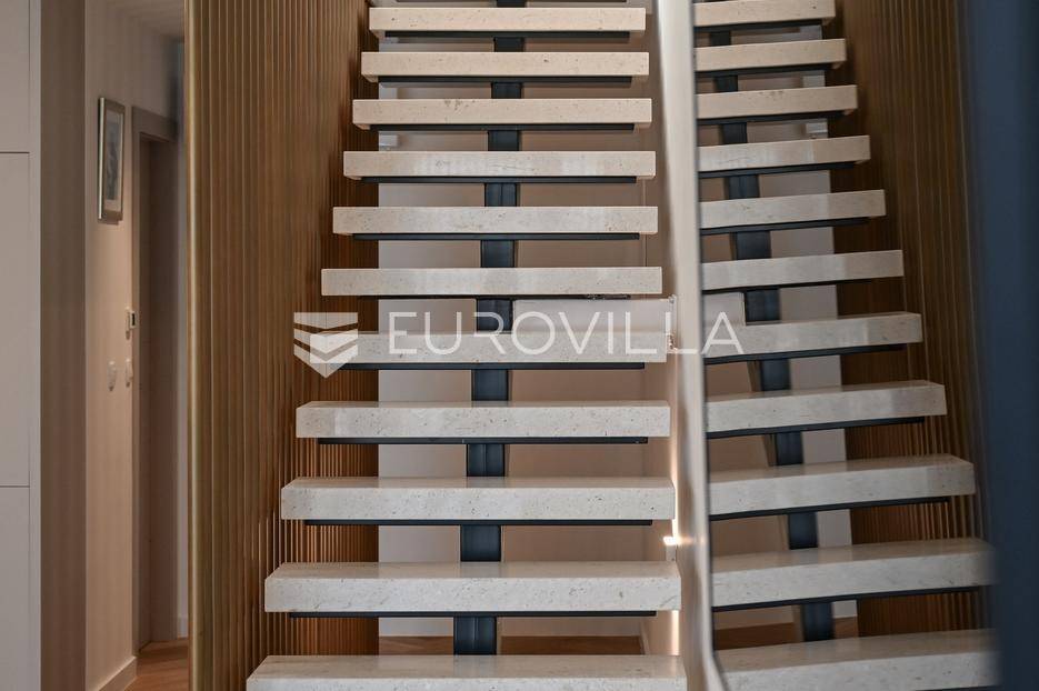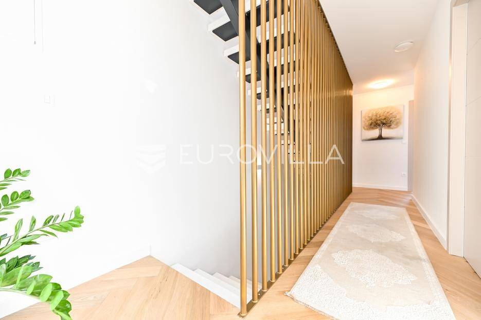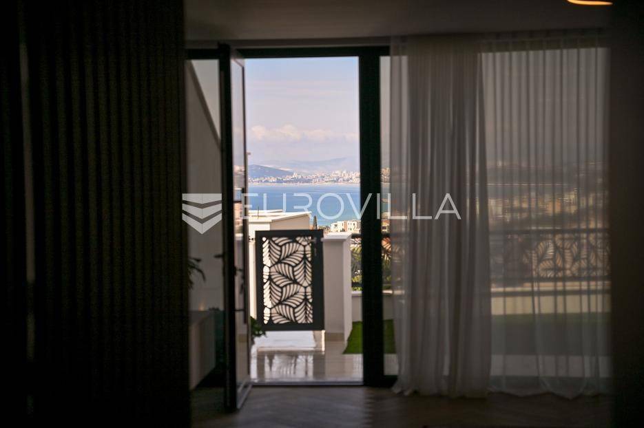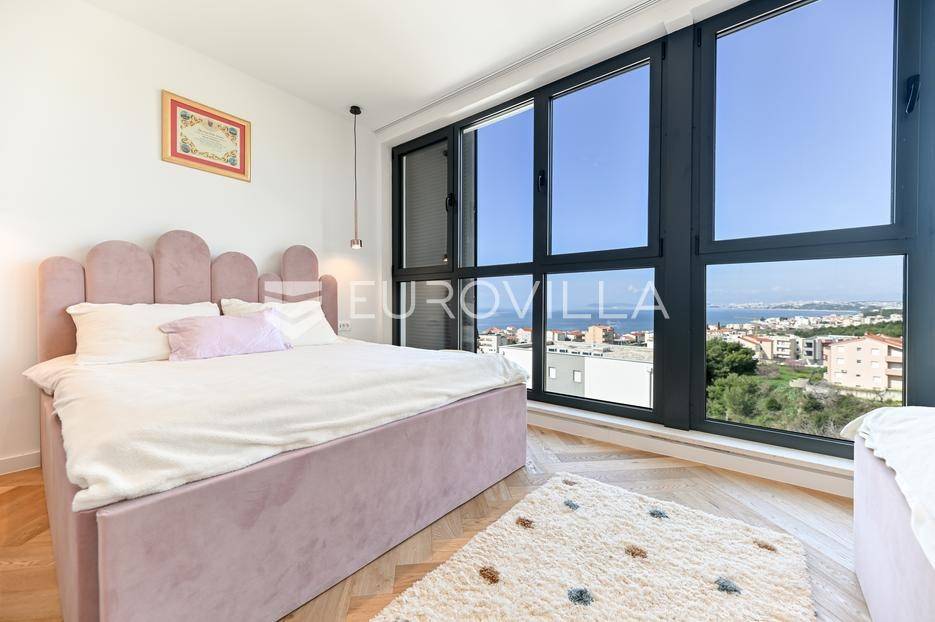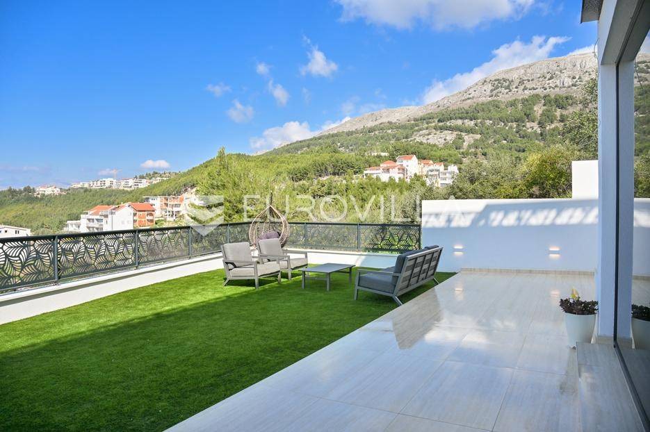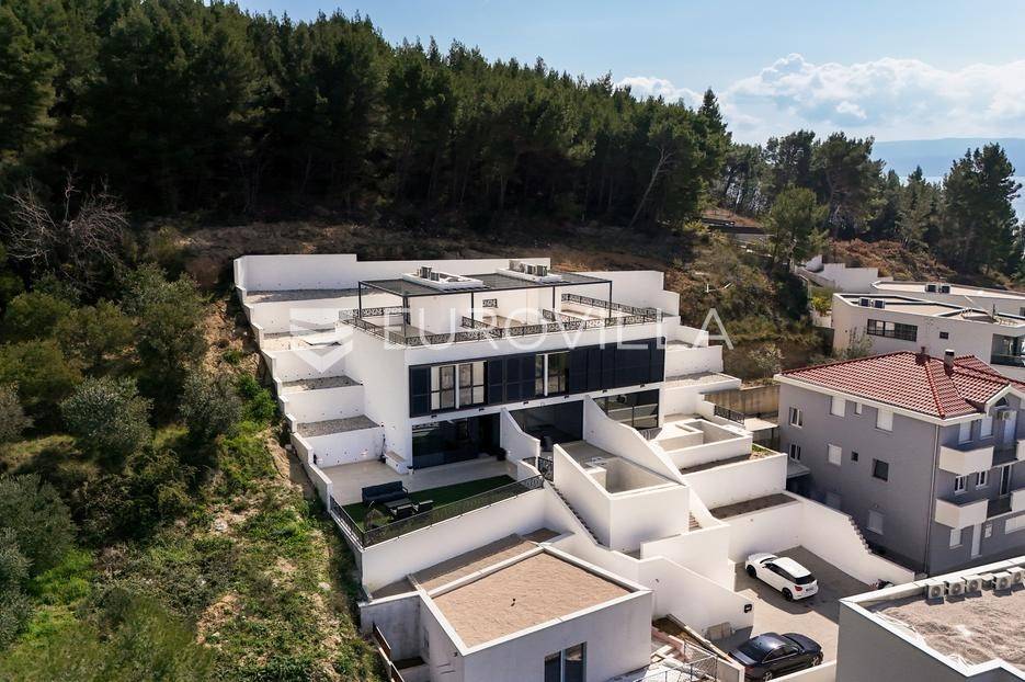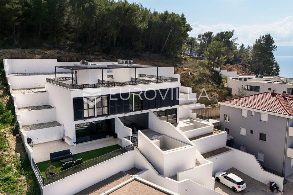 Podstrana, u modernoj novoizgrađenoj urbanoj vili, nalazi se dvosoban stan raspoređen na četiri etaže.Podrum je podijeljen na kupaonicu, pomoćni prostor i ostavu, ukupne površine 53, 9 m2. Prostor je opremljen s dvije klima jedinice te se lako može prenamijeniti u malu teretanu, igraonicu ili kućno kino.Na etaži prizemlja, gdje je ujedno i ulaz u stan, nalazi se prostran open-space dnevni prostor koji obuhvaća kuhinju opremljenu najmodernijim Bosch uređajima, dnevni boravak te jednu kupaonicu.Prva etaža zamišljena je kao spavaći dio te je podijeljena na dvije spavaće sobe i zajedničku kupaonicu. Jedna od soba ima vlastitu garderobu, dok je druga, gotovo 20 m² velika, potpuno ostakljena i pruža predivan pogled na more.Posljednja etaža nudi prostranu, djelomično natkrivenu krovnu terasu s otvorenim i prekrasnim pogledom na more.Ukupna površina zatvorenog stambenog prostora iznosi 162, 25 m2.Osim dizajnerski uređenog interijera, ova nekretnina nudi i okućnicu: terasu i vrt u prizemlju – prostor idealan za jacuzzi, sunčalište ili dječju igru, kao i nekoliko kaskadnih vrtova koji okružuju stan.Mikrolokacija je odlična, mirna i privatna a samo nekoliko minuta hoda udaljena od plaže i nove šetnice koja povezuje cijelo mjesto.Za sve dodatne informacije, stojimo vam na raspolaganju.... Više na eurovilla.hr, ID: 947726