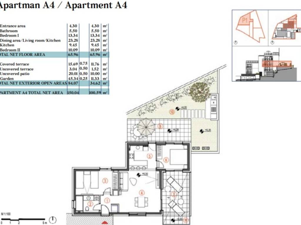 Apartment P1 A4 consists of 2 bedrooms, hallway, equipped kitchen, spacious living room, dining room, bathroom, summer kitchen, covered and uncovered terrace and fenced garden. It has a private swimming pool, sundeck with deck chairs as well as storage and parking space.