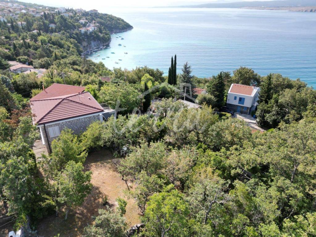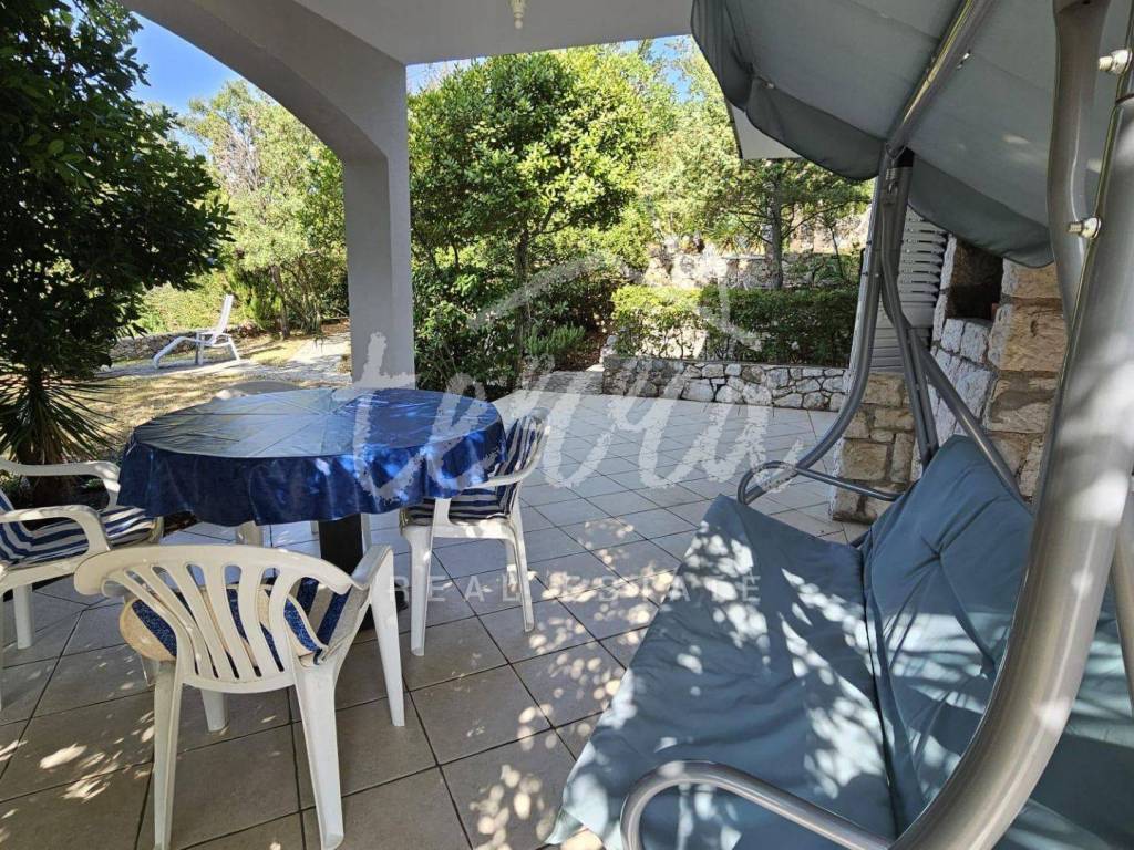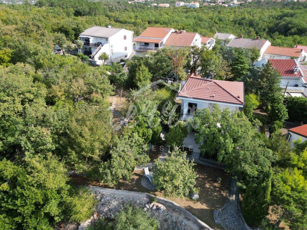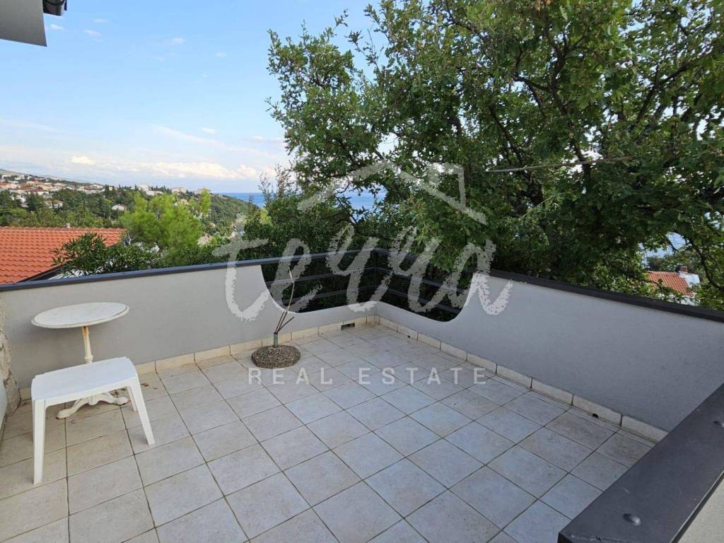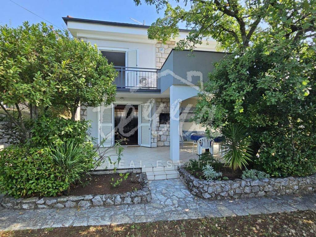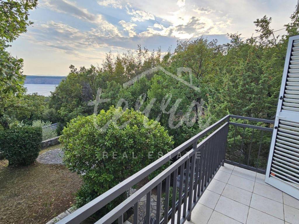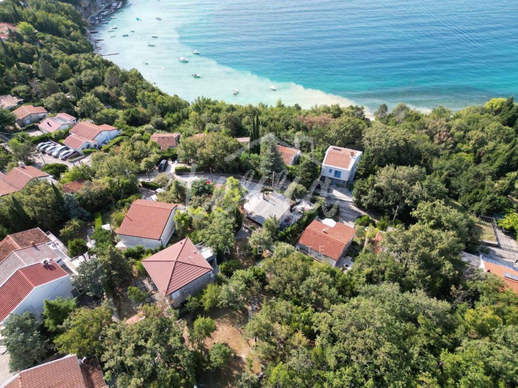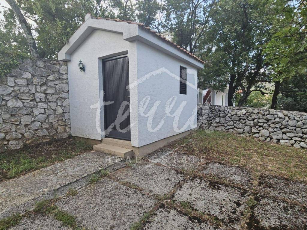 The house consists of a kitchen, bathroom, living room and dining room (with access to the terrace and with a view of the sea) on the ground floor, and on the first floor there are a bathroom, two larger bedrooms and a children's room. The ground floor leads to a covered terrace, and the master bedroom upstairs leads to a large terrace with a beautiful view of Kvarner. Behind the house there is a storage room of 8m2 and below it a garage (with electricity and water) in front of which another car can fit. A large stone barbecue with a stone table for socializing is also located on the beautifully landscaped garden, which offers perfect privacy and plenty of shade.