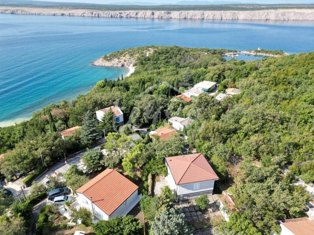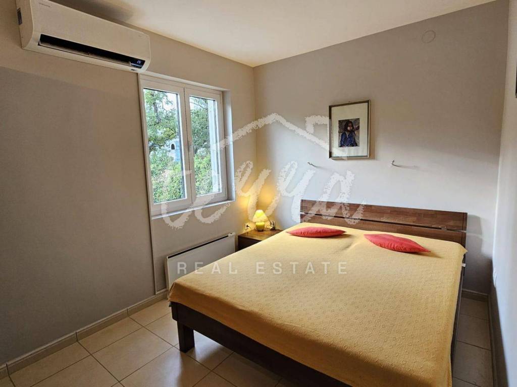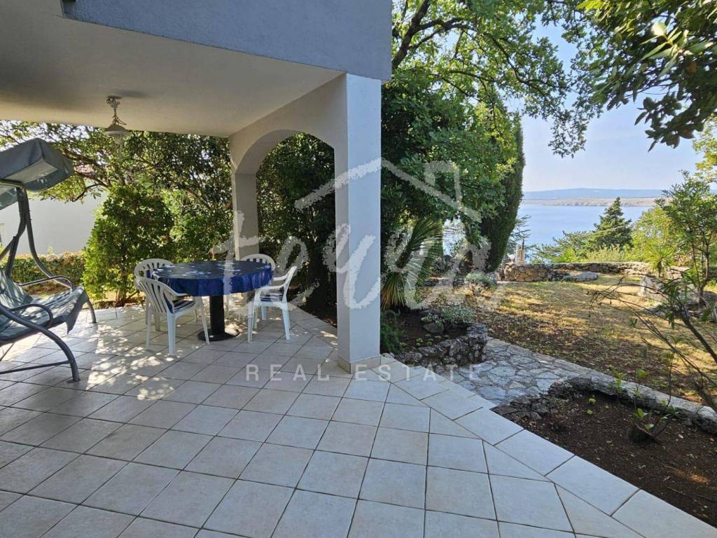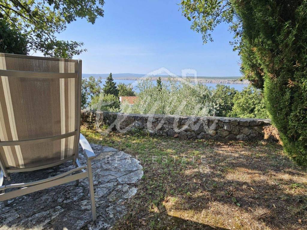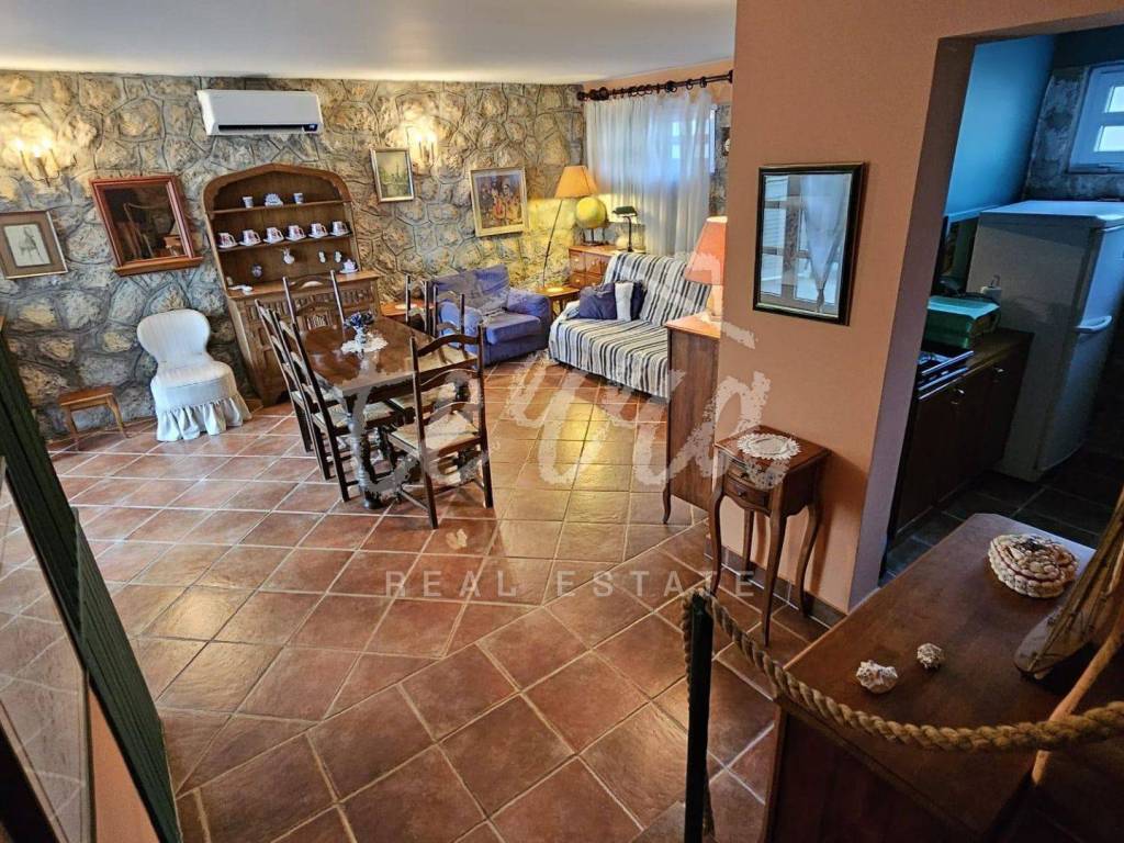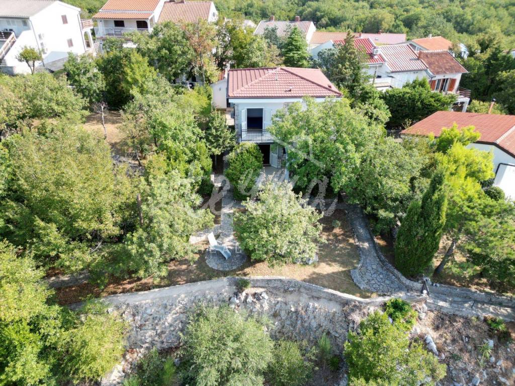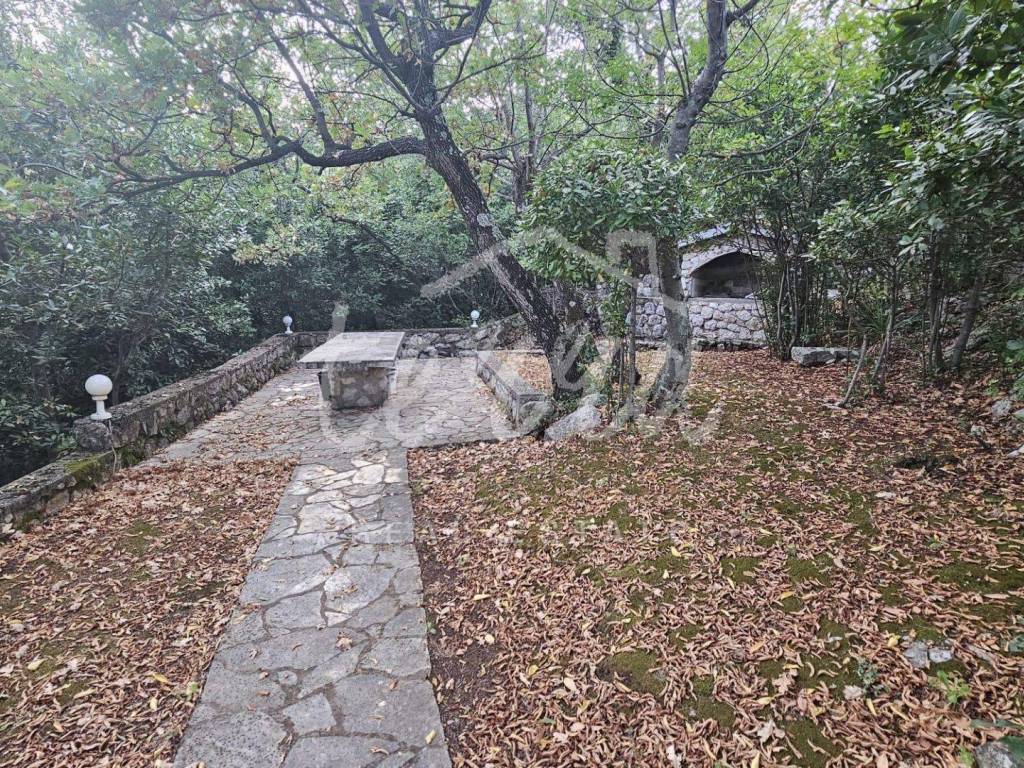 The house consists of a kitchen, bathroom, living room and dining room (with access to the terrace and with a view of the sea) on the ground floor, and on the first floor there are a bathroom, two larger bedrooms and a children's room. The ground floor leads to a covered terrace, and the master bedroom upstairs leads to a large terrace with a beautiful view of Kvarner. Behind the house there is a storage room of 8m2 and below it a garage (with electricity and water) in front of which another car can fit. A large stone barbecue with a stone table for socializing is also located on the beautifully landscaped garden, which offers perfect privacy and plenty of shade.