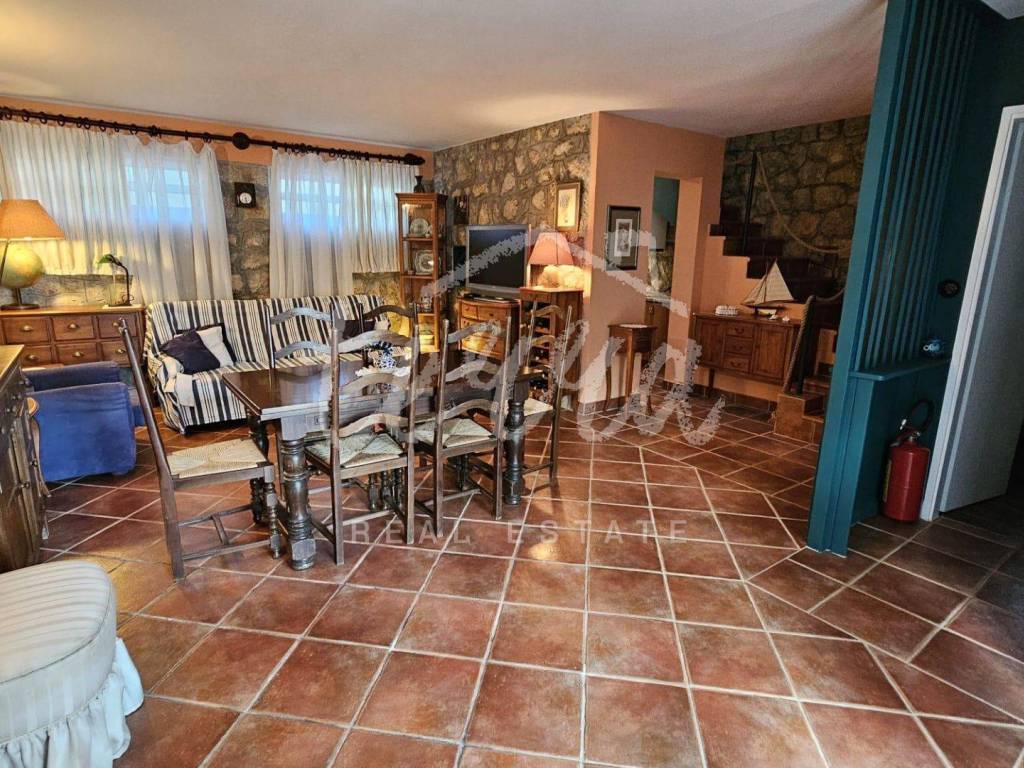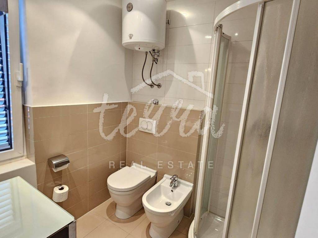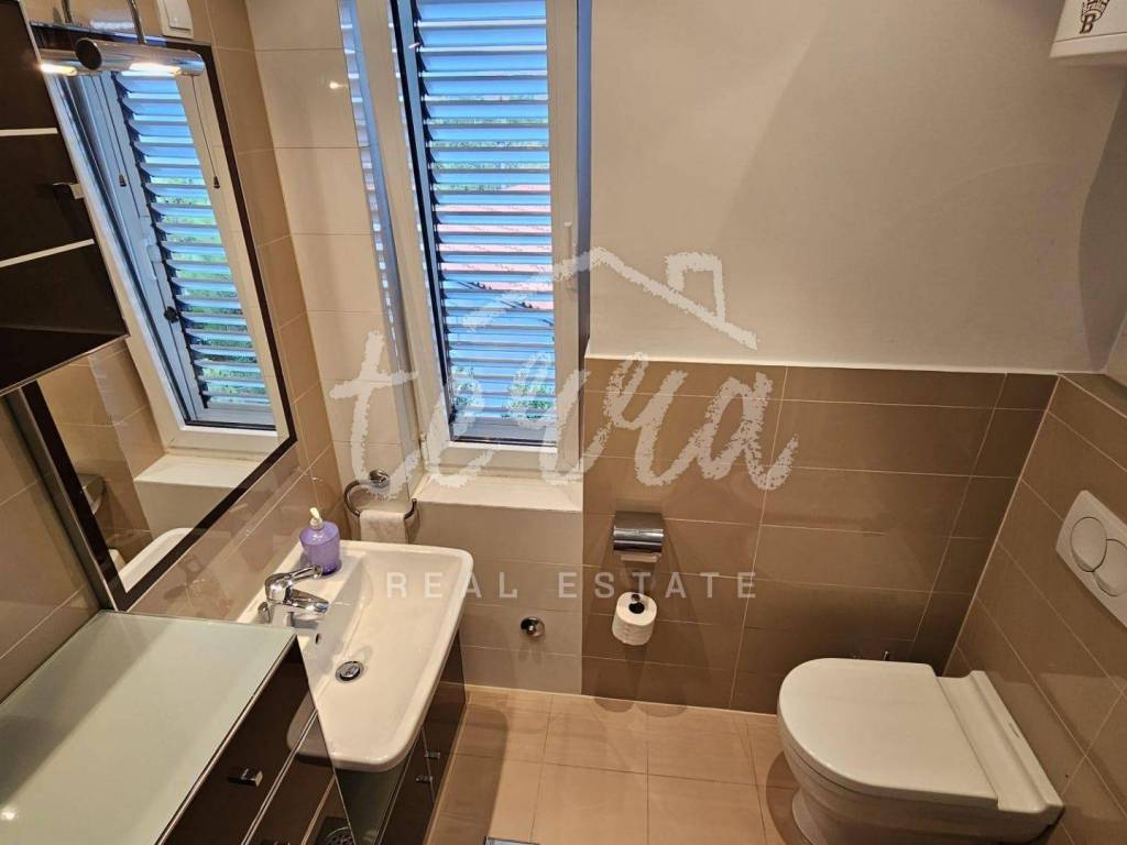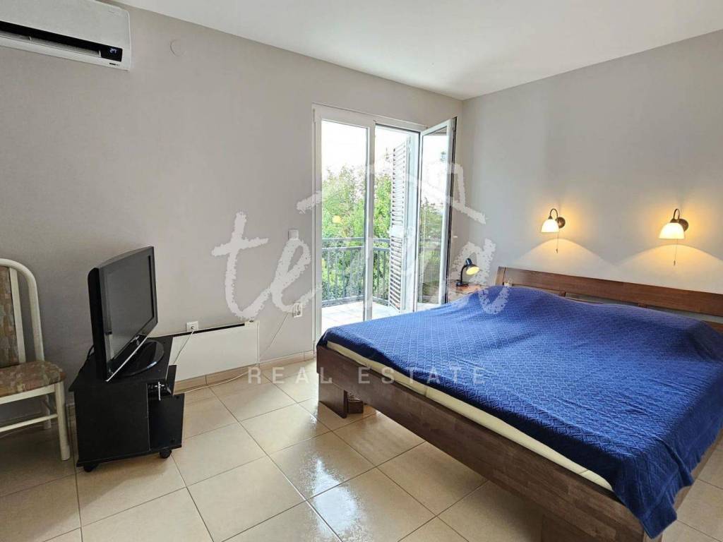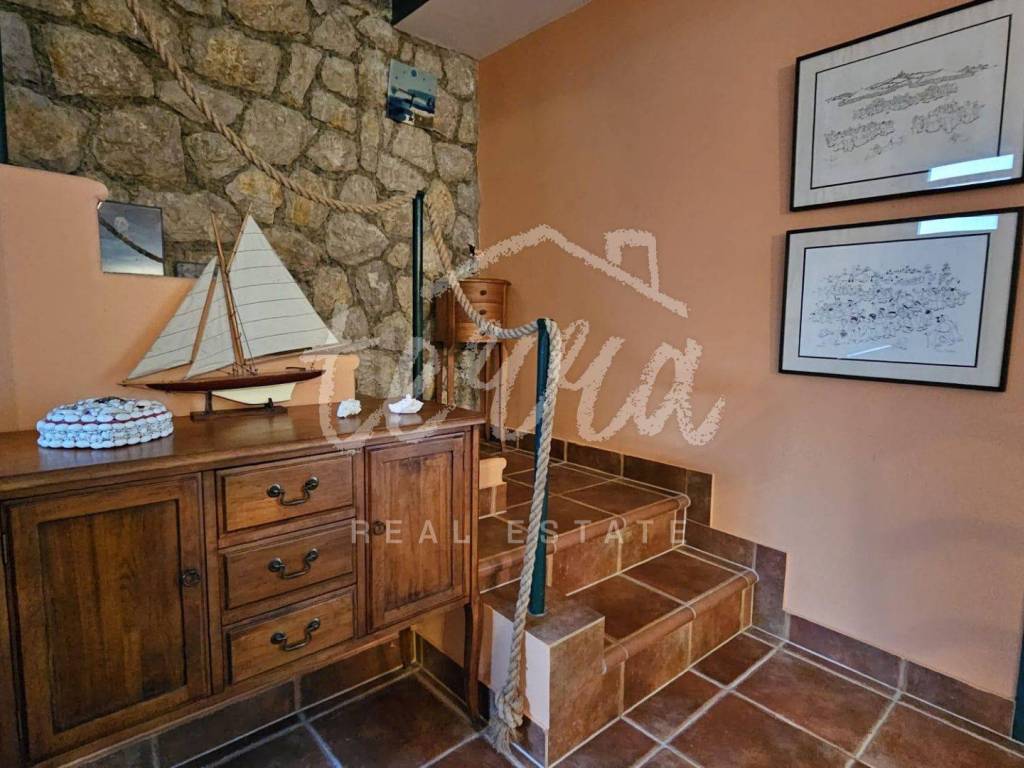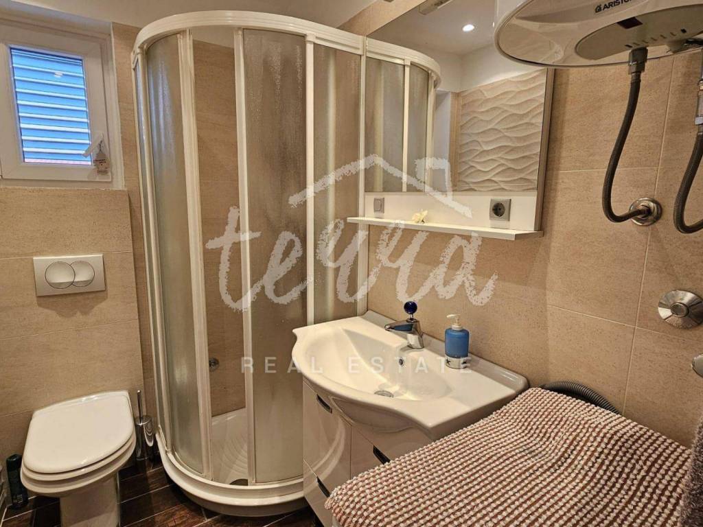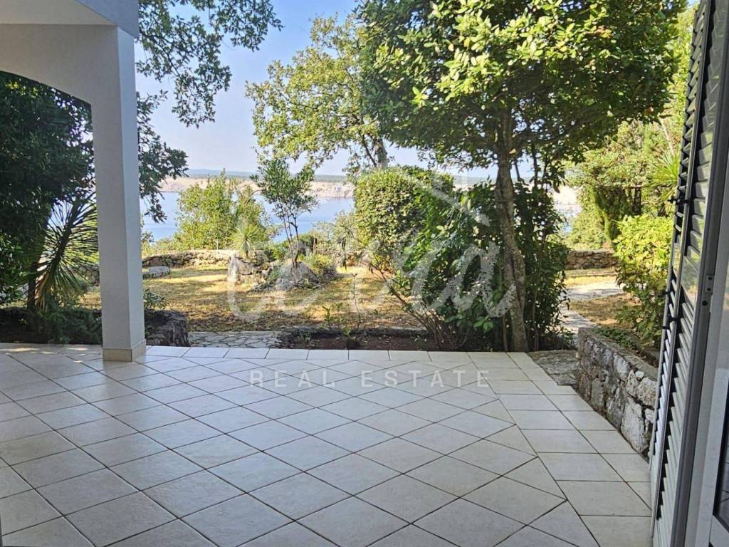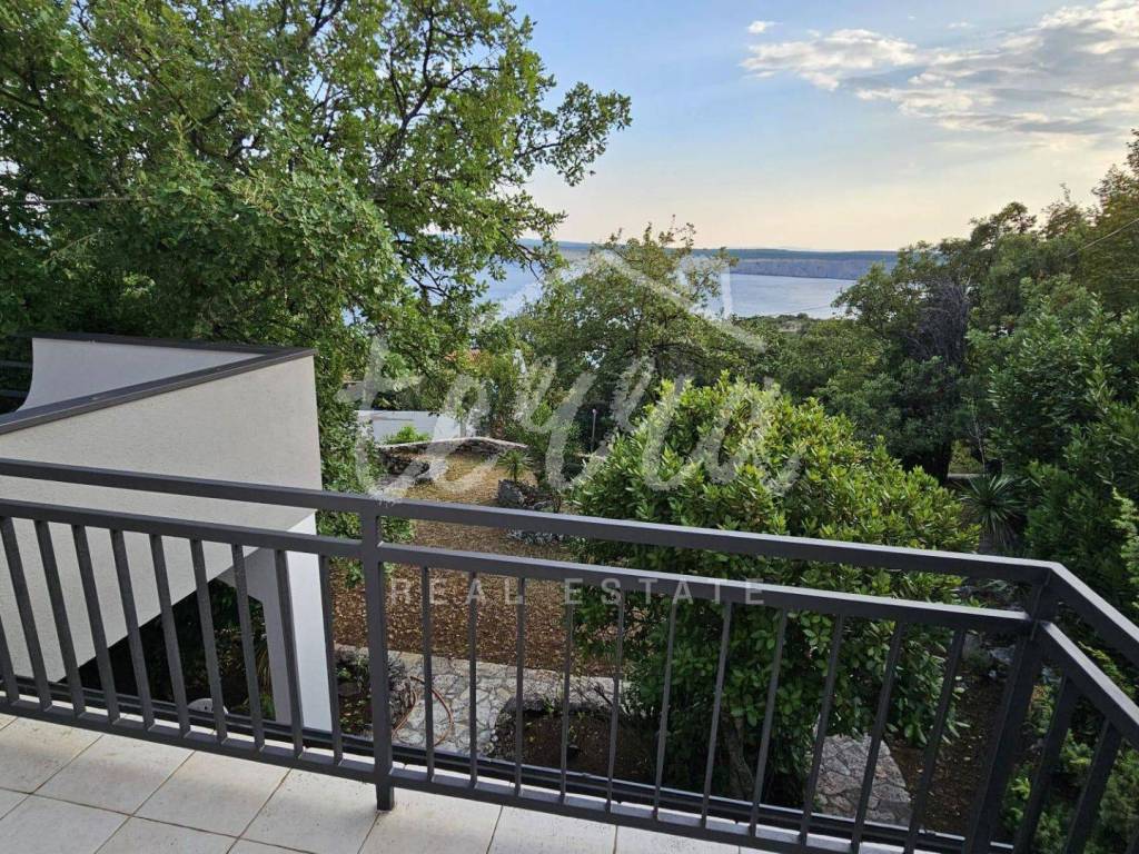 The house consists of a kitchen, bathroom, living room and dining room (with access to the terrace and with a view of the sea) on the ground floor, and on the first floor there are a bathroom, two larger bedrooms and a children's room. The ground floor leads to a covered terrace, and the master bedroom upstairs leads to a large terrace with a beautiful view of Kvarner. Behind the house there is a storage room of 8m2 and below it a garage (with electricity and water) in front of which another car can fit. A large stone barbecue with a stone table for socializing is also located on the beautifully landscaped garden, which offers perfect privacy and plenty of shade.