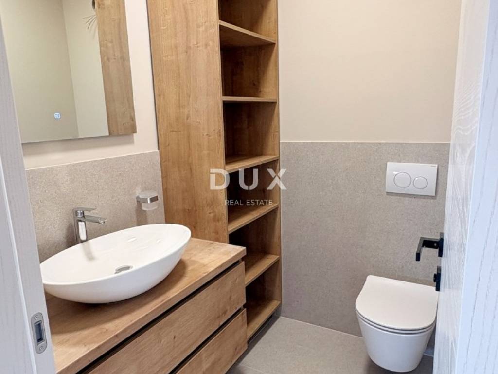 The house of timeless design blends into the settlement and landscape in terms of form and color. It is conceived as one residential unit that extends across two elegantly furnished and well-equipped floors and consists of an open-concept space that combines a living room, dining room and kitchen, three bedrooms, two bathrooms, a guest toilet and a storage room.