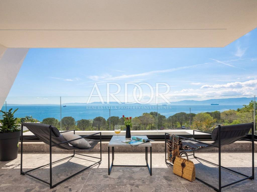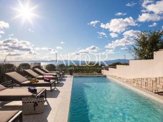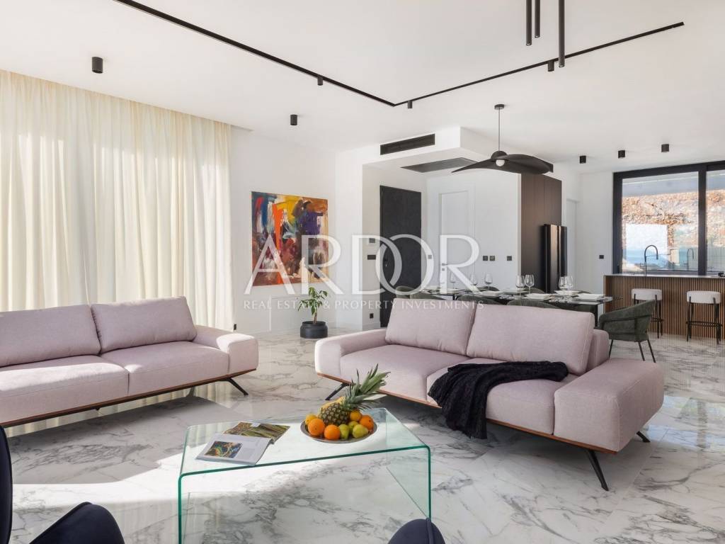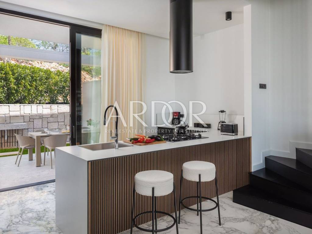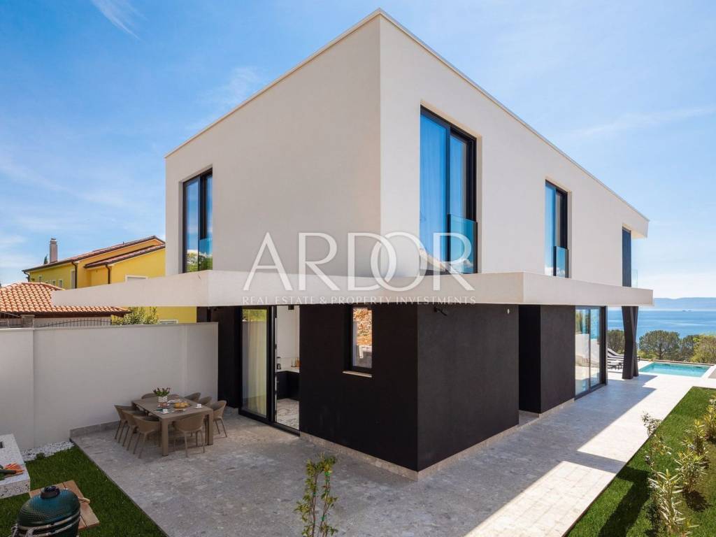 Kostrena, we are mediating the sale of a modern, luxuriously furnished semi-detached villa with a swimming pool and a wonderful open sea view located in a prime location in the immediate vicinity of the sea and beaches! The villa with a net area of ​​236.59 m2 is located on a plot of 625 m2, has 4 bedrooms, 3 bathrooms and an additional toilet. On the ground floor there is a spacious living room with kitchen and dining room, toilet and storage room. From the living room there is access to a spacious terrace and to the 27.6 m2 pool with a beautiful view of the sea, while from the kitchen there is access to the rear terrace with a summer kitchen. On the first floor there is a hallway, a master bedroom with a private bathroom and a walk-in wardrobe and access to the balcony, another bedroom with a private bathroom, and 2 bedrooms with a shared bathroom. On the basement floor there is a storage room and a pool machine room, and in front of the villa there is a large parking lot and a garage for two cars. It is sold fully furnished and equipped with top quality furniture and appliances. Heating and cooling is possible through underfloor heating in the living room and bathrooms and fan coil devices in all bedrooms. High-quality aluminum external carpentry, high-quality sanitary ware, anti-burglary entrance doors, etc. Located in an exceptional location, just a few minutes' walk away from beautiful pebble beaches and the coastal promenade, and all essential facilities are only a few minutes' drive away. Dear customers, in accordance with the Law on Mediation in Real Estate Transactions, viewing the property is only possible with the signature of the Mediation Agreement. According to the same, the buyer has the obligation to pay the agency commission in case of realization of the purchase. ID CODE: 1907 Sendi Vinski Agent s licencom Mob: 0038598443289 Tel: 0038551222673 E-mail: prodaja@ardor-realestate.com www.ardor-realestate.com