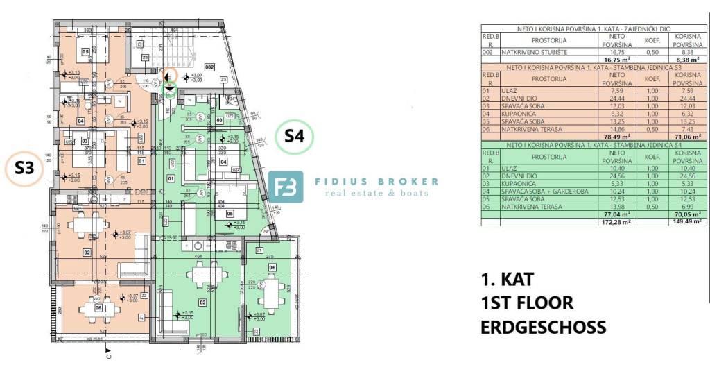 Apartment S3 is located on the 1st floor, with a total usable area of ​​77.31 m². The orientation of the apartment is north-west-south. It consists of a hallway, two bedrooms, a bathroom and a spacious living room connected to the kitchen and dining room which has access to a covered terrace of 14.86 m² with sea view. The apartment has two outdoor parking spaces.