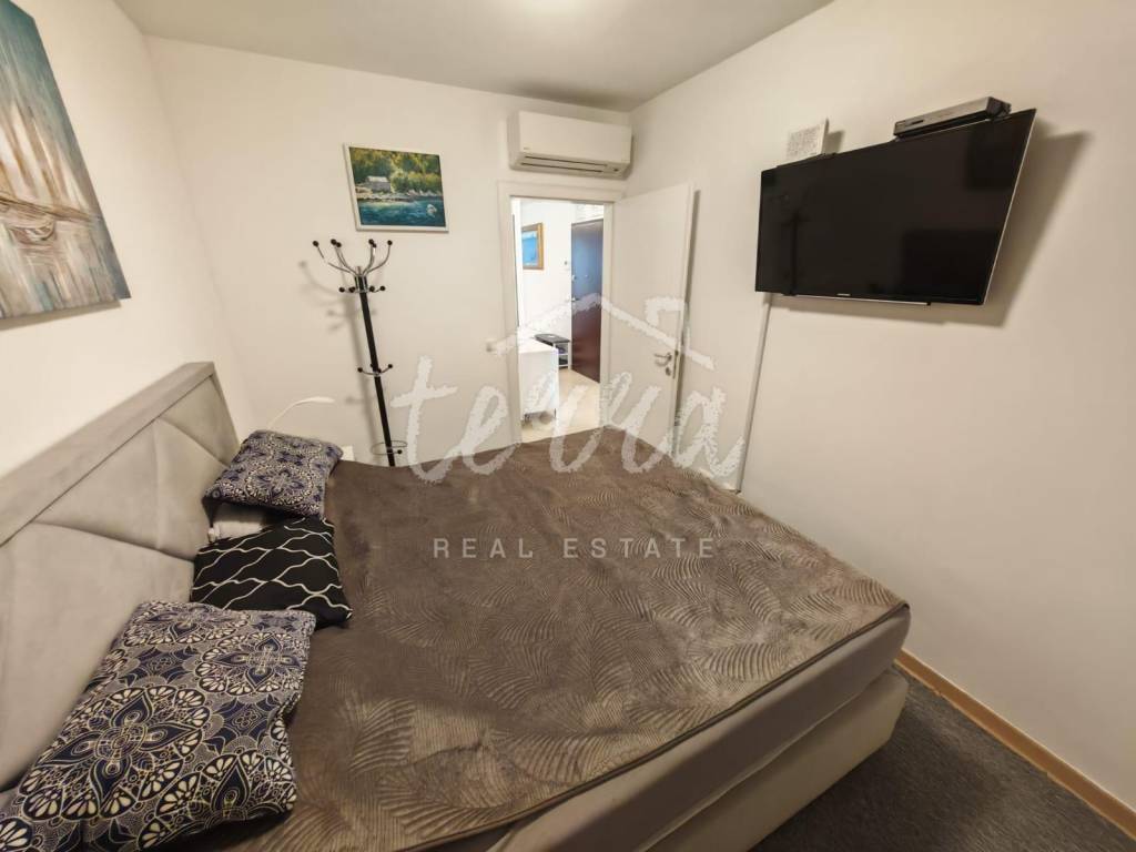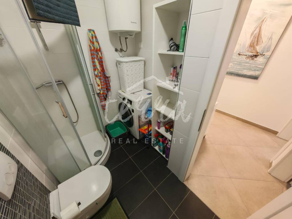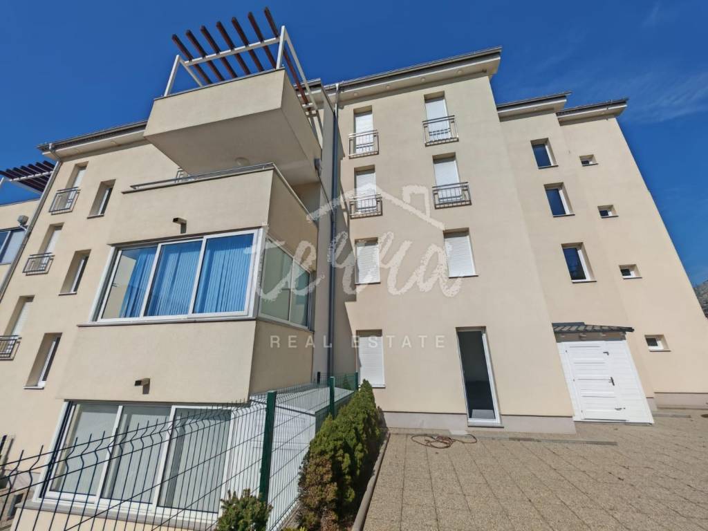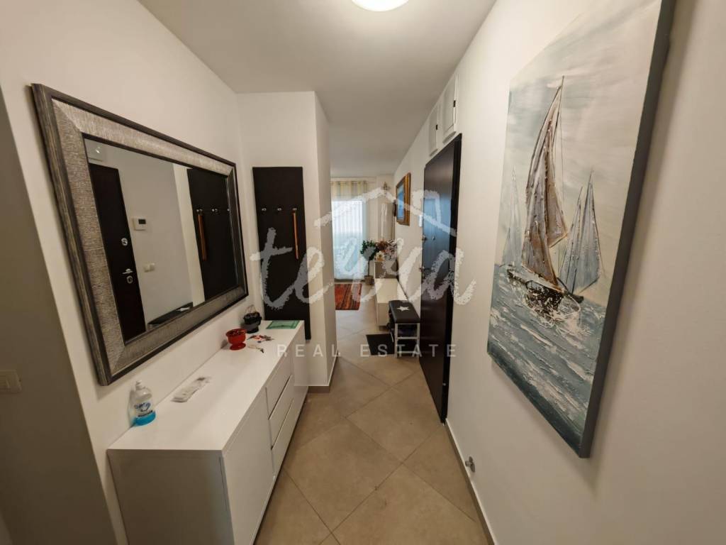 We are selling an excellent apartment on the high ground floor of a newly built building. The apartment consists of two bedrooms, a bathroom, a kitchen with a dining room, a living room with access to a spacious loggia from which you can see the sea. The apartment also has a storage room in the hallway of the building, a large paved terrace with a garden house and complete garden furniture.