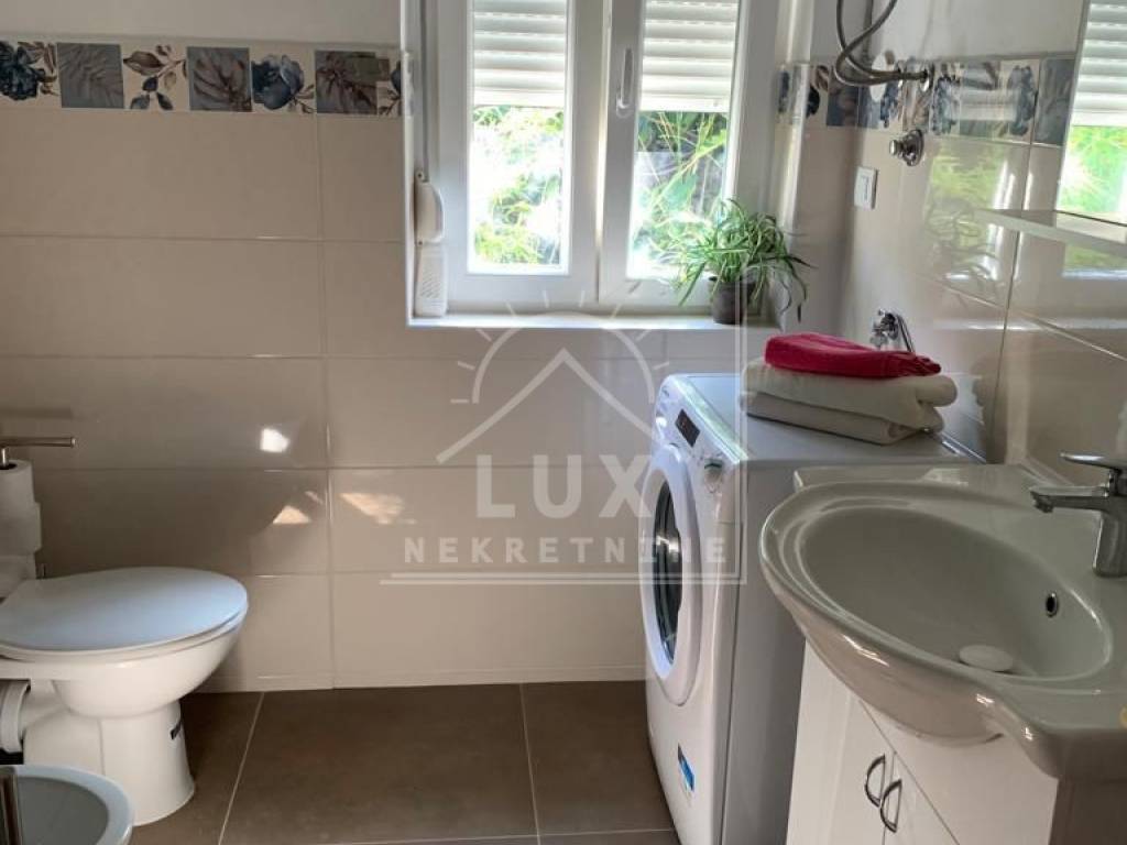 U prizemlju se nalaze konoba i ljetna kuhinja, a na katu trosoban stan koji sadrži hodnik, dnevni boravak s kuhinjom i blagovaonicom, tri spavaće sobe, kupaonicu i loggia-u (pov. 15 m2). Kuća ima prekrasan pogled na more.