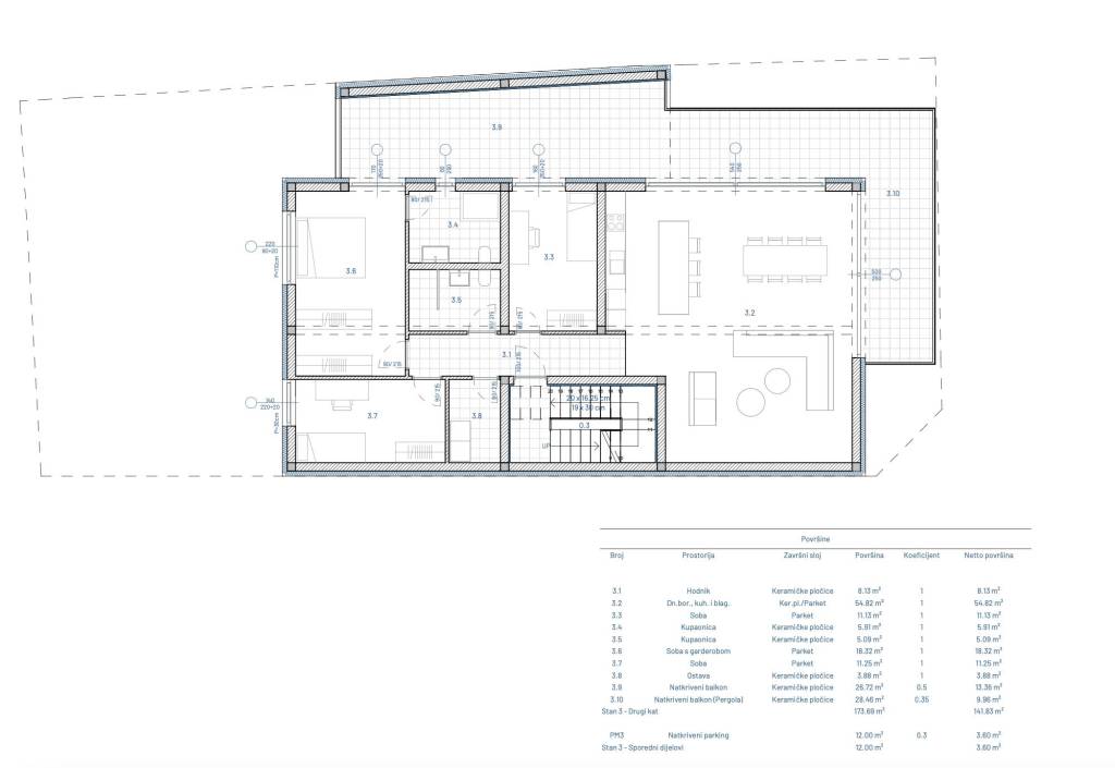 Osijek, Petefijeva, četverosoban penthouse oznake S3 na 2.katu zgrade A, ukupne neto korisne površine 145, 45 m², smješten u atraktivnom projektu s ukupno šest luksuznih stanova.Sastoji se od hodnika, otvorenog koncepta dnevnog boravka, kuhinje i blagavaonice (54,82 m²), ostave, veće spavaće sobe s garderobom, još dvije spavaće sobe, dvije kupaonice, natkrivenog balkona (26,72 m²), i natkrivenog balkona (pergola, 28, 46 m²). Ukupna zatvorena površina stana iznosi 118, 53 m².U cijenu stana uključeno je i jedno vanjsko natkriveno parkirno mjesto (12m²).Opis gradnje i opreme: Građevina je projektirana kao zidana konstrukcija od blok opeke s armirano-betonskim horizontalnim i vertikalnim serklažama,Debljina nosivih zidova iznosi 25 cm,Krovna konstrukcija izvedena je s betonom za pad, PVC hidroizolacijom, zaštitnom glazurom te završnim slojem keramičkih pločica,Fasada objekta izvodi se kao kombinacija DEMIT fasade i ALUCOBOND aluminijskih kompozitnih panela ukupne debljine 15 cm,Vanjska stolarija izrađena je od aluminijskih termo profila proizvođača FEAL u antracit boji (RAL 7016), s troslojnim izolacijskim staklom,Prozori su opremljeni termoizoliranim aluminijskim roletama.Vanjske prozorske klupčice su aluminijske, dok su unutarnje izvedene u kamenu,Podne obloge u stanovima kombinacija su: porculanskih pločica 1. klase (hodnici, kuhinja, sanitarije i ostave) I višeslojnog hrastovog parketa u sobama,Sve konstrukcije i ugrađeni materijali projektirani su i odabrani s ciljem postizanja visokog standarda zvučne i toplinske izolacije, čime se osigurava ugodan i kvalitetan prostor za stanovanje,Ulaz u zgradu osiguran je videoportafonom s elektroničkom bravom i sustavom kontrole pristupa, dok je dodatnu sigurnost osigurava videonadzor ulaza u zgradu,Grijanje i topla voda putem dizalice topline zrak/voda s podnim grijanjem i termostatima. Hlađenje multi-split sustavom, ventilacija u prostorijama bez prozora. Kupaonica i WC s kvalitetnom sanitarijom i konzolnim WC školjkama.Planirani završetak gradnje i useljenje predviđeni su za jesen 2027. godine.Izvrsna lokacija – Petefijeva ulica je mirna i tiha, a Retfala nudi sve ključne sadržaje: škole, vrtiće, trgovine, trgovačke centre, restorane i javni prijevoz. Centar grada dostupan je brzo i jednostavno, što ovu lokaciju čini idealnom za svakodnevni život.Za više informacija slobodno nas kontaktirajte.... Više na eurovilla.hr, ID: 752461