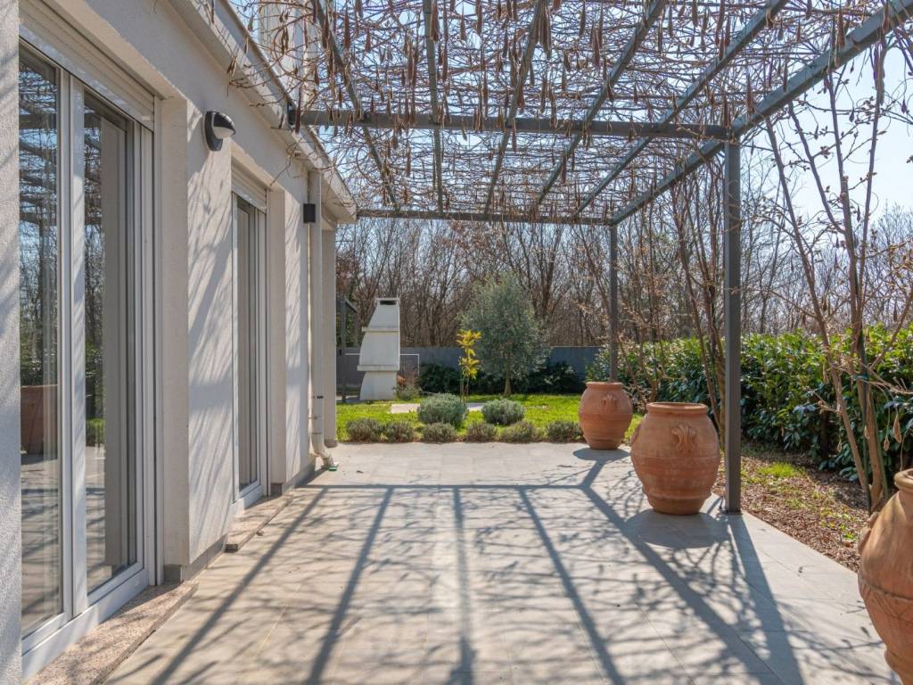 The landscaped garden includes a summer kitchen, two pergolas, and four parking spaces.