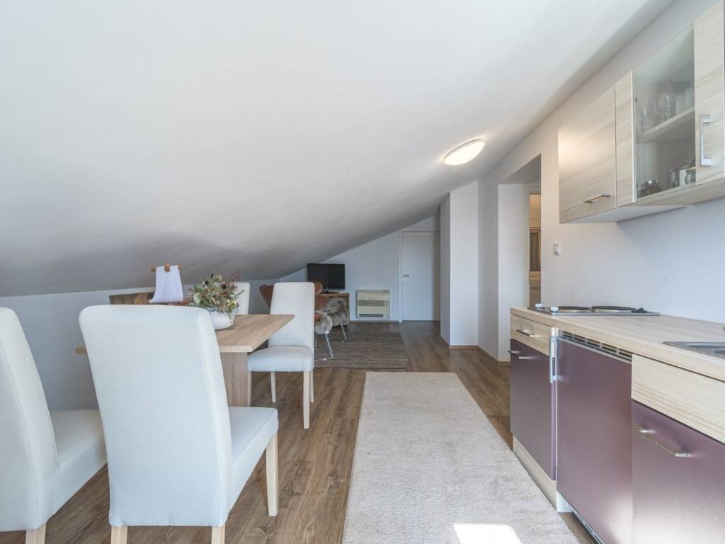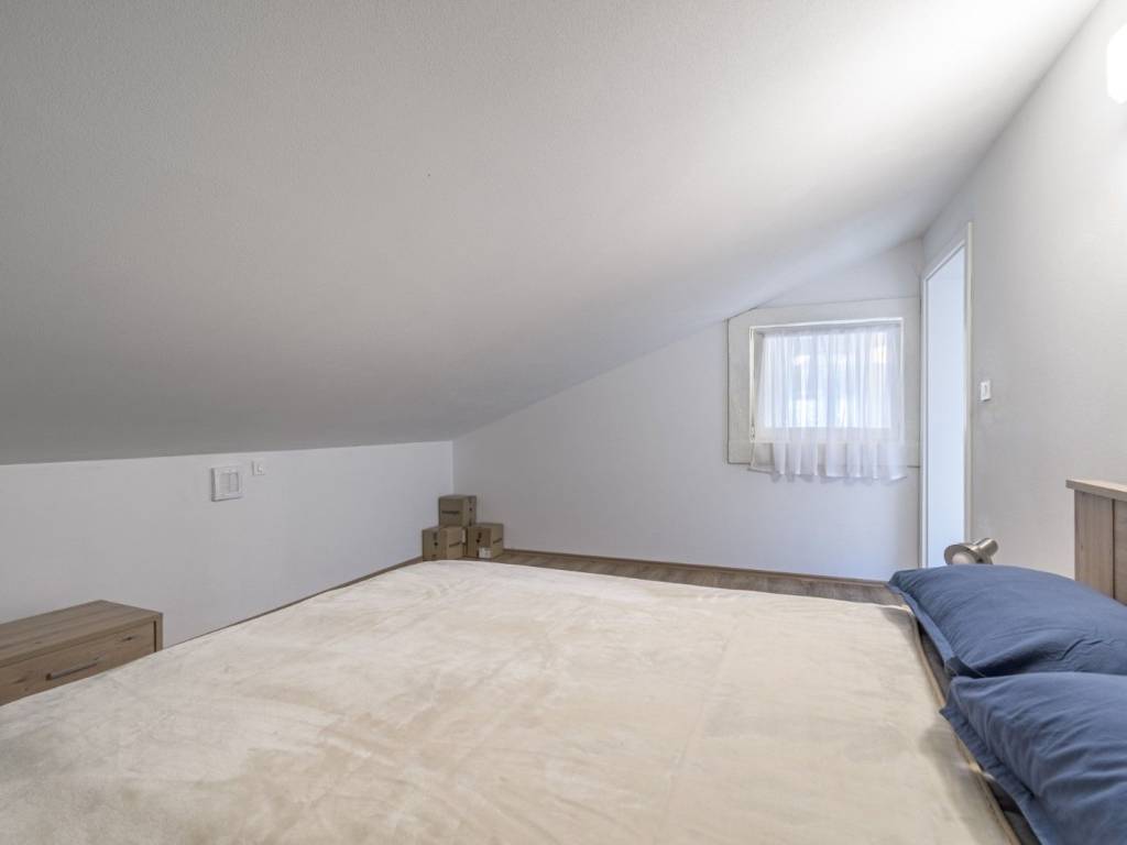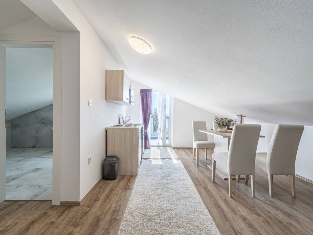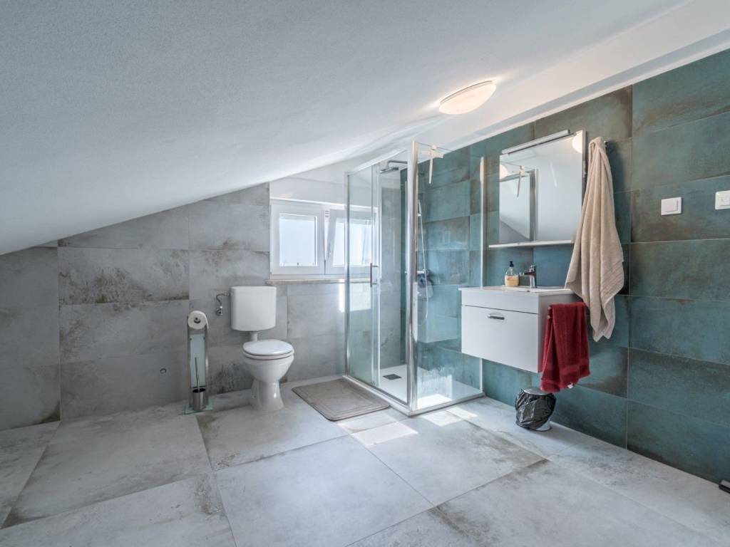 The attic includes a bedroom, a spacious bathroom, a storage room, a small kitchen with dining area and living room, as well as a large terrace with panoramic sea views.