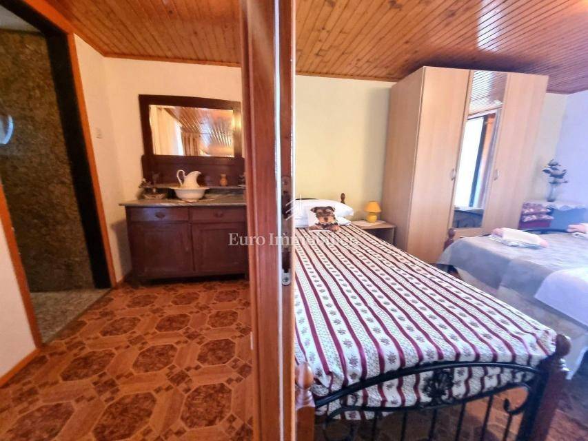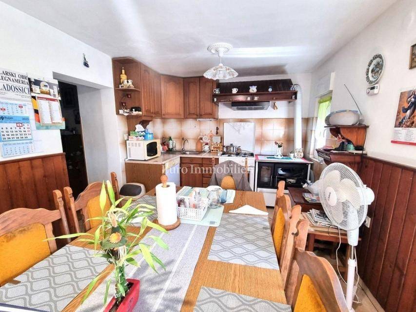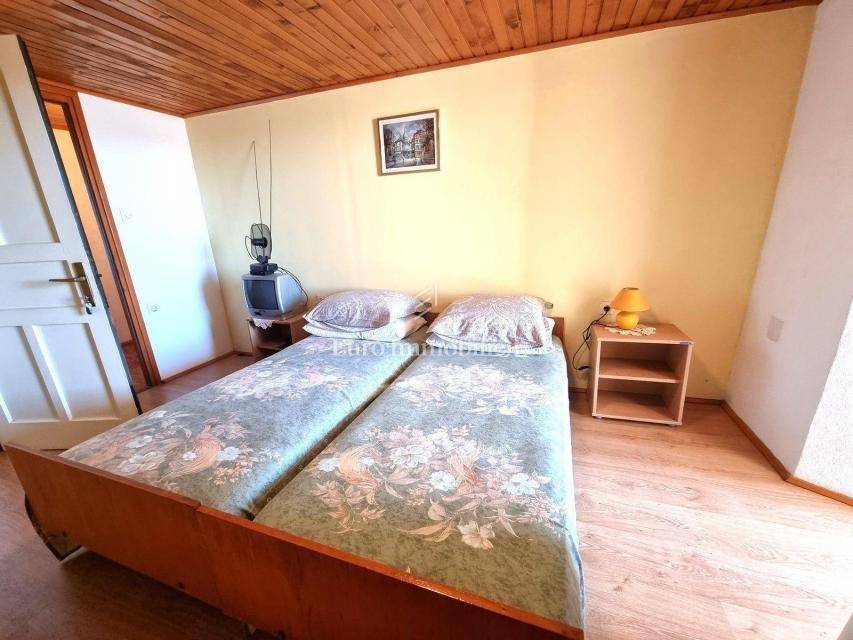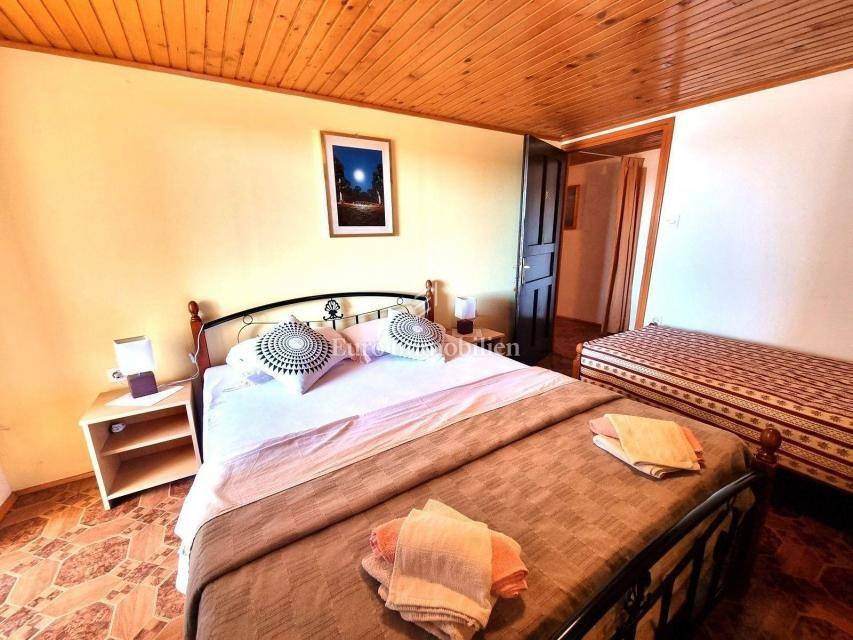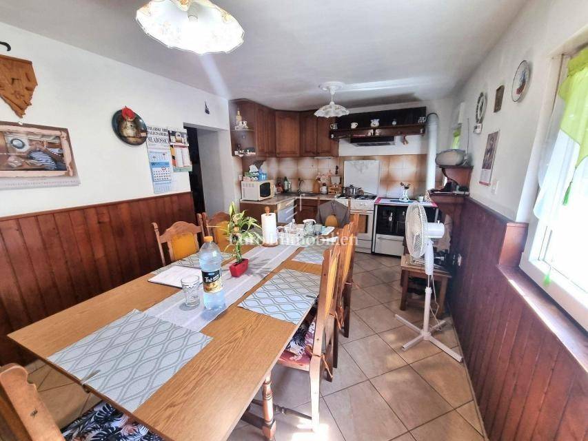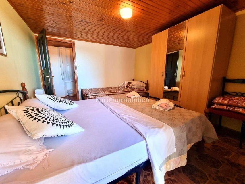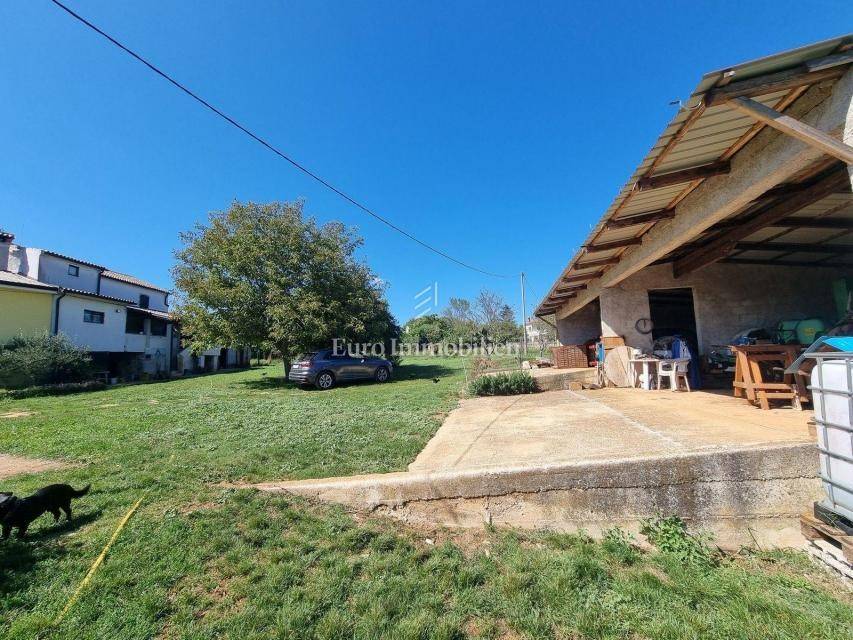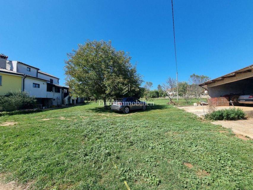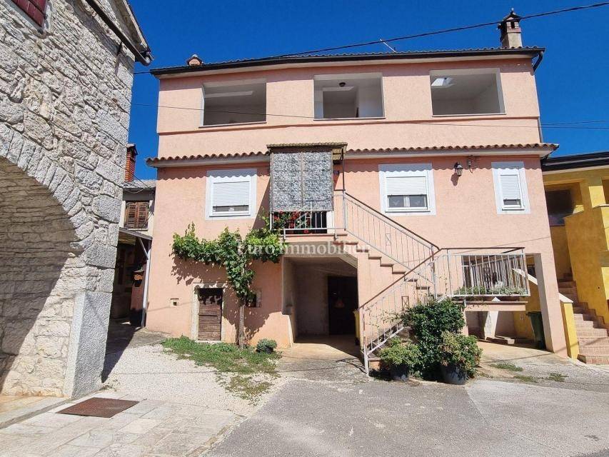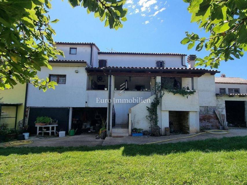 In a small Istrian village, on the edge of the construction zone, there is a family house of net 320 m2. It is attractive because it has approx. 2300 m2 of construction land on which additional buildings, vacation homes, etc. can be built. The house itself consists of a ground floor, 1st and 2nd floor. On the ground floor there is only a storage room and a large tavern. The external stairs lead to the first floor where there is a kitchen with a dining room, a living room, a bathroom, a bedroom, another kitchen and an ironing room through which you can go outside to a spacious covered terrace of 34 m2 with access to the rear garden of approx. 2300 m2. Internal stairs lead to the first floor where there are three more bedrooms and three bathrooms. Each room has its own loggia/balcony. The house needs adaptation since it was built a long time ago and renovated in 1978. It can also be an opportunity as a facility for housing workers, given the large number of rooms, bathrooms, rooms, terraces and the like. Heating is regulated by electric radiators, air conditioning and wood. The carpentry is PVC on the first floor, and wooden on the second. Nearby there is a famous restaurant and several attractive villas with swimming pools. The location is extremely quiet, autochthonous and only a few km from Vižinada.