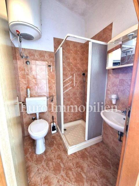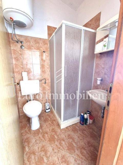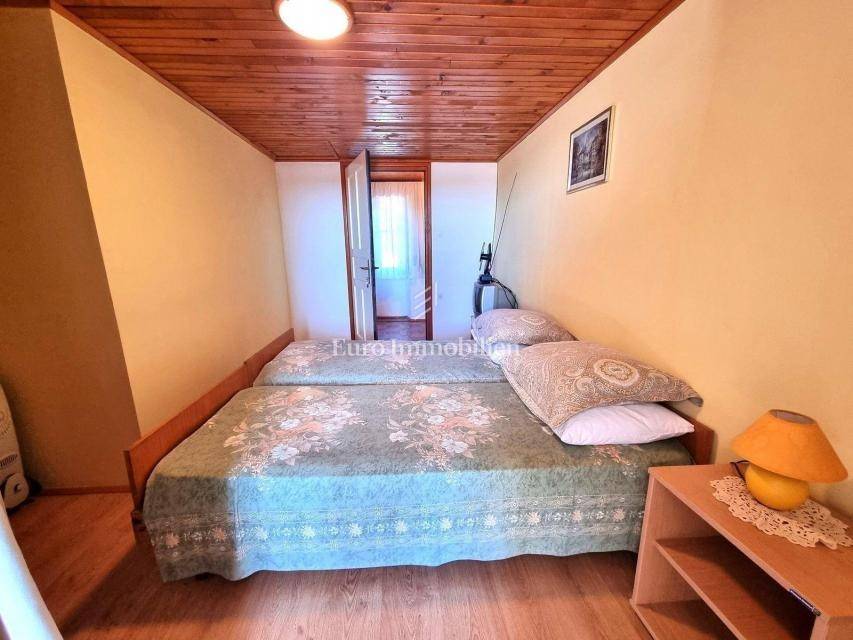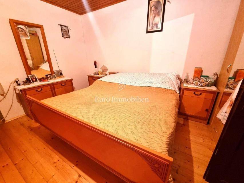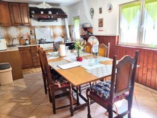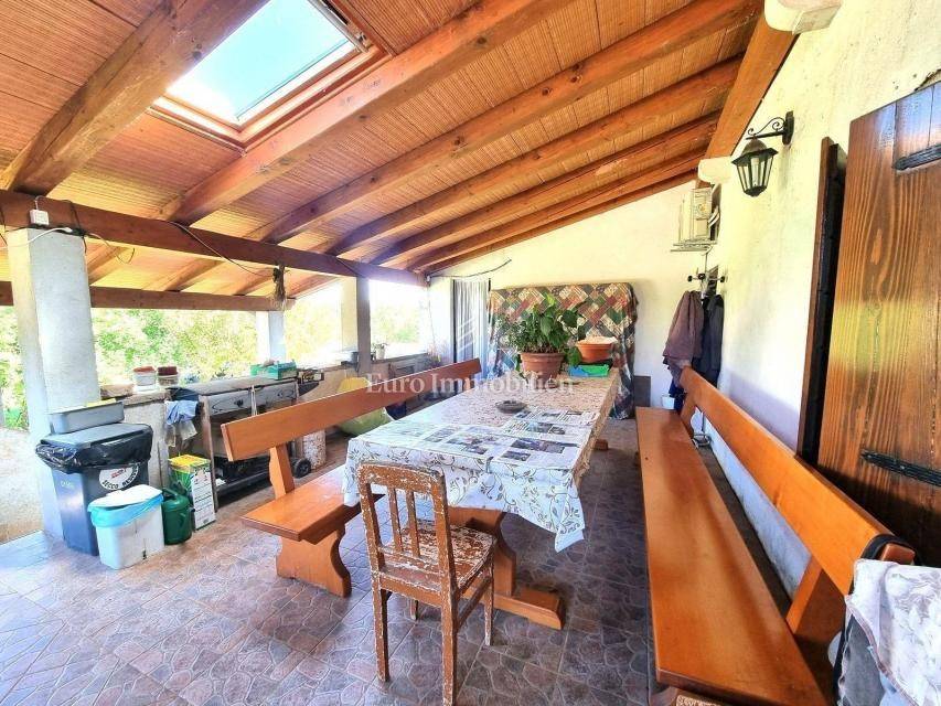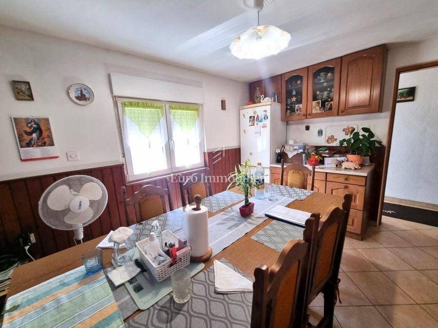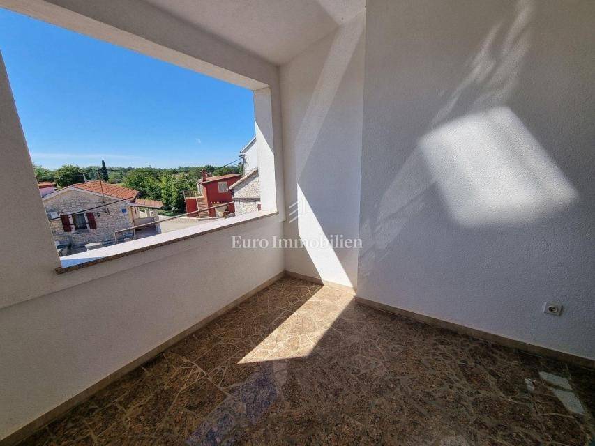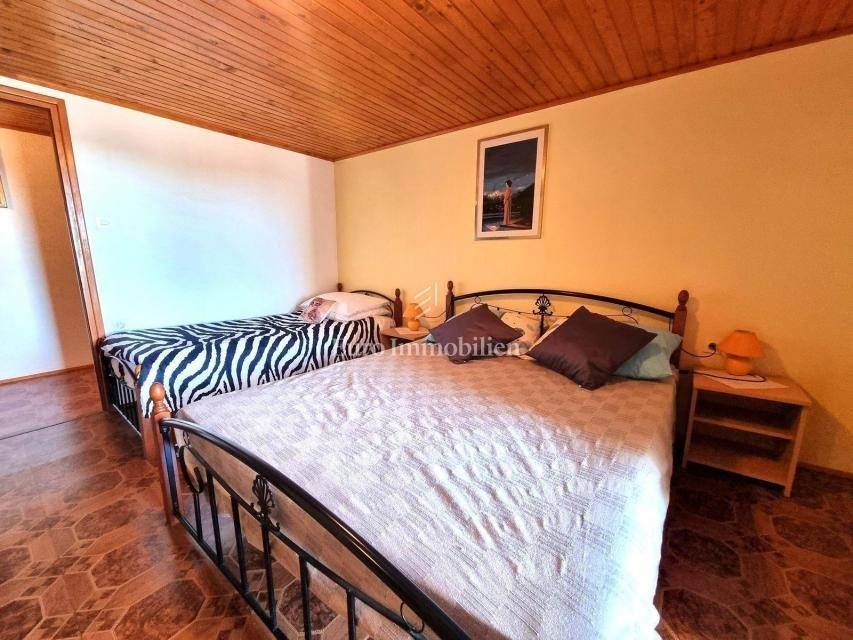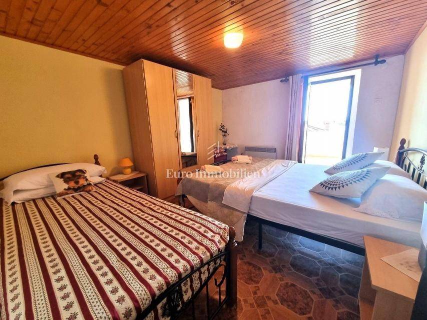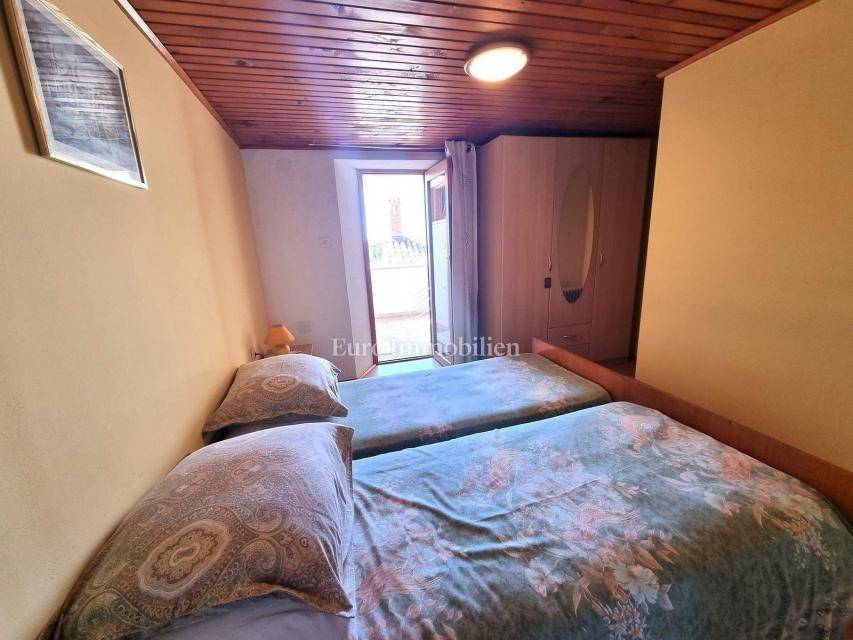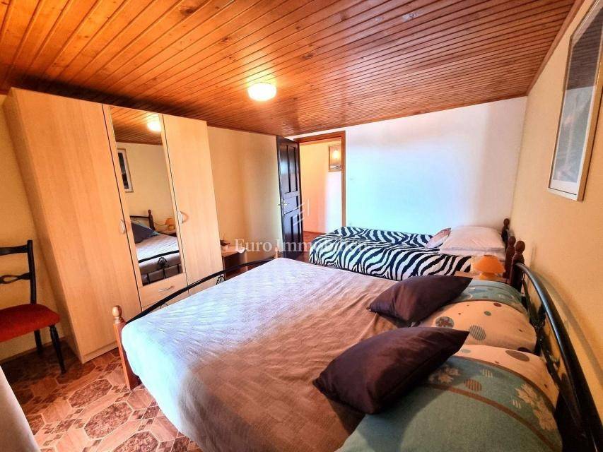 In a small Istrian village, on the edge of the construction zone, there is a family house of net 320 m2. It is attractive because it has approx. 2300 m2 of construction land on which additional buildings, vacation homes, etc. can be built. The house itself consists of a ground floor, 1st and 2nd floor. On the ground floor there is only a storage room and a large tavern. The external stairs lead to the first floor where there is a kitchen with a dining room, a living room, a bathroom, a bedroom, another kitchen and an ironing room through which you can go outside to a spacious covered terrace of 34 m2 with access to the rear garden of approx. 2300 m2. Internal stairs lead to the first floor where there are three more bedrooms and three bathrooms. Each room has its own loggia/balcony. The house needs adaptation since it was built a long time ago and renovated in 1978. It can also be an opportunity as a facility for housing workers, given the large number of rooms, bathrooms, rooms, terraces and the like. Heating is regulated by electric radiators, air conditioning and wood. The carpentry is PVC on the first floor, and wooden on the second. Nearby there is a famous restaurant and several attractive villas with swimming pools. The location is extremely quiet, autochthonous and only a few km from Vižinada.