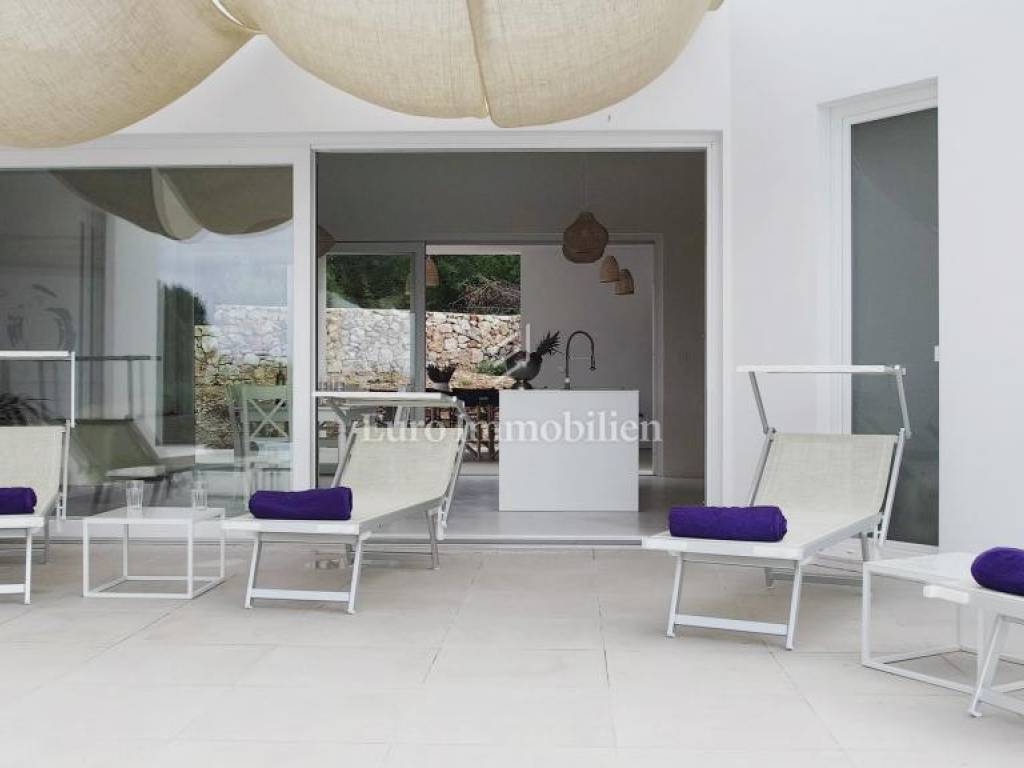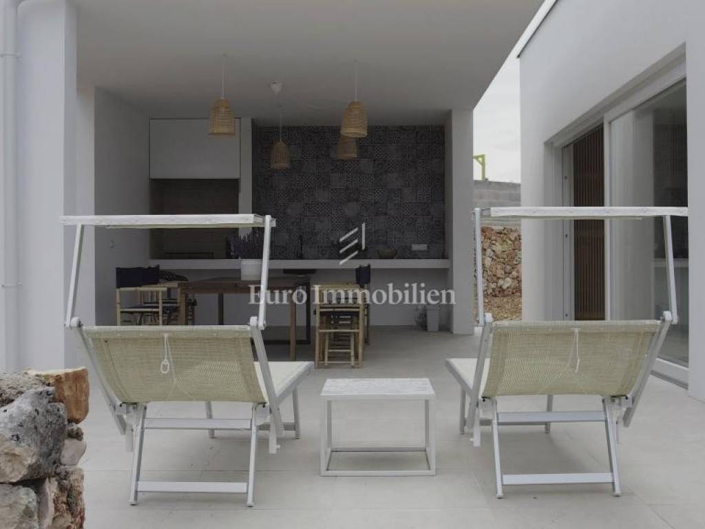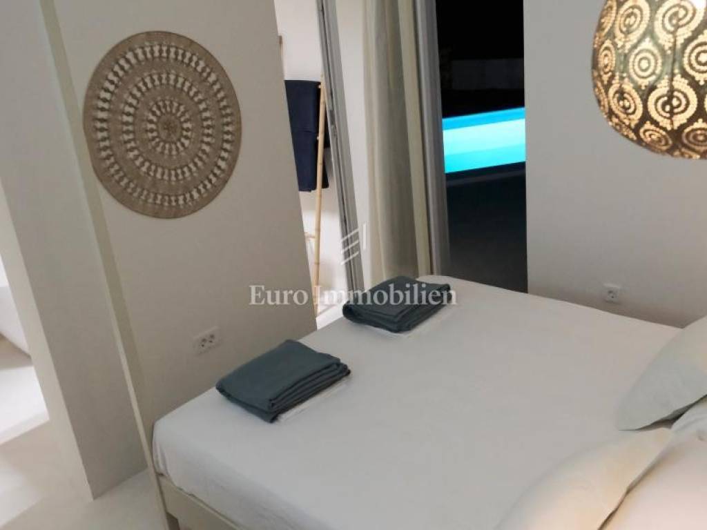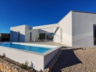A detached house with a net living area of 111 m2 is located on a plot of 700 m2. In the central part of the house there is a spacious living room, kitchen and dining room with access to a covered terrace on one side, and on the other side access to the sun deck and swimming pool (10 x 3). In the right wing of the house there is a bedroom with its own bathroom, toilet and storage room. In the left wing there are two bedrooms with their own bathrooms. During the construction, modern materials and equipment are used, such as high-quality ceramic tiles and sanitary ware, PVC carpentry, burglar-proof doors and underfloor heating are installed, and air conditioners are also installed. Two parking spaces are available.
