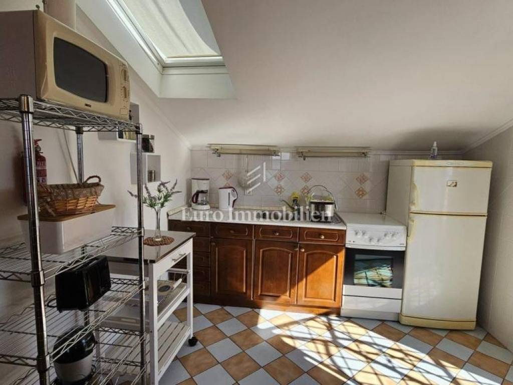 The ground floor of the house consists of three bedrooms (one is used as an office), two bathrooms, a kitchen and a living room, and a covered terrace with a view of the sea. This unit is equipped with central heating and air conditioning.