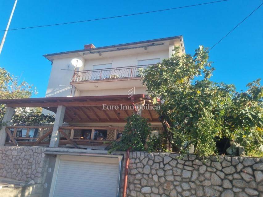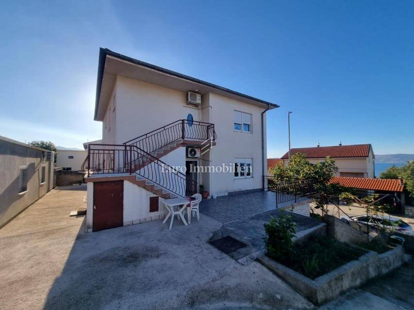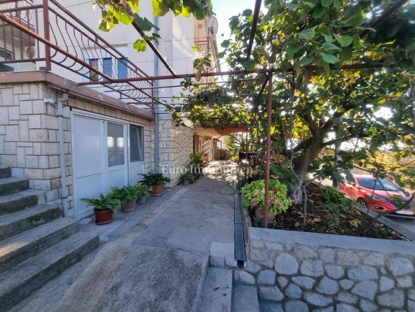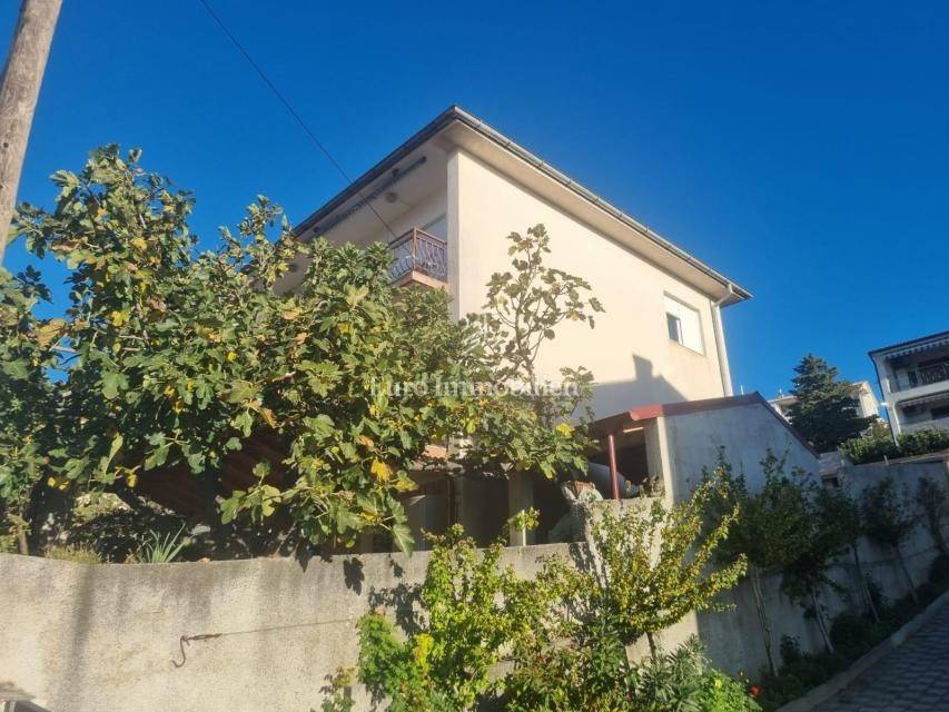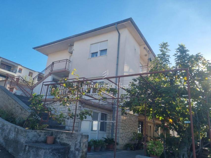 A detached house is for sale on a plot of 925m2. On the ground floor of the house there is an apartment consisting of a living room with a kitchen, two bedrooms, both with their own bathroom and a large terrace. On the first floor there is an apartment with three bedrooms, two bathrooms, a kitchen and a living room with access to a terrace or balcony. On the second floor there is an identical apartment with three bedrooms, two bathrooms, a kitchen and a living room and a balcony with a beautiful view of the sea. The house is fully furnished and air-conditioned, and central heating with heating oil is used for additional heating. Inside the garden there is a building with two apartments with a total area of 50m2. The spacious garden allows parking for several cars and the possibility of building a swimming pool and additional facilities. The property is in an excellent location due to the proximity of all necessary facilities.