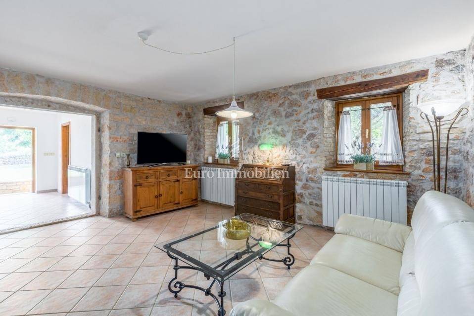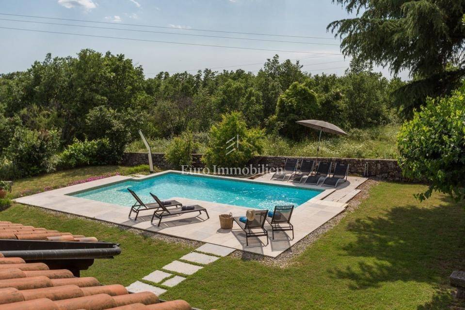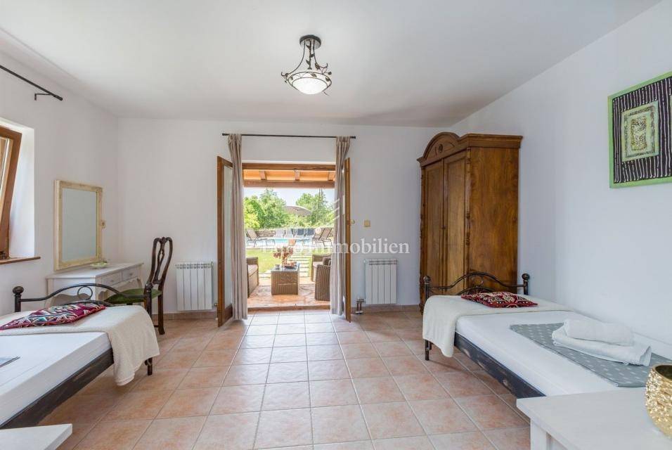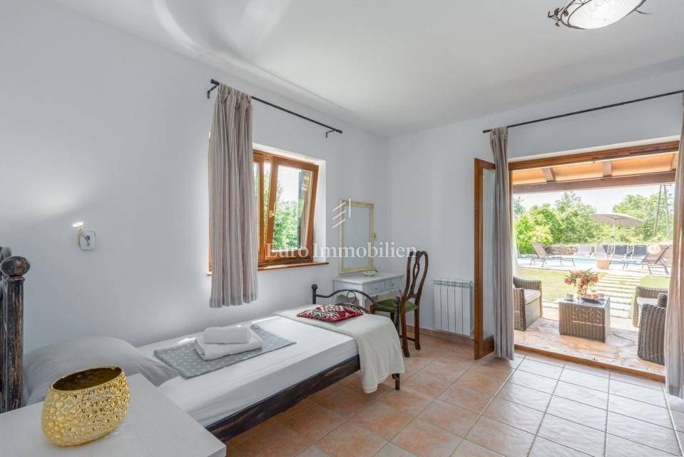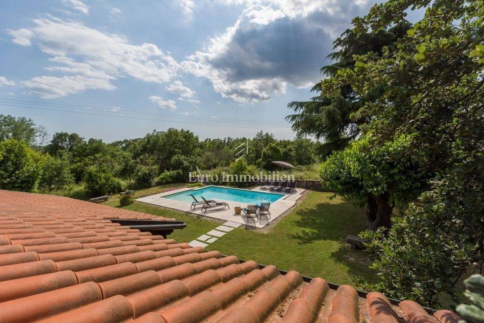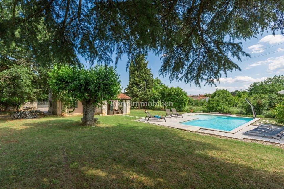 A charming stone villa is located on the edge of the construction zone of a small Istrian autochthonous village not far from Poreč (12 km). It was built before 1968, but completely renovated in 2009. It is surrounded by nature and has a spacious garden of 1430 m2. At the entrance to the garden, it is adorned with a century-old oak tree. The house consists of two floors. On the ground floor there is an entrance hall, bathroom, living room, dining room, bedroom and kitchen. All rooms on the ground floor have communication with the garden, and the kitchen also has an exit to the summer kitchen located in the side part of the house. There is a fireplace in the living room, as well as in the summer kitchen. On the first floor there are two more bedrooms and one bathroom, as well as a spacious covered terrace. In the garden there is a 32 m2 swimming pool with an addition for children (shallow water), shower, garden house, summer kitchen with a space for socializing, parking spaces, and a spacious green area. The entire garden is fenced. Heating is regulated by a central gas system and a fireplace, while air conditioning is used for cooling. There is also a central hot water boiler. The facade was renovated 3 years ago. The house is ideal for tourist rental, but since it has a central heating system, it is also suitable for year-round living. The property is available immediately!