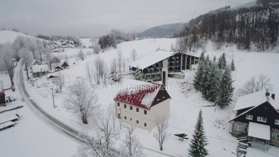 A hotel is for sale in Gorski kotar, located in the village of Begovo Razdolje, on a spacious plot of 8,897 m². The hotel has a net usable area of 2,217.88 m² and consists of 42 double rooms. It was built in 1979, and the last renovation was carried out in 2009.