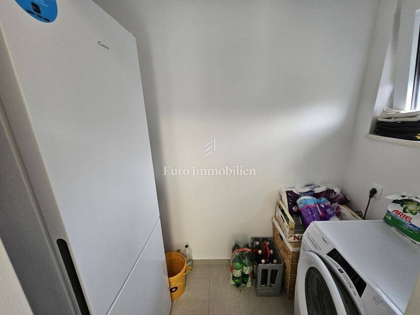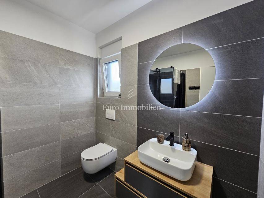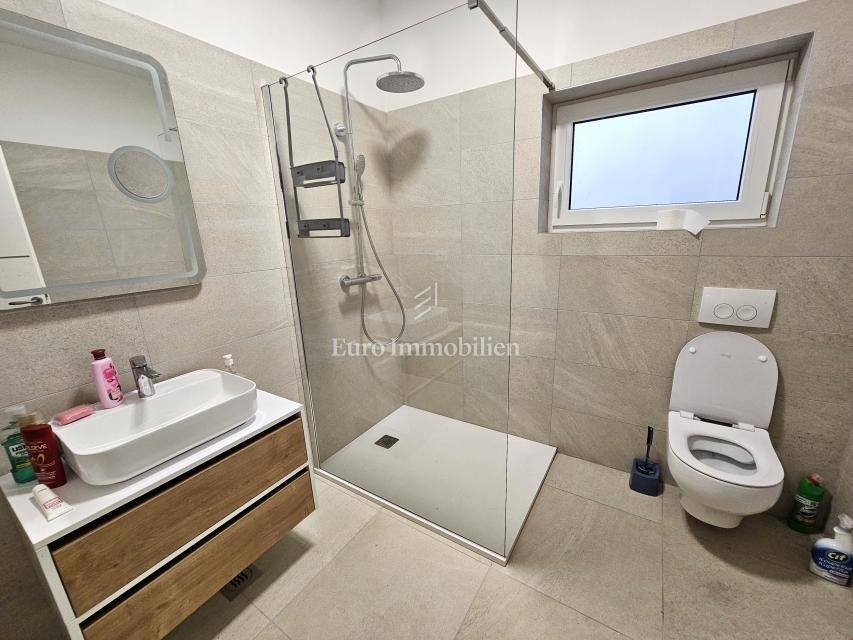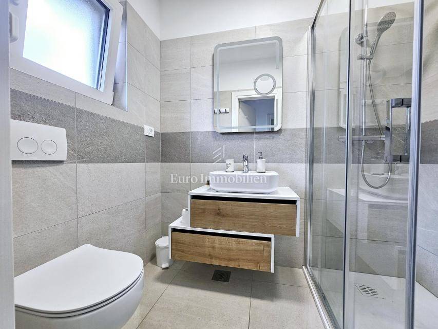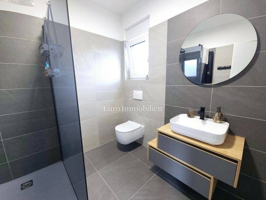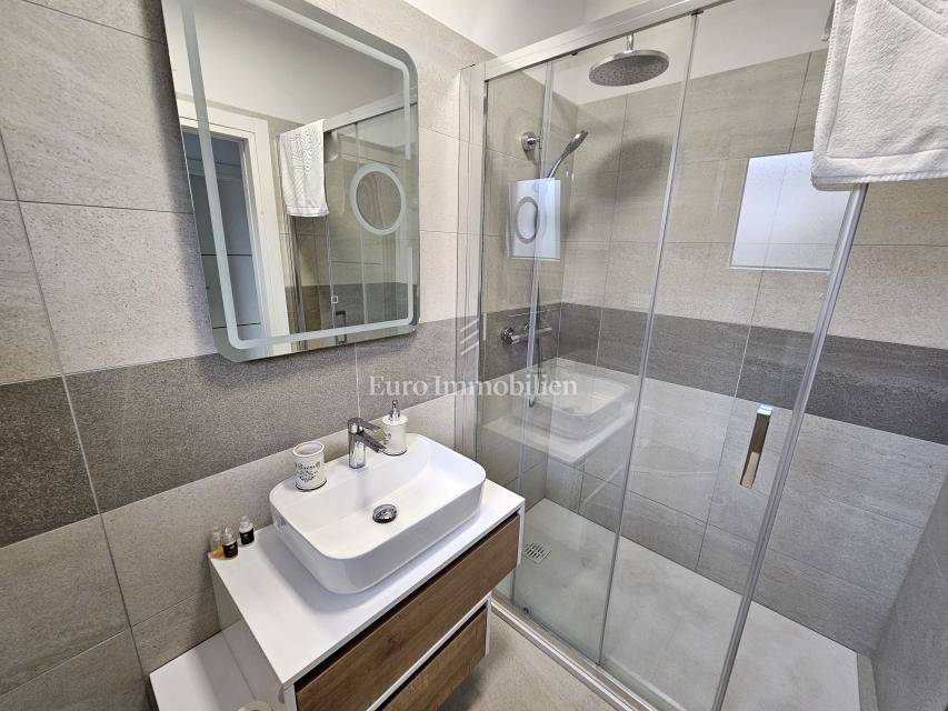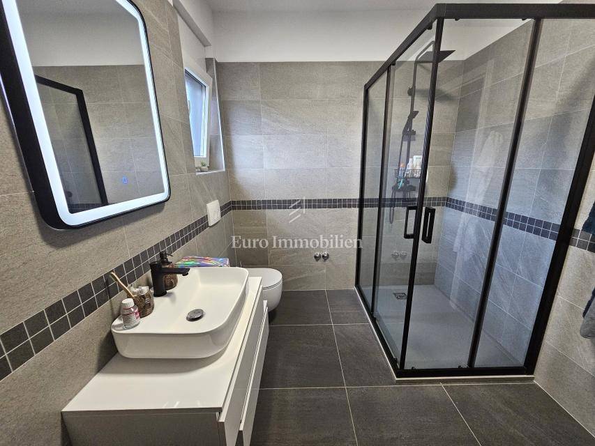The house with a total living area of ​​198.11 m2 with a terrace on the ground floor of 18.11 m2 and a balcony on the first floor of 24.18 m2 extends over two floors, ground floor and first floor. It has two entrances, one is through the garage, and the other is through the outside stairs. On the ground floor there is a garage, a storage room and a tavern (konoba), which is decorated as a studio apartment with a bathroom, a terrace and its own entrance. Internal stairs lead to the upper floor, which is divided into two parts. The first part is larger and consists of two bedrooms, a bathroom, a kitchen with a dining room and a living room, and a balcony. The second part is smaller, designed as a studio apartment with a bathroom and mini kitchen. In front of the house is a beautifully landscaped garden of 222 m2. Parking for three vehicles is available.
