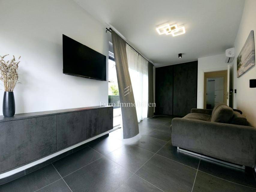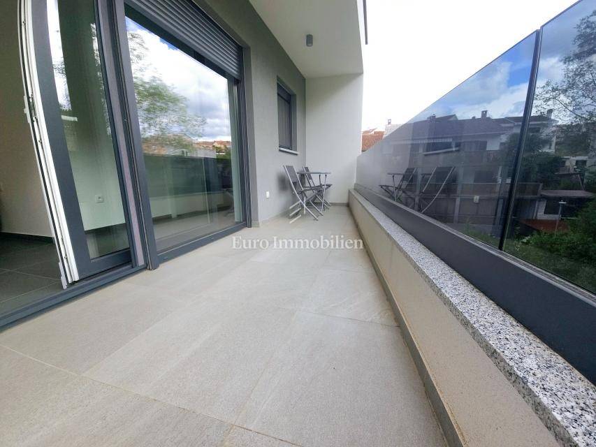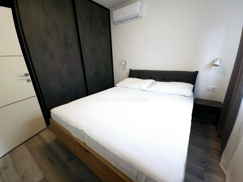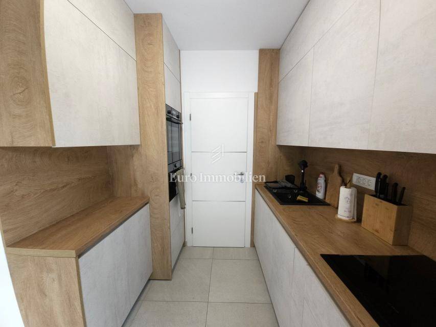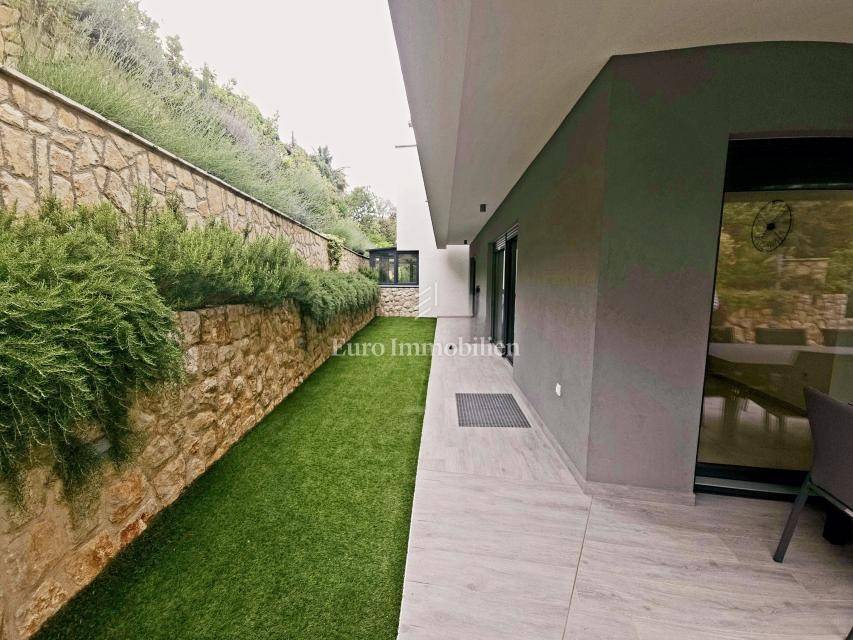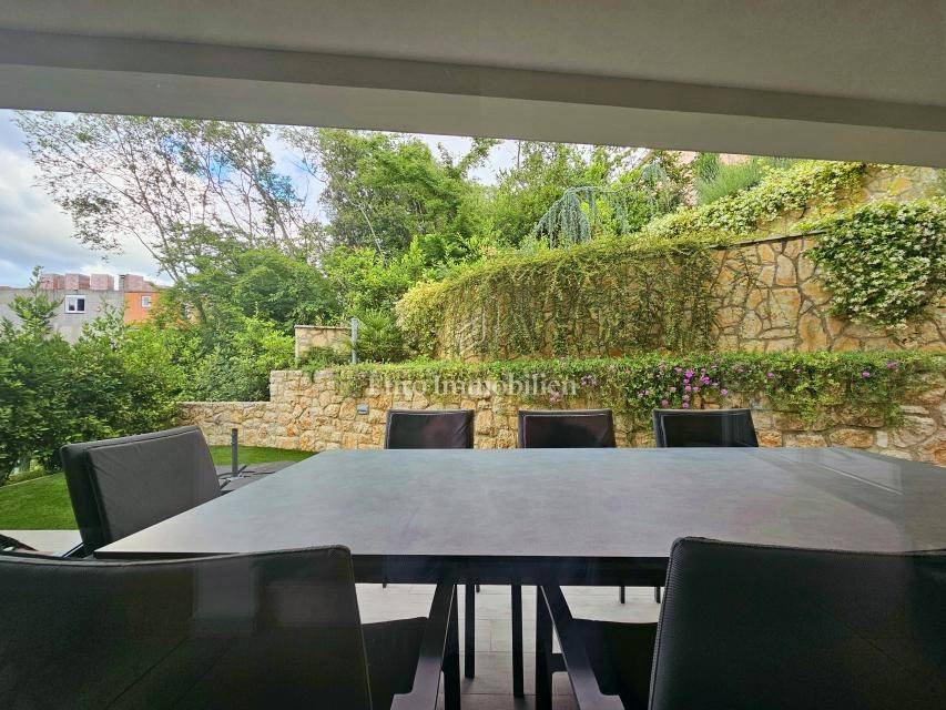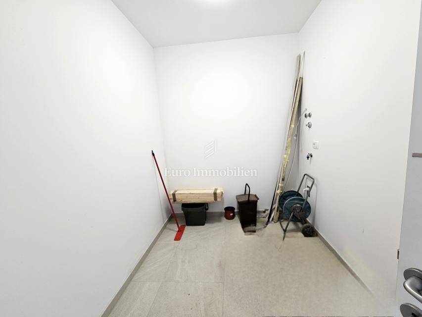 The house with a total living area of ​​198.11 m2 with a terrace on the ground floor of 18.11 m2 and a balcony on the first floor of 24.18 m2 extends over two floors, ground floor and first floor. It has two entrances, one is through the garage, and the other is through the outside stairs. On the ground floor there is a garage, a storage room and a tavern (konoba), which is decorated as a studio apartment with a bathroom, a terrace and its own entrance. Internal stairs lead to the upper floor, which is divided into two parts. The first part is larger and consists of two bedrooms, a bathroom, a kitchen with a dining room and a living room, and a balcony. The second part is smaller, designed as a studio apartment with a bathroom and mini kitchen. In front of the house is a beautifully landscaped garden of 222 m2. Parking for three vehicles is available.