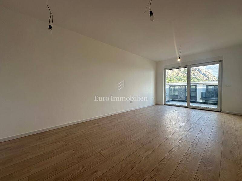 The apartment is located on the fourth floor of a residential building, has an area of 66.17 m2 and consists of two bedrooms, a kitchen and a living room with a dining room, a bathroom, a toilet and a balcony of 7.60 m2 with sea view.