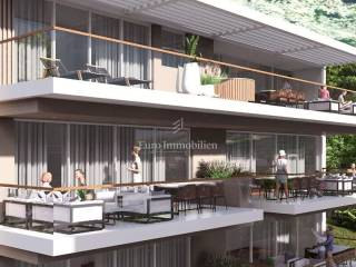 An attractive new development project in Tučepi, located just 130 meters from the sea and beautiful beaches. The project includes two urban villas with elevators and a total of 12 apartments. Each villa consists of a basement with garage spaces (available for purchase at €20,000), a ground floor, and three upper floors. Construction features top-quality materials: premium thermal and sound insulation, first-class ceramic tiles throughout, PVC windows with electric shutters, security entrance doors, SmartHome systems, air conditioning in all rooms, and bathrooms with floor heating and high-end ceramics.