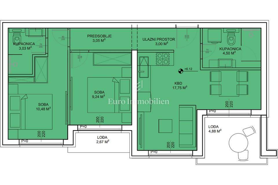 The apartment consists of a main entrance that leads to the common living areas: the kitchen, dining room, and living room, which opens onto a spacious loggia. The apartment has two bedrooms, one of which has its own en-suite bathroom, as well as an additional shared bathroom.
