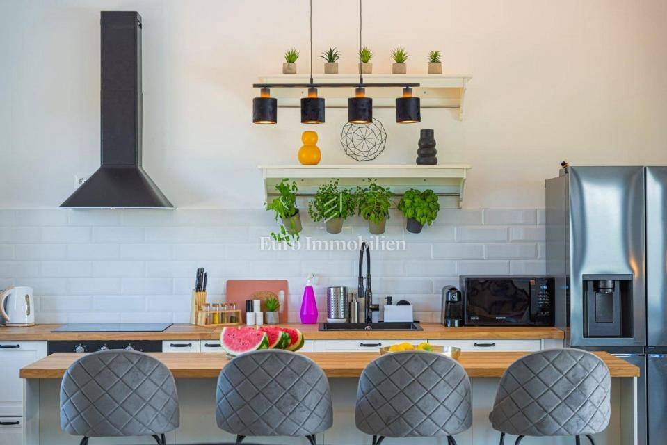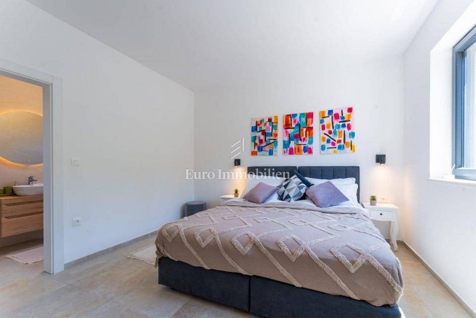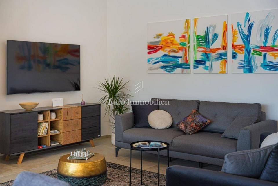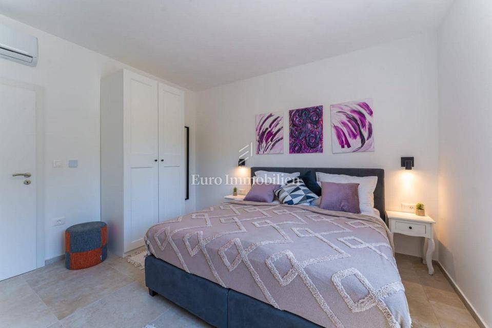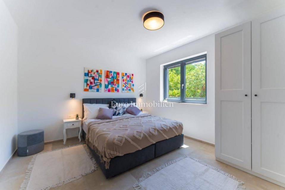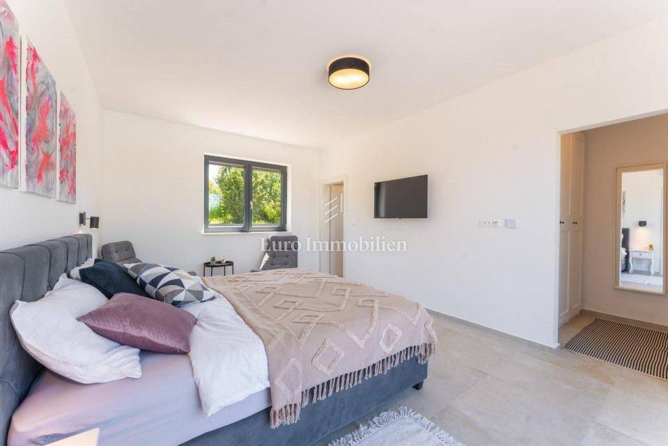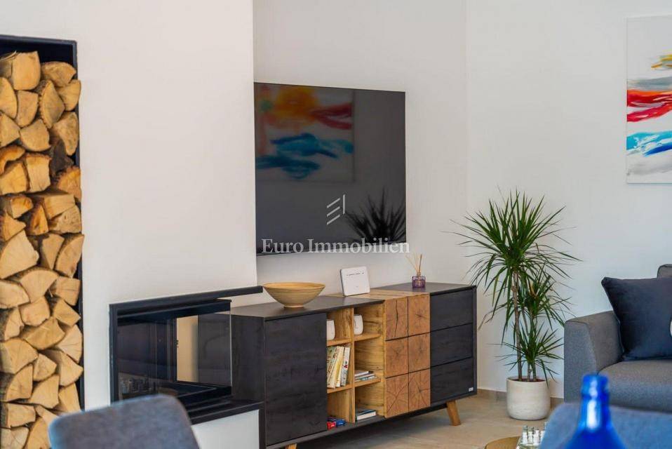 The house extends to the ground floor, and is located on a beautifully landscaped garden area of 845 m2, and consists of a kitchen with dining room and living room, three bedrooms - each with its own bathroom, toilet and laundry room. The living room, which has a lot of natural light due to the large glass wall, opens onto a covered terrace. In the garden there is a swimming pool 9 m x 5 m with a sun deck and parking for several vehicles. The house is equipped with air conditioners in every room, as well as high-quality and modern furniture. Underfloor heating was installed throughout the house via a heat pump, and a fireplace was installed as an additional source of heating in the living room. There is a possibility of building a covered gazebo with a barbecue.