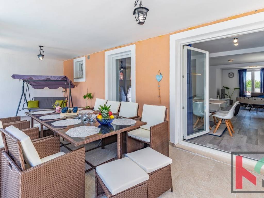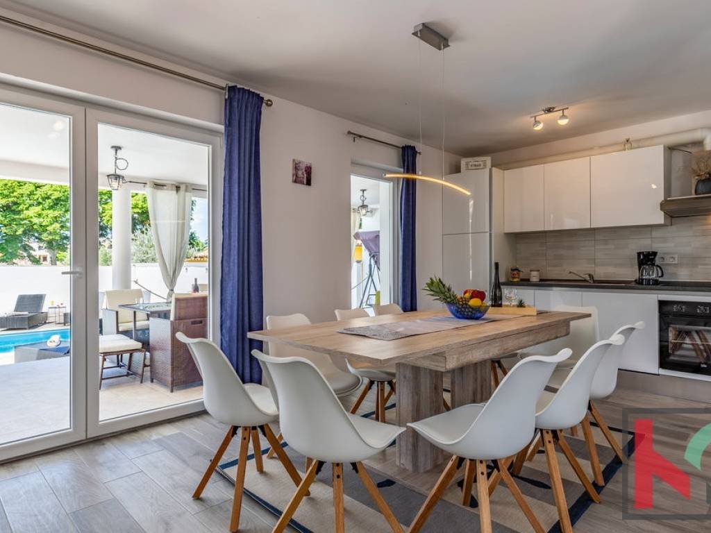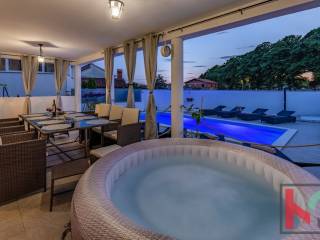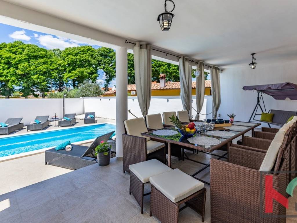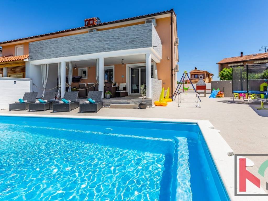 Na jugoistočnom dijelu istarskog poluotoka, u općini Marčana, u blizini svih sadržaja za miran obiteljski život ili ugodan turistički boravak smjestila se ova interesantna kuća za odmor sa bazenom na zemljištu ukupne površine 495 m2.