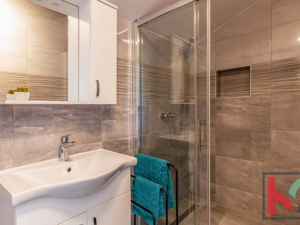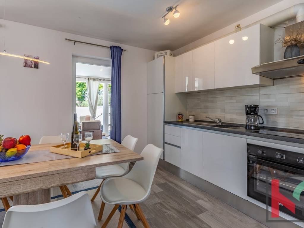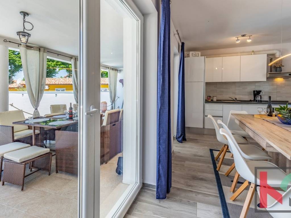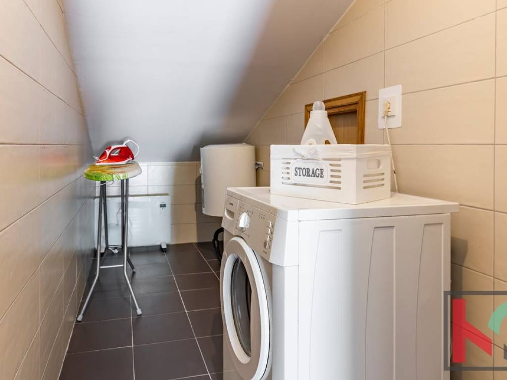 Kuća je kvalitetno građena u svrhu turističkog najma te obiteljskog života izvan sezone. Razigranog je tlocrtnog rasporeda. U prizemlju se nalazi ulazni hodnik, jedna kupaonica, komforan dnevni boravak otvorenog tipa povezan sa kuhinjom i blagovaonom odakle se izlazi na prostranu, natkrivenu terasu i uređenu okućnicu sa bazenom.