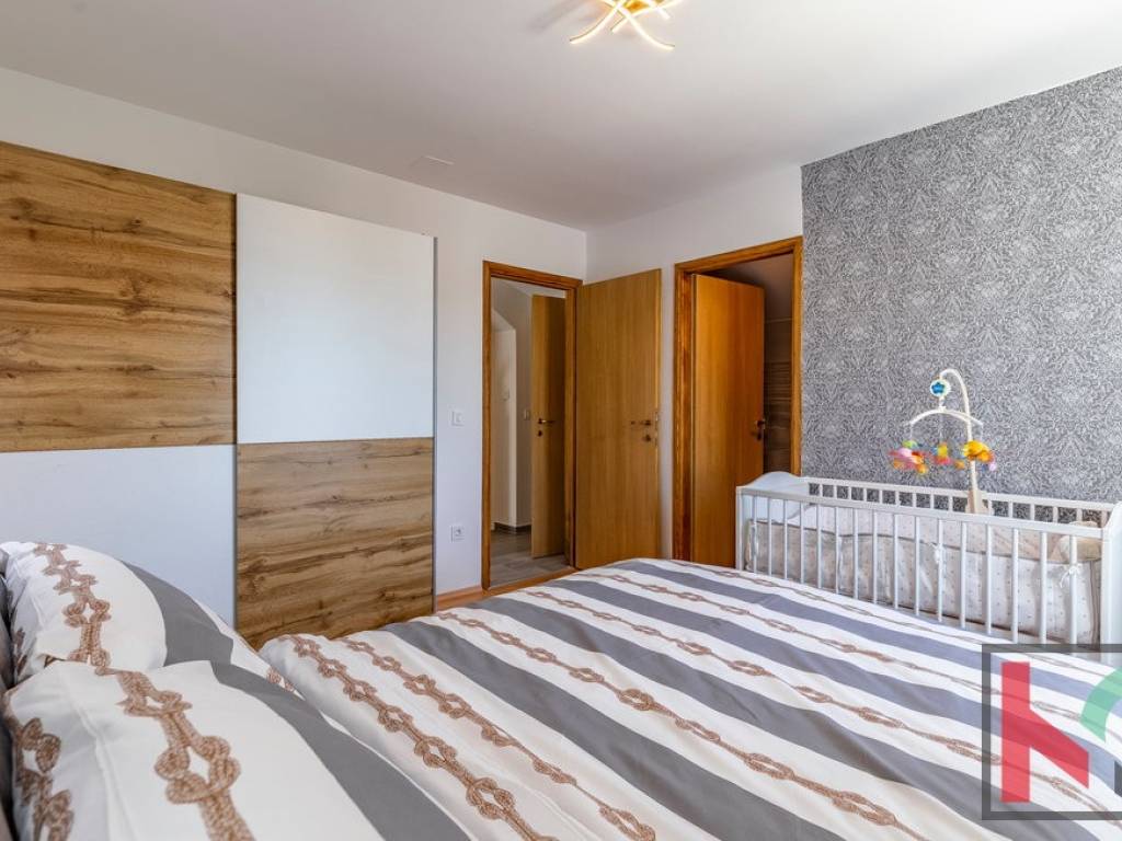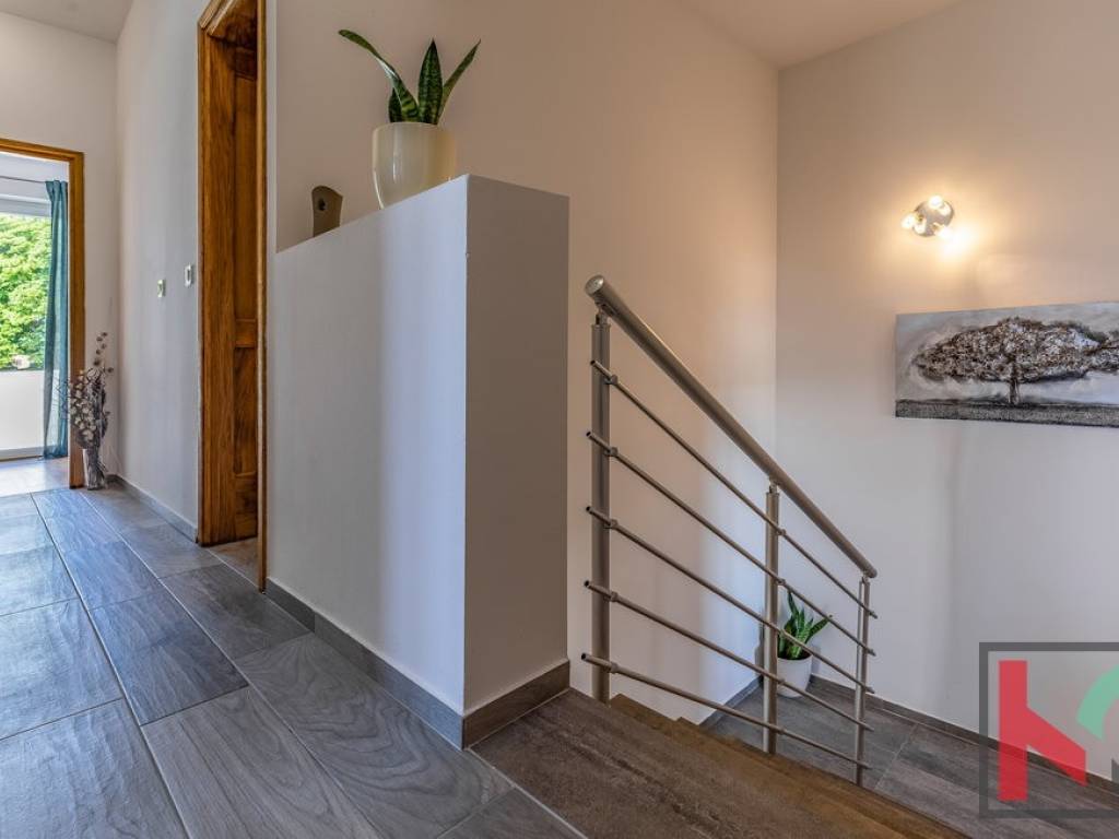 Unutranjim stepeništem dolazimo na međukat gdje se smjestila jedna spavaća soba sa balkonom, Na prvom katu se nalazi jedna ostava koja služi u svrhu praonice rublja, jedna spavaća soba sa vlastitom kupaonicom, još jedna kupaonica te dvije spavaće sobe sa izlazom na prostranu terasu sa lijepim pogledom. U suterenu kuće, ispod međukata smještena je garaža do koje možemo doći i unutarnjim stepeništem.