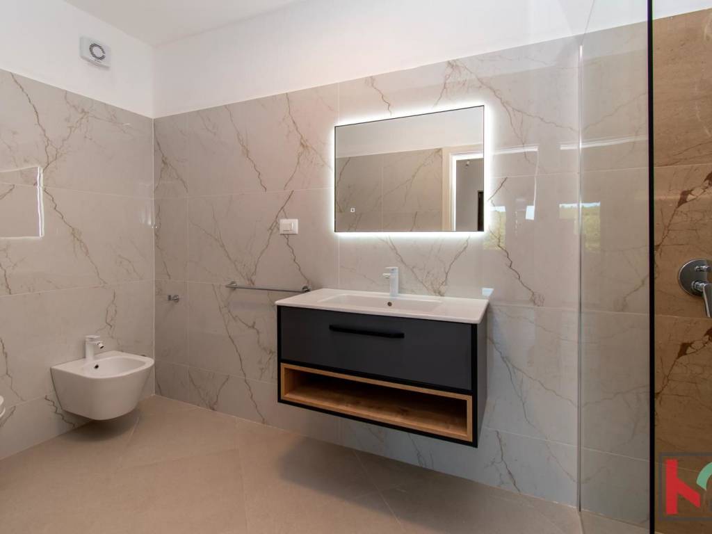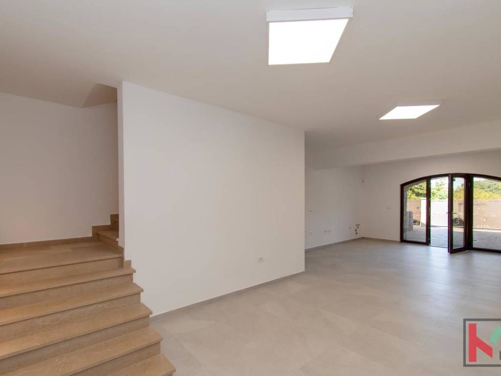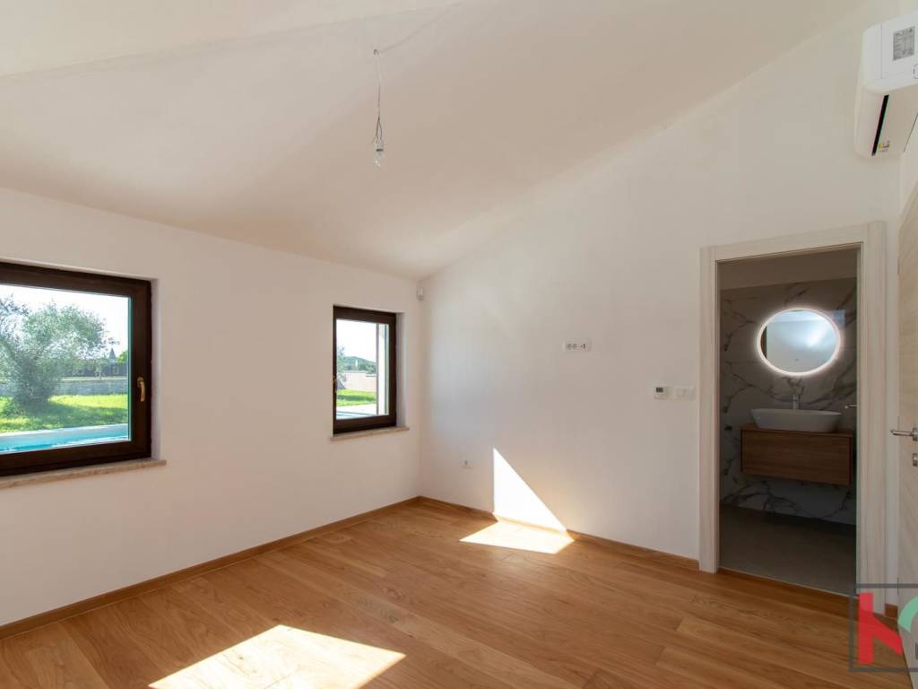 Na prvom katu smješten je ulazni prostor, tri prostrane spavaće sobe s vlastitim kupaonicama, elegantan dnevni boravak otvorenog koncepta povezan s kuhinjom i blagovaonicom te izlaz na sunčalište i bazen.