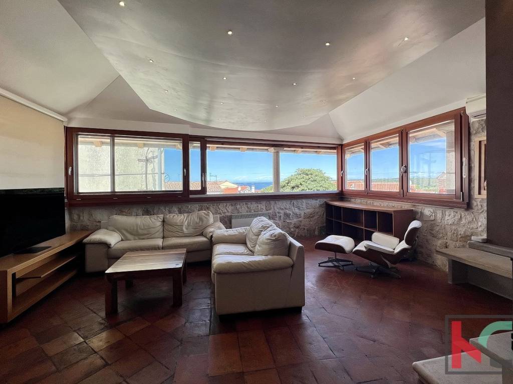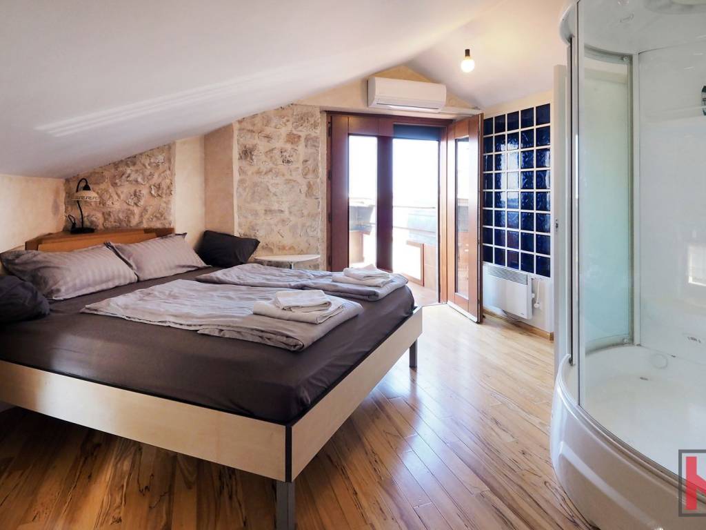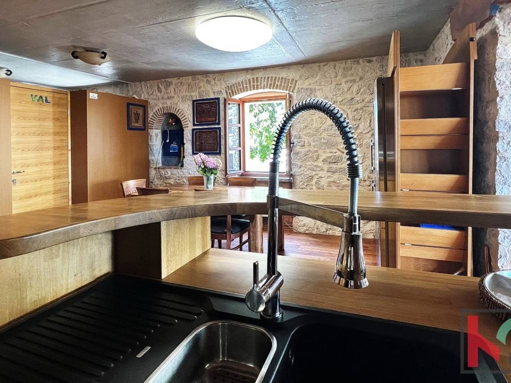 Na prodaju je obnovljena stambeno poslovna dvojnica (nekada dvije kuće) smještena u samom centru Funtane, na iznimno atraktivnoj lokaciji koja omogućuje lagodan život na korak od svih sadržaja – trgovina, restorana, mora i svakodnevnih potreba. Rekonstruirana je po restauratorskim principima i pretvorena u samostojeću kuću pri čemu je zadržan duh tradicijske građanske kuće sa naglaskom na atraktivni izgled interijera i eksterijera. Prednost ove kuće su dva odvojena ulaza u stambeni i poslovni dio. Sam stambeni dio ima ulaz sa malog atraktivnog dvorišta na istočnoj strani raspoređeno u tri etaže (pr+kat+pot) od ukupno 145 m2. Sastoji se od ulaznog dijela, stepeništa, kuhinje sa blagovaonom iu komunikaciji sa dnevnim boravkom, toalet, spavaće sobe te u potkrovlju još dvije spavaće sobe i kupaonica. Posebnu vrijednost stambenog prostora ima prostrani dnevni boravak koji je u potpunosti ostakljen, okupan prirodnim svjetlom tijekom cijelog dana. Iz boravka se pruža prekrasan, otvoren pogled koji prostoru daje osjećaj prozračnosti, topline i ugode – idealno mjesto za opuštanje i druženje.