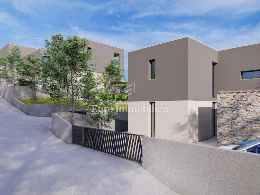 The complex of six villas is located on elevated ground with an open view of the sea. All villas consist of a ground floor and a first floor. The ground floor consists of a living room with dining room and kitchen, one bedroom with bathroom and toilet. From the ground floor, you enter the villa and exit to the outdoor covered terraces, gardens and sunbathing areas, and the covered summer kitchen. The first floor is connected to the ground floor by a closed staircase, there are three bedrooms with private bathrooms and covered terraces. The villas also have a flat impassable roof. There are swimming pools with sunbathing areas in the yard. Each villa has two parking spaces.