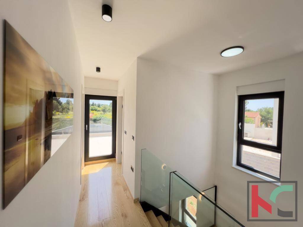 The house consists of a comfortable living room with a dining area, kitchen, toilet, and storage room on the ground floor, as well as three bedrooms with bathrooms and two large terraces on the upper floor. Orientation to the south, east, and west ensures plenty of natural light throughout the day. The spaciousness and functionality of the space are further emphasized by access to the terrace and balcony, from which there is a sea view. The yard and landscaped garden allow for outdoor living and enjoying the sun, while the private pool adds an extra sense of luxury.