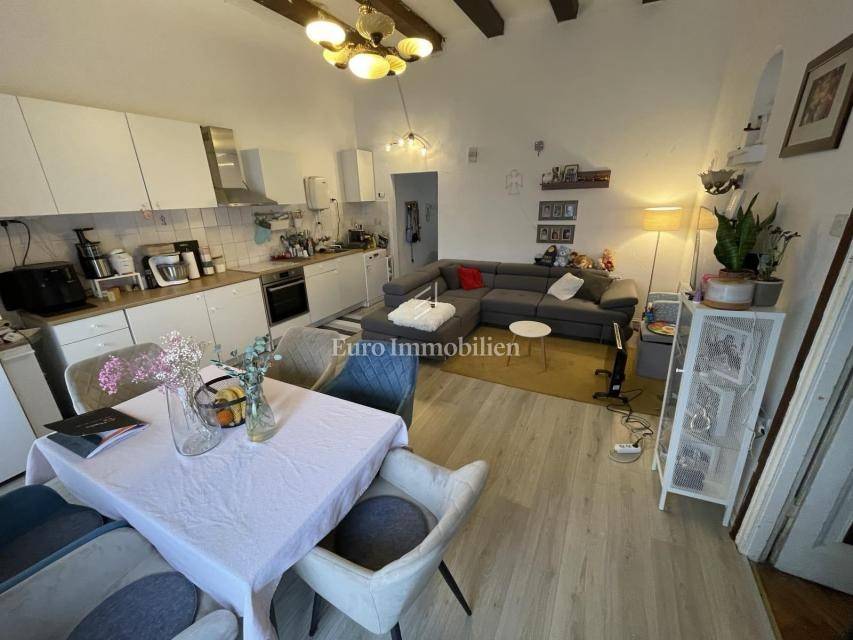 The apartment consists of two bedrooms, a spacious living room with kitchen and dining room, bathroom, hallway, and two pantries located outside the apartment, in the hallway in front of the entrance. The apartment also comes with a woodshed for additional storage. The apartment has been partially renovated, and the high ceilings (3.4 m) provide the possibility of creating an additional floor inside the apartment.