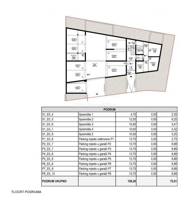 BASEMENT - 5 storage rooms (2.35 m2, 6.25 m2, 5.47 m2, 5.32 m2, 5.25 m2), covered parking space (2.75 m2), 7 parking spaces in the garage (7 x 6.88 m2))