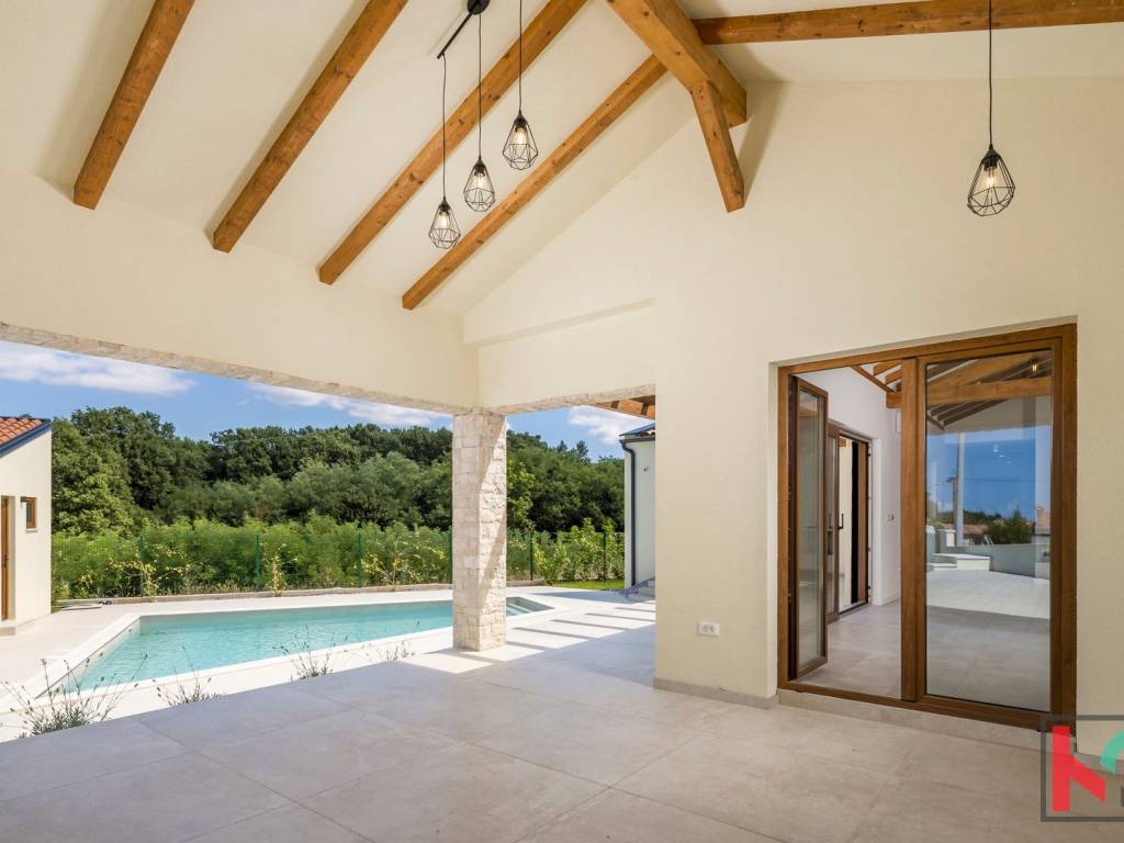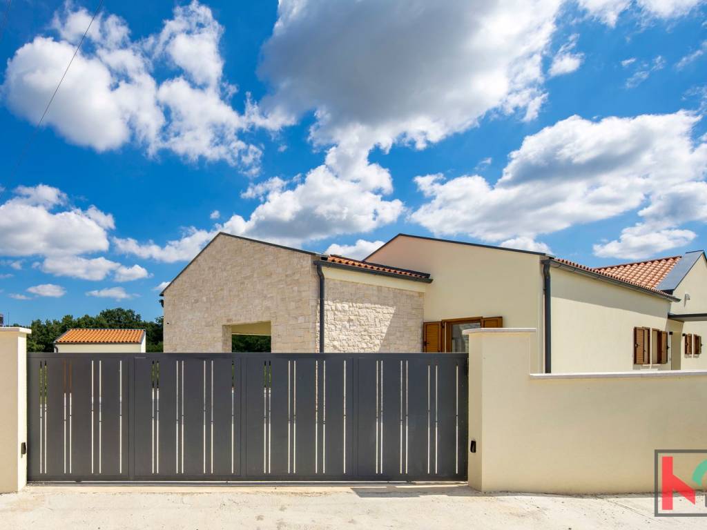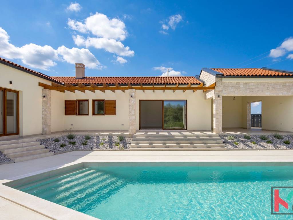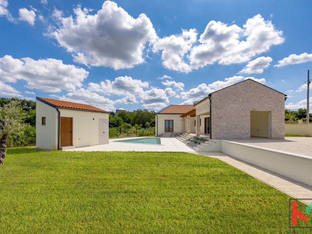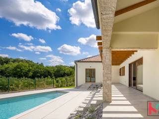 Kuća je smještena na parceli od 1002 m2 i nalazi se u mirnom i zelenom okruženju općine Tinjan.Koncept kuće je sljedeći a napravljen tako da nudi spoj komfora i funkcionalnosti: ulazno predsoblje, toalet, tehnička soba koja ima centrali kotao odnosno hidraulički sustav za distribuciju tople vode, hodnik koji razdvaja noćni i dnevni dio prostorija pa se tako sa desne strane kuće nalaze se 3 spavaće sobe 17-18m2,svaka sa predsobljem i garderobnim dijelom te svojim kupatilom od 5m2. Na lijevoj strani kuće nalazi dnevni boravak od 28 m2 te kuhinja i blagovaona od 24,75m2 a sve zajedno u otvorenom prostoru sa pogledom na terasu, bazen i zelenilo. Pored kuhinje izlaz je na natkrivenu ljetnu kuhinju veličine 22m2. Bazen od 42m2 je obložen svijetlom ,kvalitetnom keramikom i okružen je ugodno uređenim sunčalištem sa vanjskim tušem i toaletom.