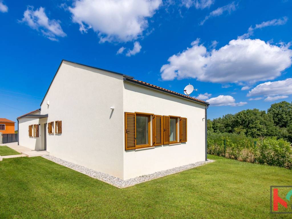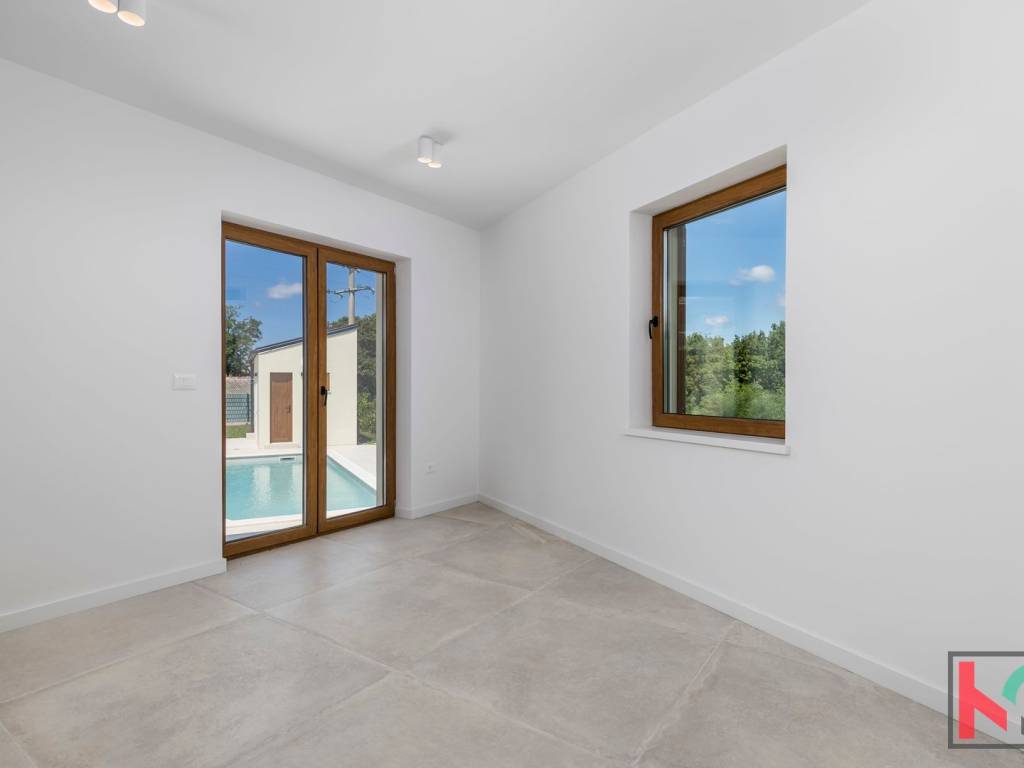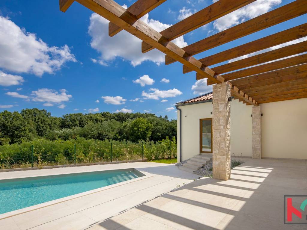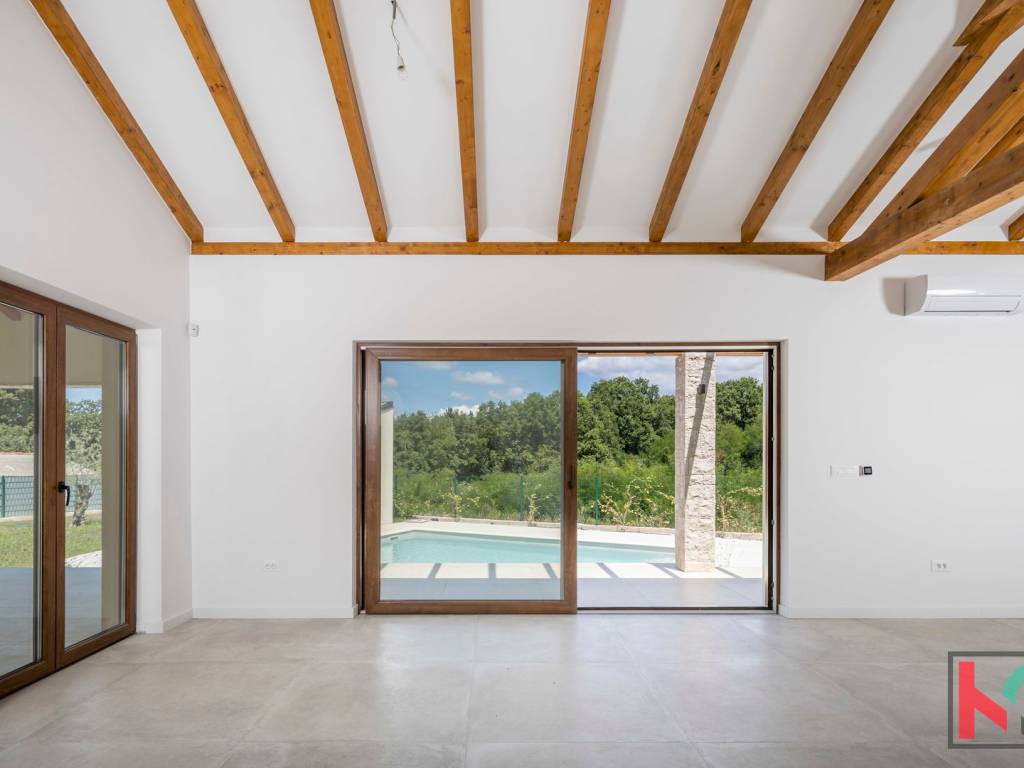 Kuća je smještena na parceli od 1002 m2 i nalazi se u mirnom i zelenom okruženju općine Tinjan.Koncept kuće je sljedeći a napravljen tako da nudi spoj komfora i funkcionalnosti: ulazno predsoblje, toalet, tehnička soba koja ima centrali kotao odnosno hidraulički sustav za distribuciju tople vode, hodnik koji razdvaja noćni i dnevni dio prostorija pa se tako sa desne strane kuće nalaze se 3 spavaće sobe 17-18m2,svaka sa predsobljem i garderobnim dijelom te svojim kupatilom od 5m2. Na lijevoj strani kuće nalazi dnevni boravak od 28 m2 te kuhinja i blagovaona od 24,75m2 a sve zajedno u otvorenom prostoru sa pogledom na terasu, bazen i zelenilo. Pored kuhinje izlaz je na natkrivenu ljetnu kuhinju veličine 22m2. Bazen od 42m2 je obložen svijetlom ,kvalitetnom keramikom i okružen je ugodno uređenim sunčalištem sa vanjskim tušem i toaletom.