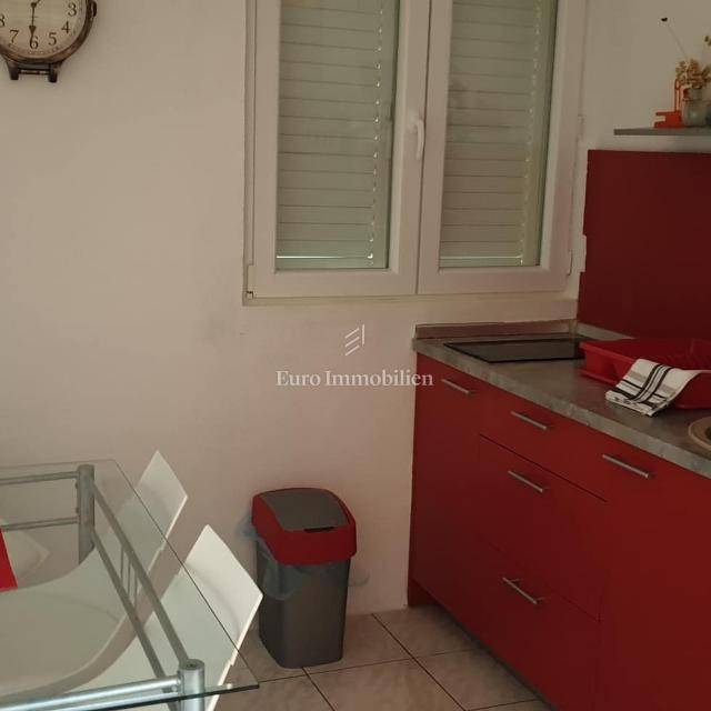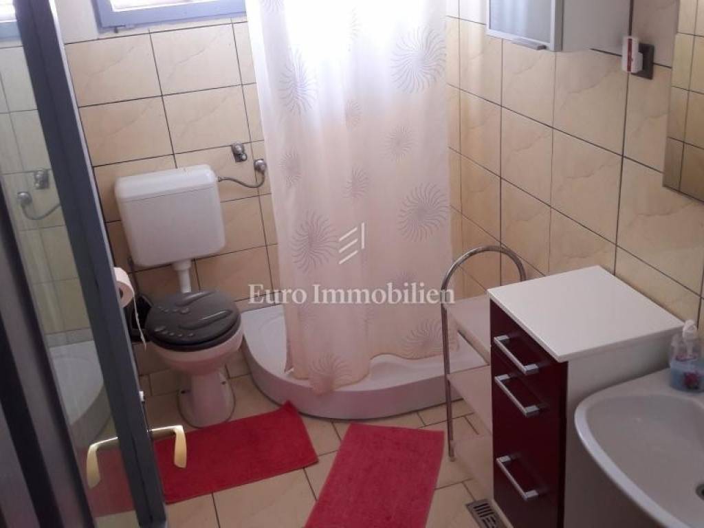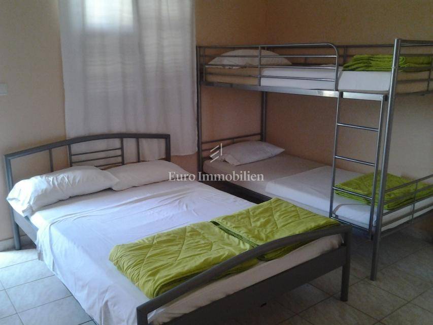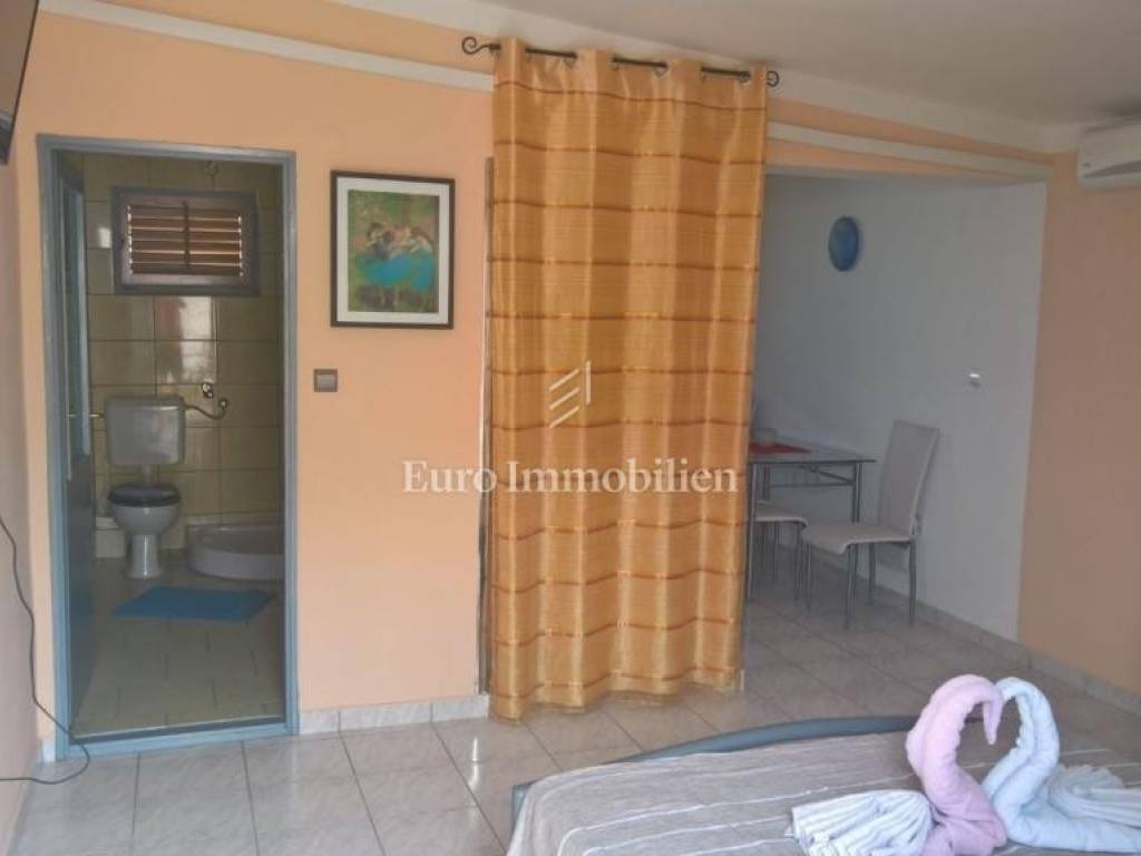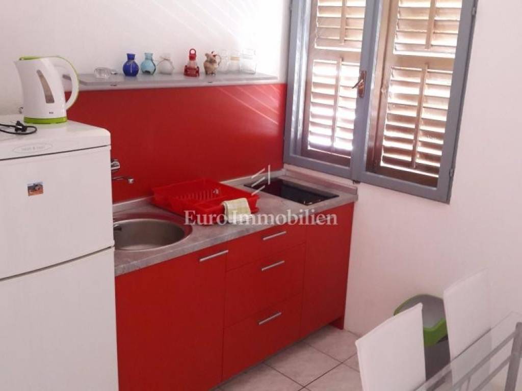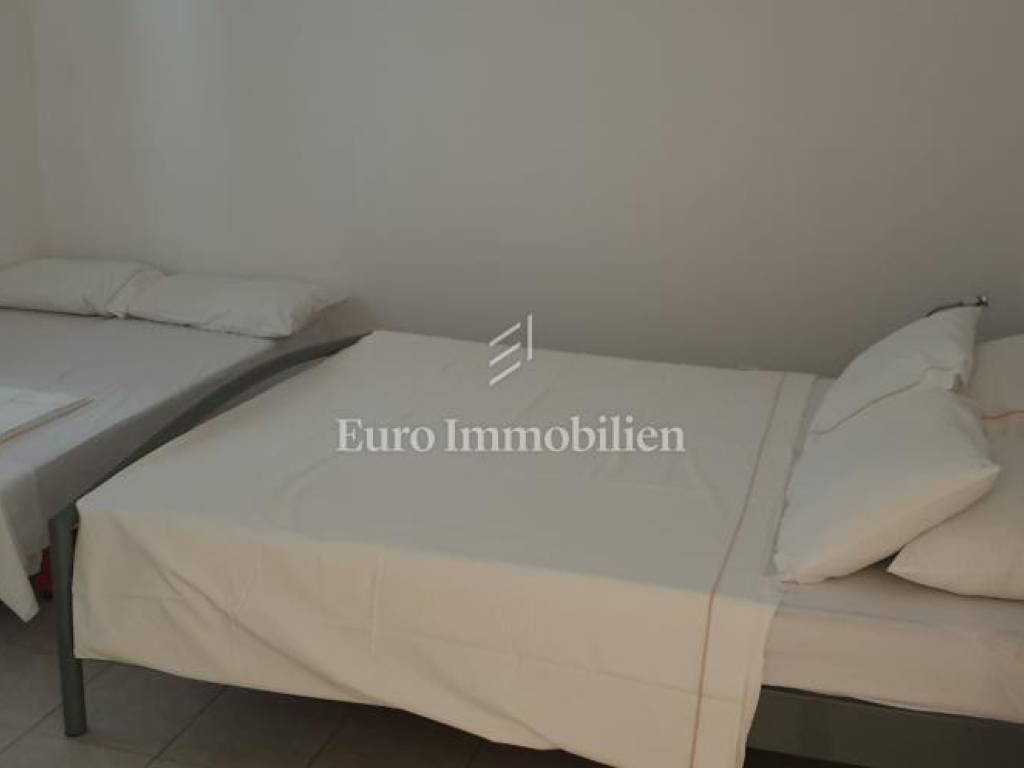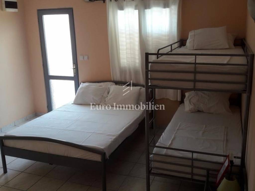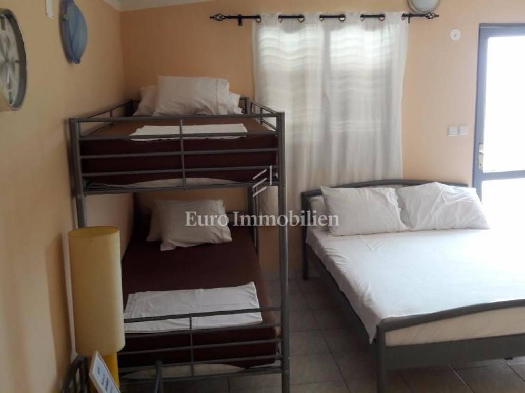 The house consists of a ground floor and an upper floor. On the ground floor there are two apartments: a two-room apartment with a net usable area of 55 m2 with a terrace of 16 m2 and a one-room apartment with a net usable area of 38.53 m2 with a terrace of 18 m2. On the first floor there are two one-room apartments with a net usable area of 25.76 m2 and 27.20.14 m2 and a beautiful uncovered terrace (40.92 m2) with a sea view. They consist of a kitchen, bedroom and bathroom.