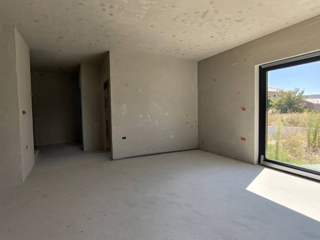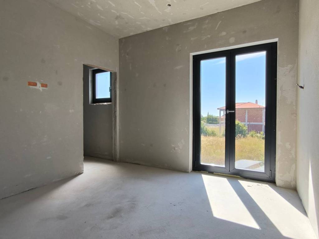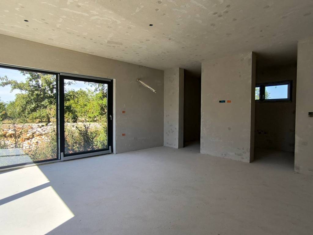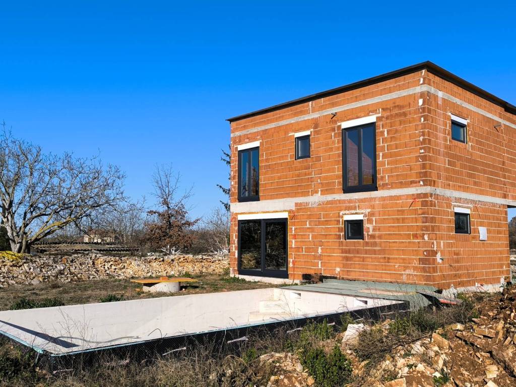 U kući je postavljeno podno grijanje, provedene su instalacije struje i vode i sve prostorije su ožbukane.