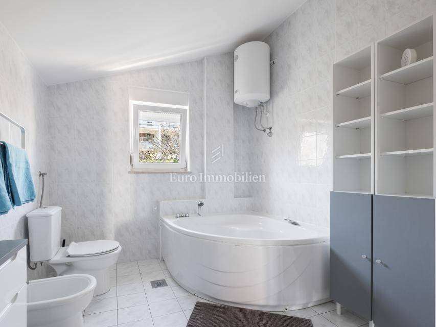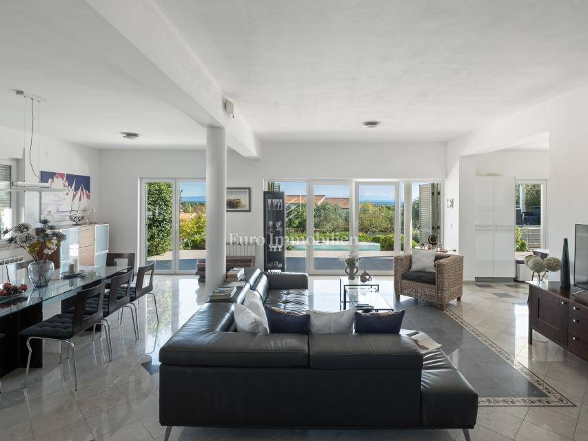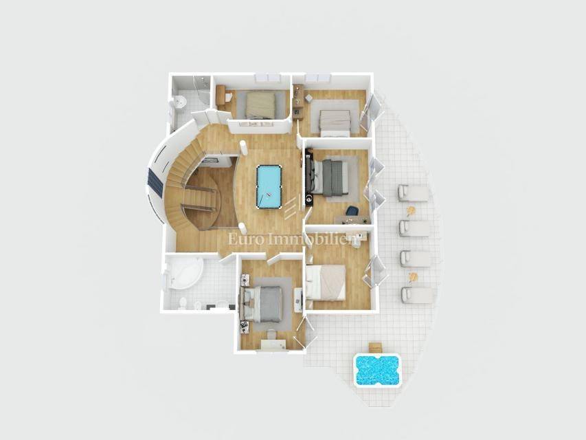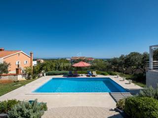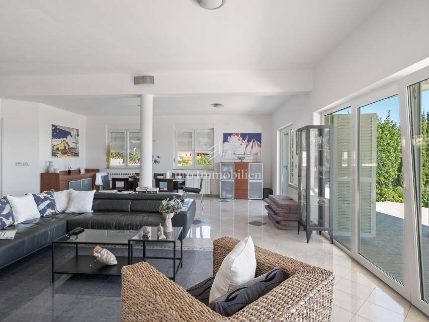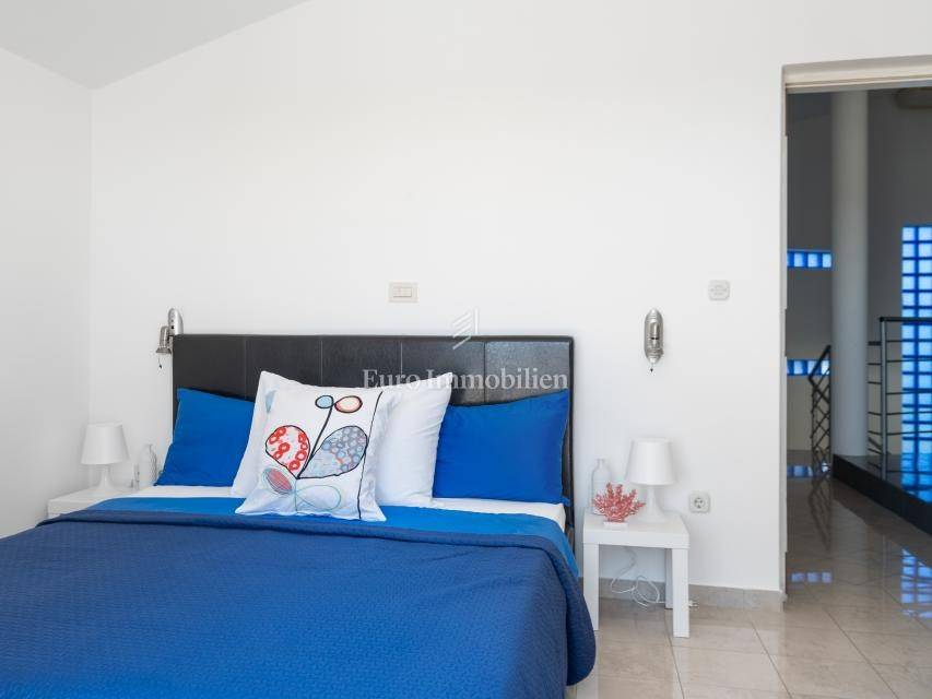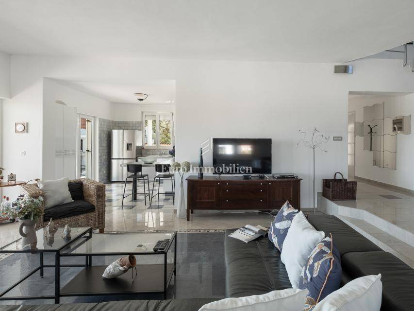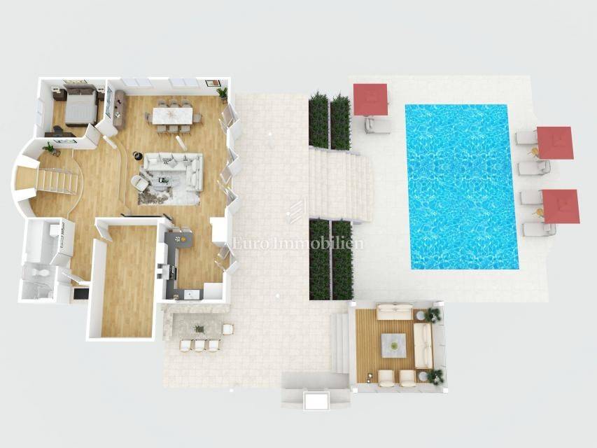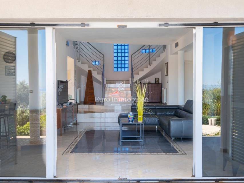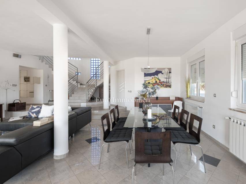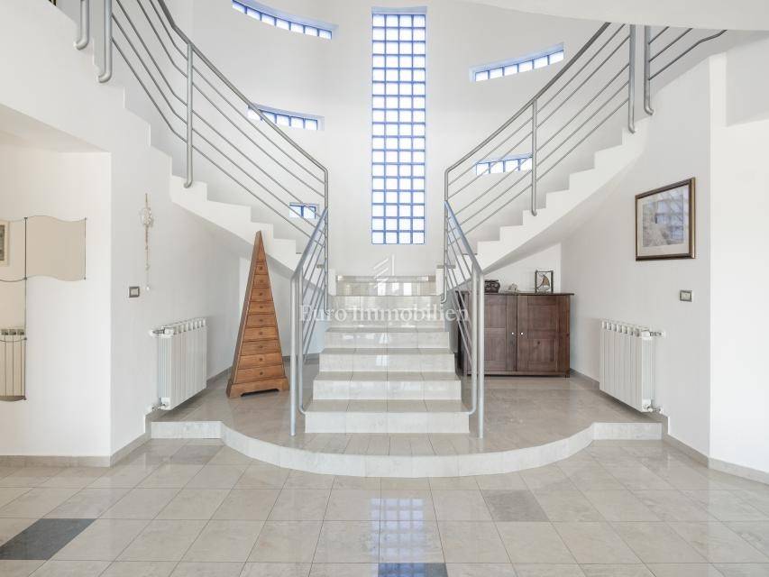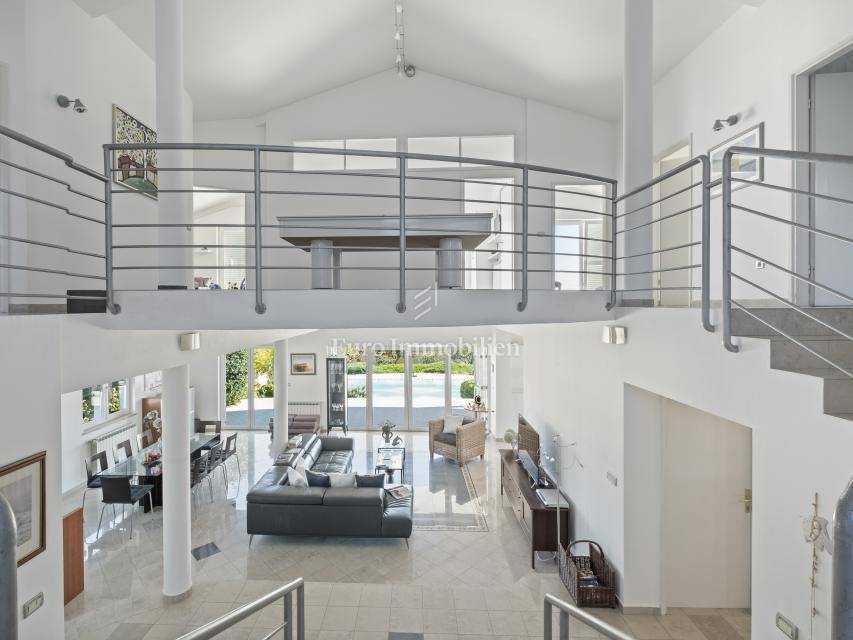 The land area totals 1,836 m² and includes a 60 m² swimming pool on two levels with a spacious sun deck. A solar power system is installed on the roof.