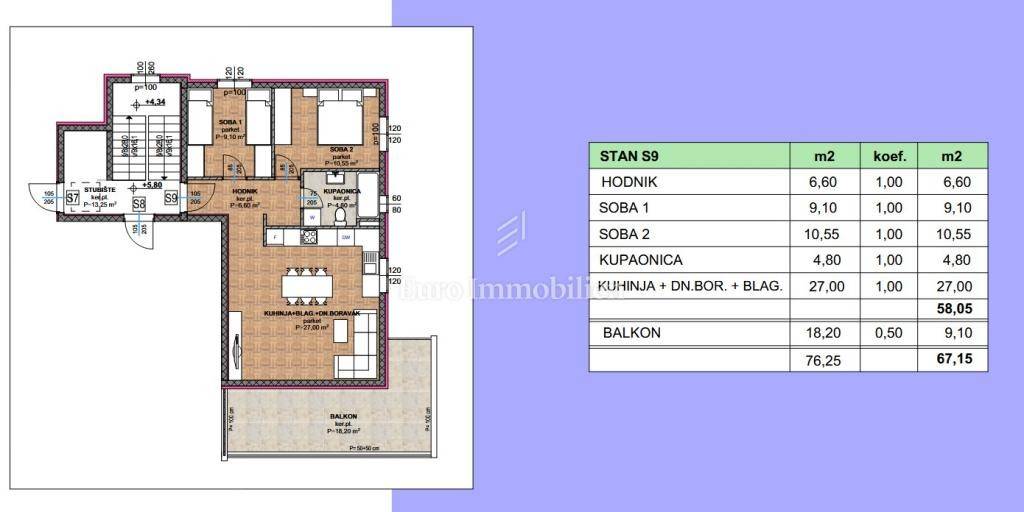 L’appartamento S9, di superficie totale 58,05 m², si trova al secondo piano ed è composto da due camere da letto, cucina con zona pranzo, soggiorno, bagno e un ampio balcone di 18,20 m² (superficie calcolata 9,10 m²), con una splendida vista sul mare e sulle isole.