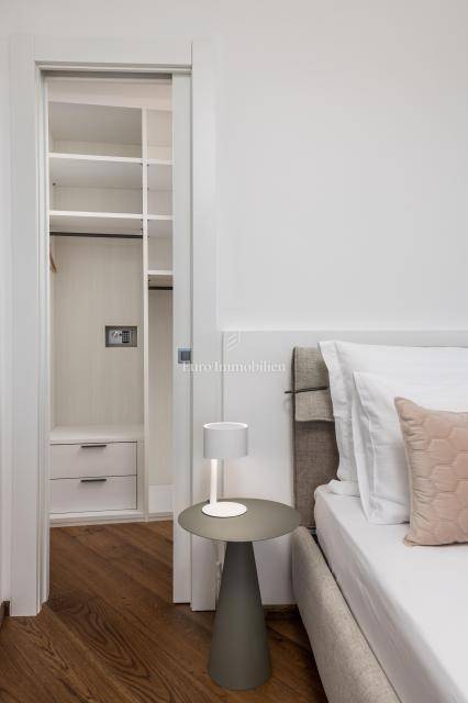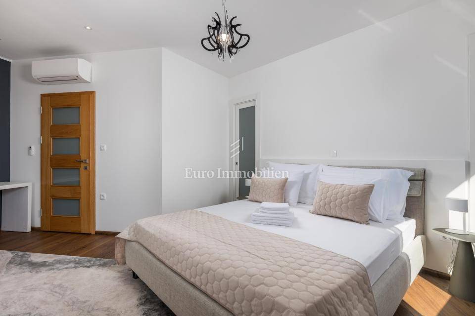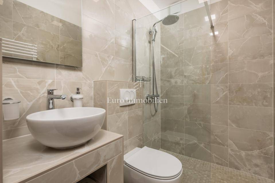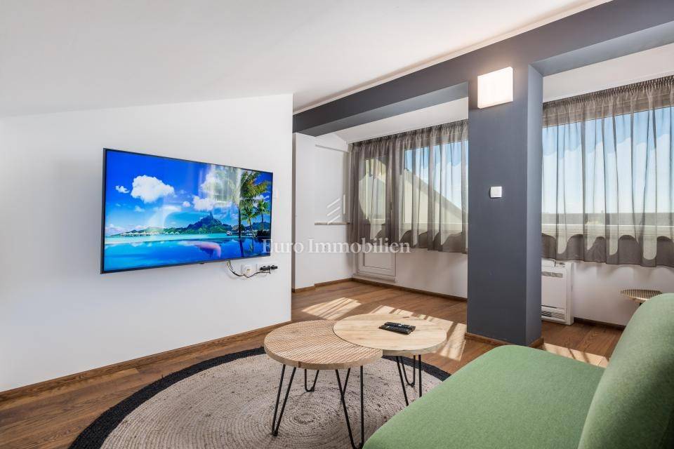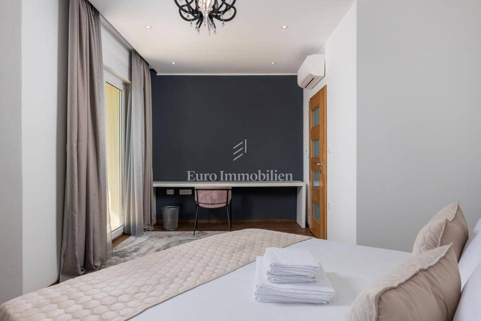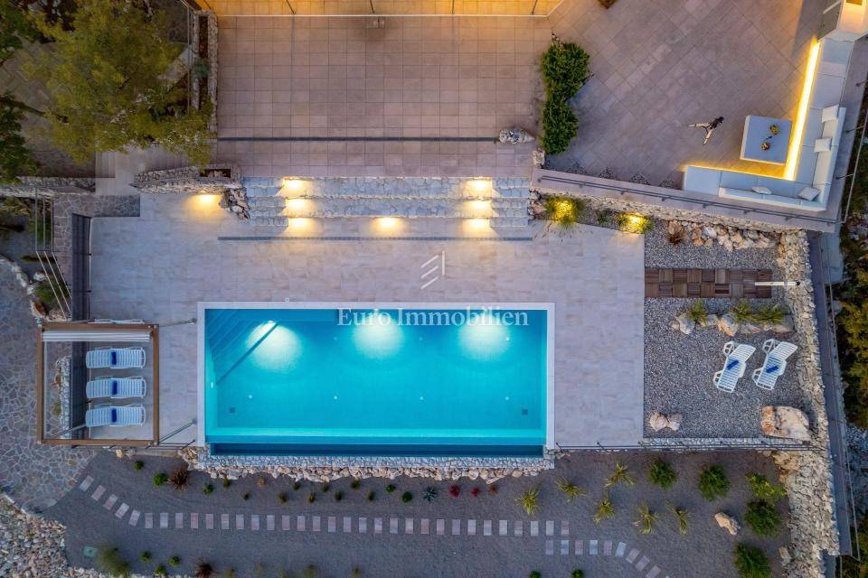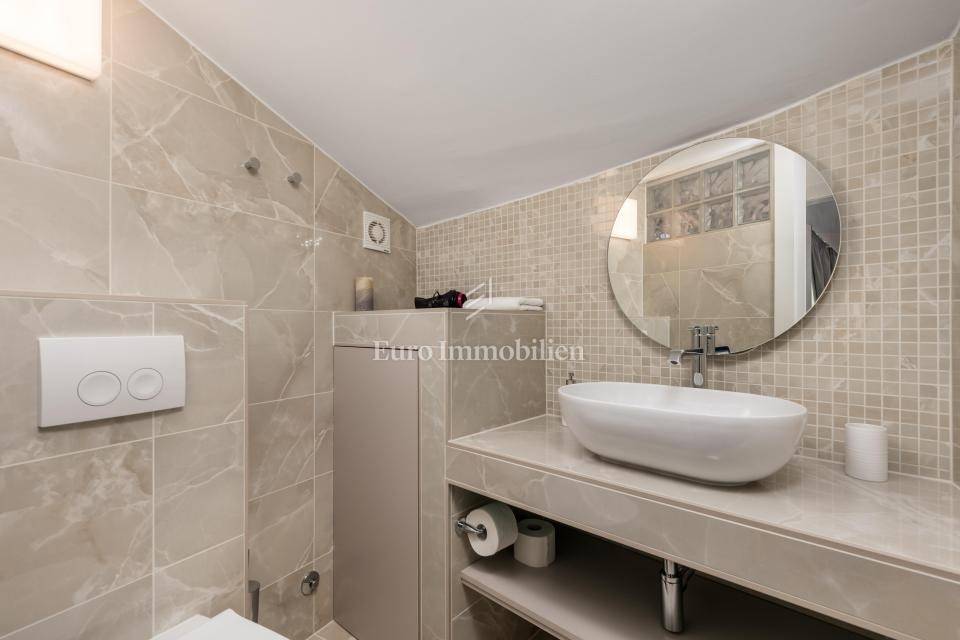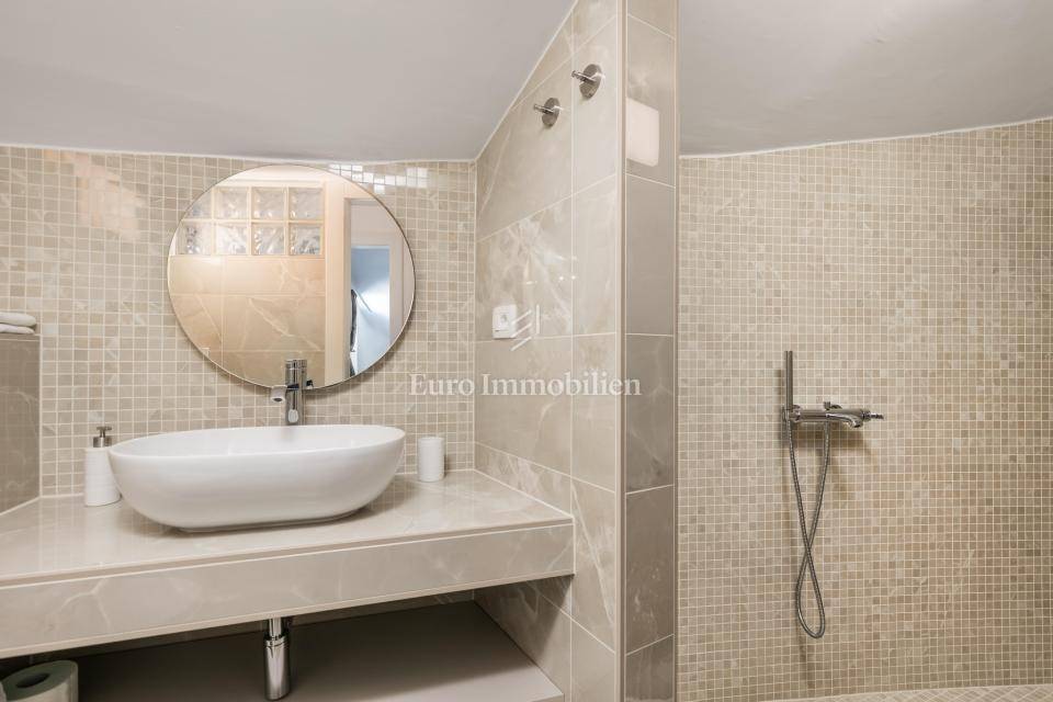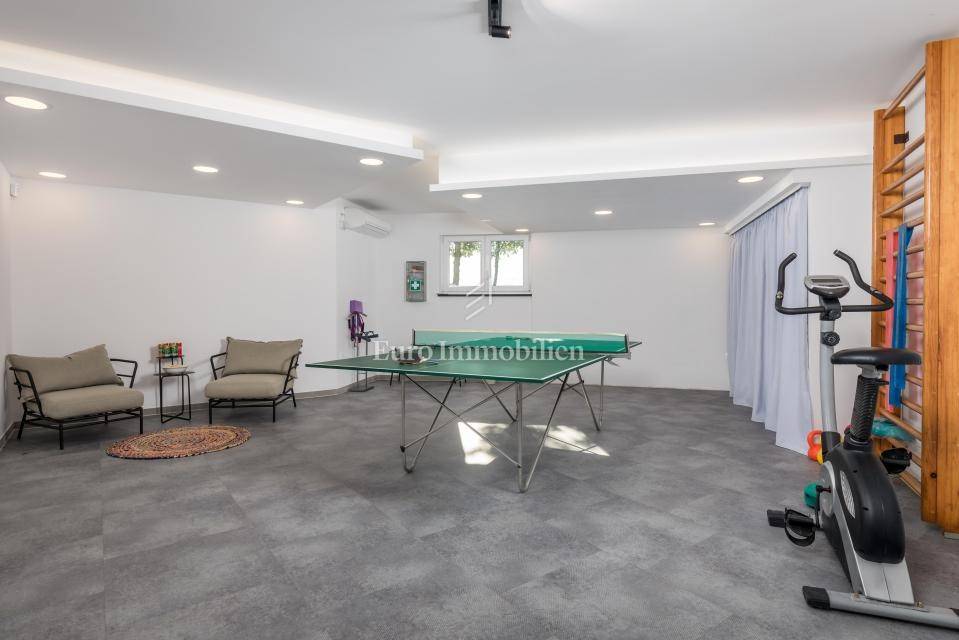 Ground floor - one-bedroom apartment with a living room separated from the second part of the ground floor, which has a summer kitchen with a dining room that leads to a terrace with a swimming pool and a lounge area. The entire ground floor is oriented to the south.